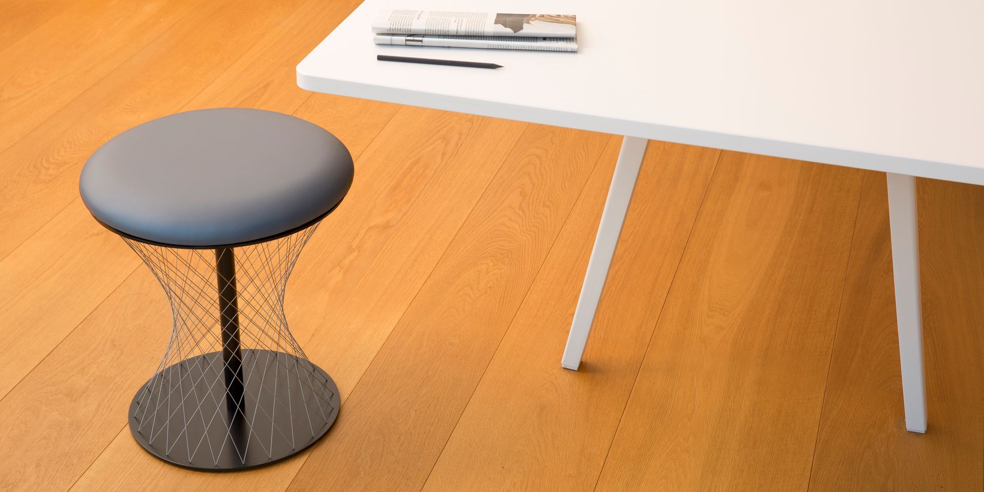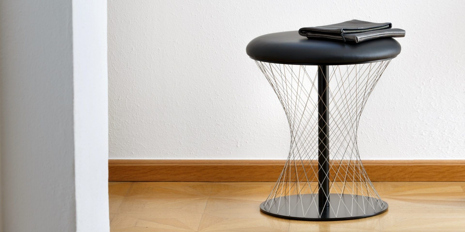 Inspired by his visit of the observation tower on Killesberg in Stuttgart, Christian Stoffel designed the furniture series NETWORK. The characteristic rod is placed in center of the design, but thanks to its delicacy recedes into the background. All of the structure’s surface is powder-coated in matt black, emphasizing the finely woven wire mesh. The bright diamond knotted net from stainless steel provides the design with stability and its unique waisted form. Timeless tabletops form polished marble in different variations elegantly complement the side table.