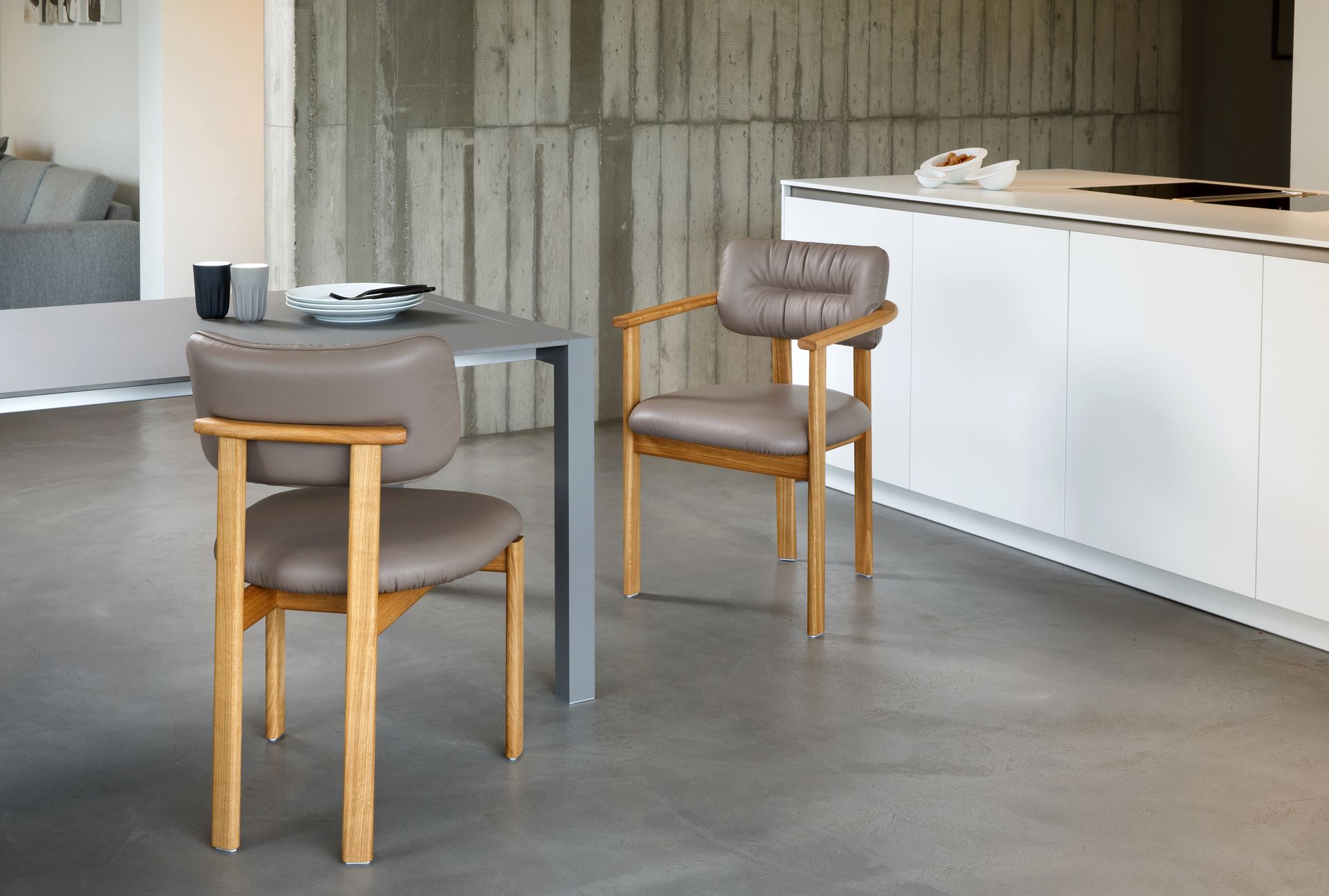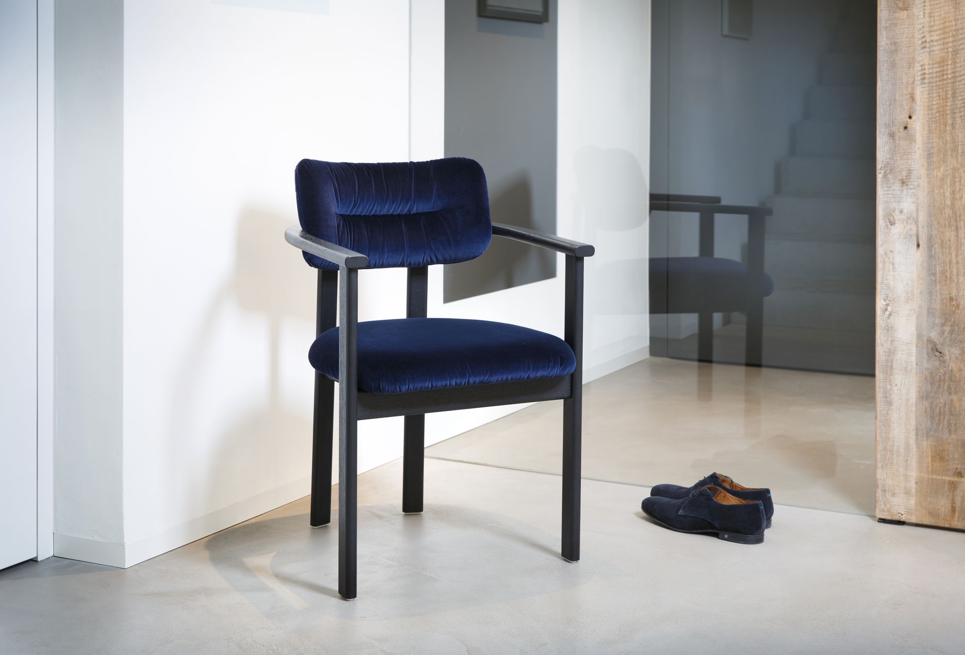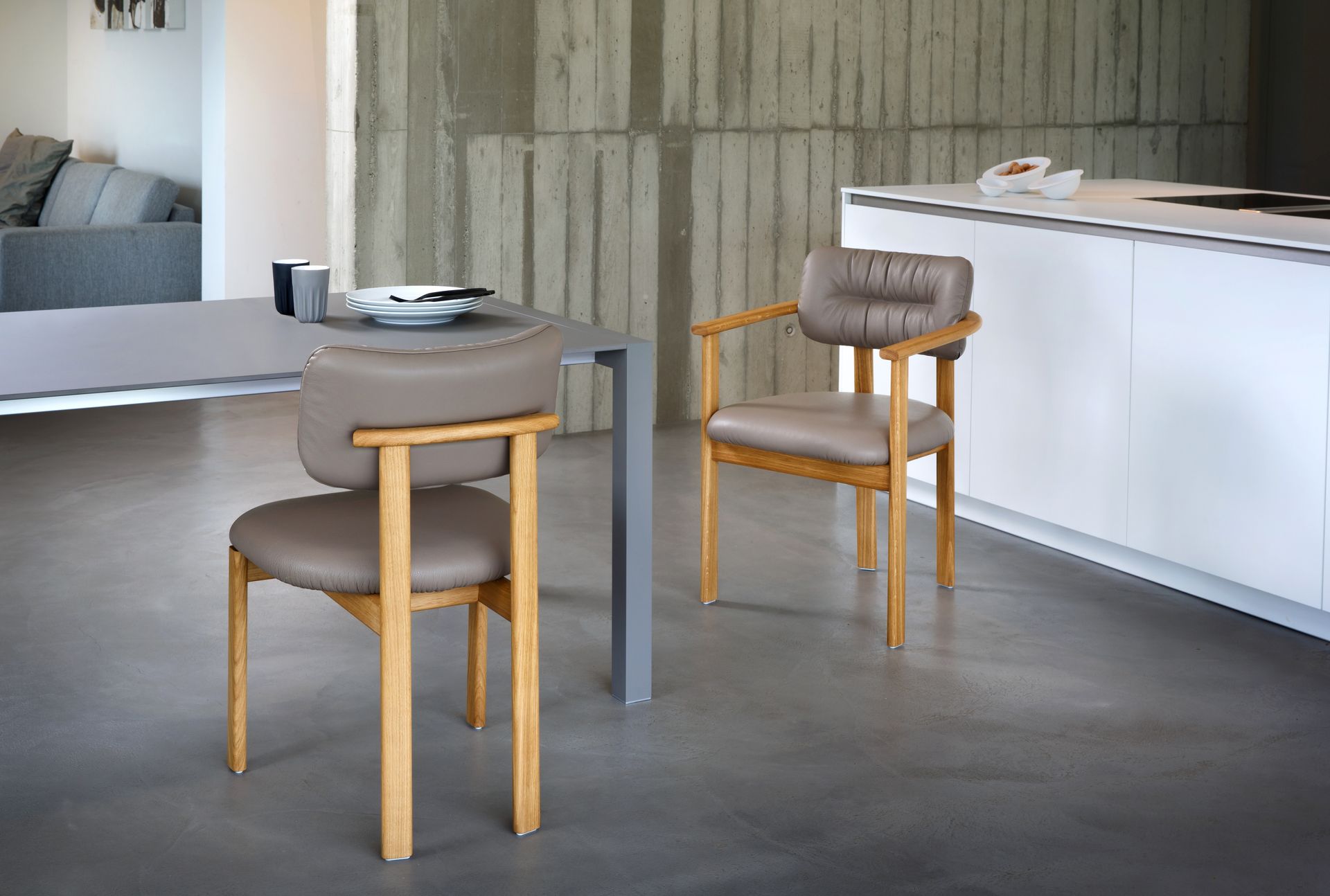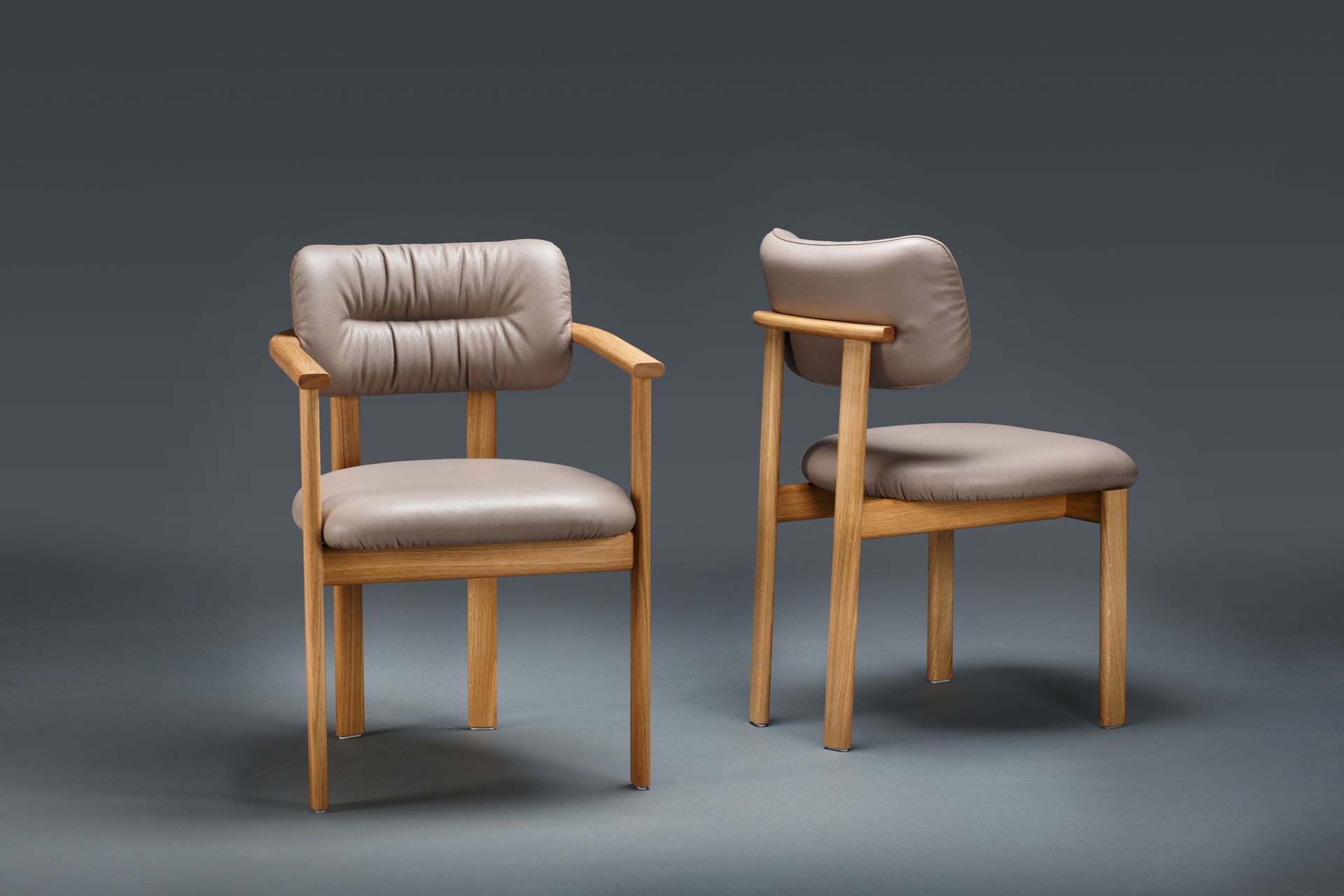 PILLAR chair by designer Martin Hirth embodies formal effortlessness, concise design and the highest level of sitting comfort. With its harmonious radii, the chair frame’s delicate lines provide a haptic experience and reveal its detailed workmanship. The solid oak frame is available with and without armrests as well as an oiled or black-stained surface. Thanks to the unique back rest, PILLAR receives its distinctive appearance. It hugs the body like a soft pillow and captivates with intricately sewn ruffles and concise drapery. The seat and back rest are upholstered with high-quality fabrics or leather and provide a particularly comfortable seating experience for many unforgettable hours.