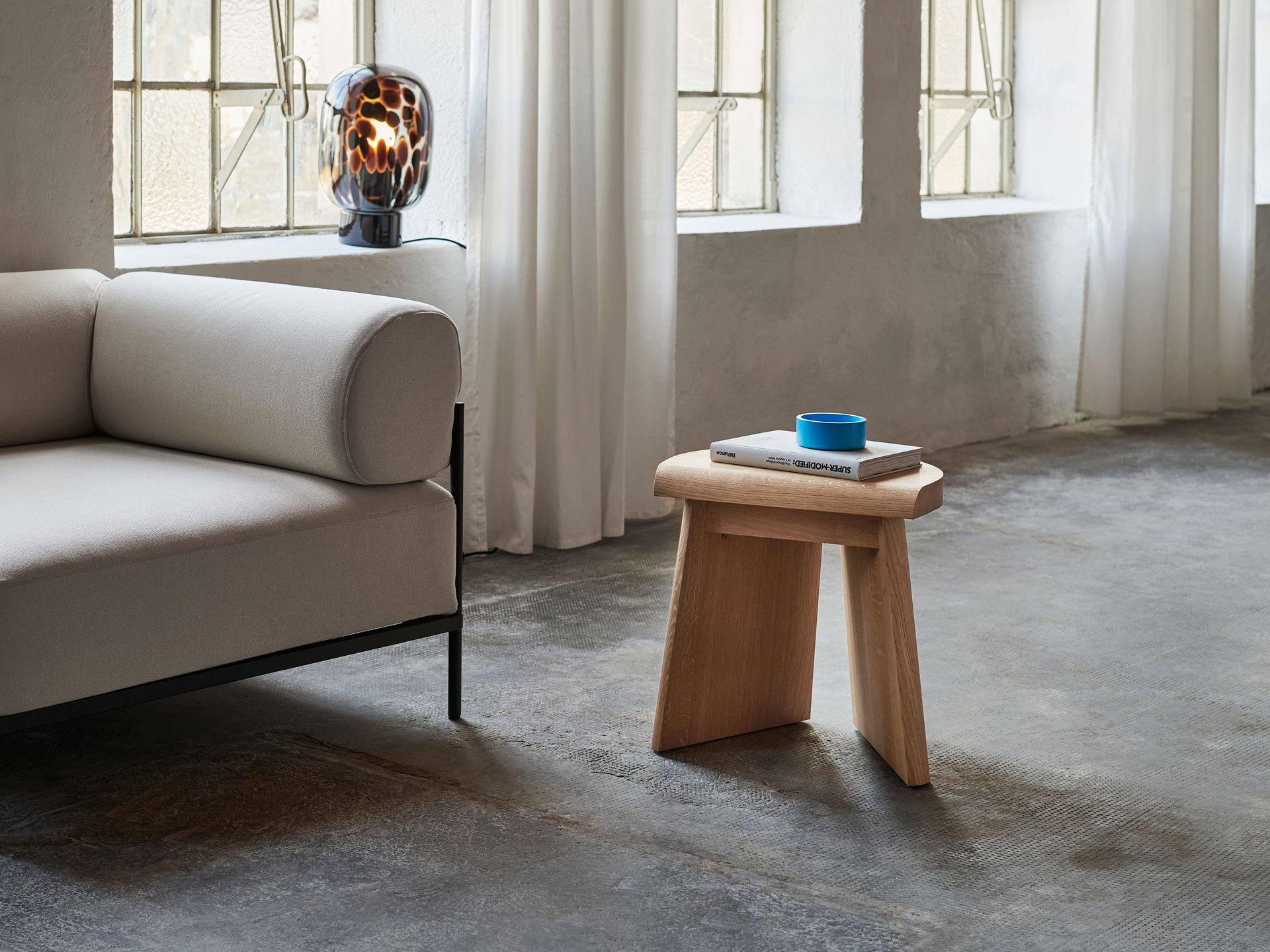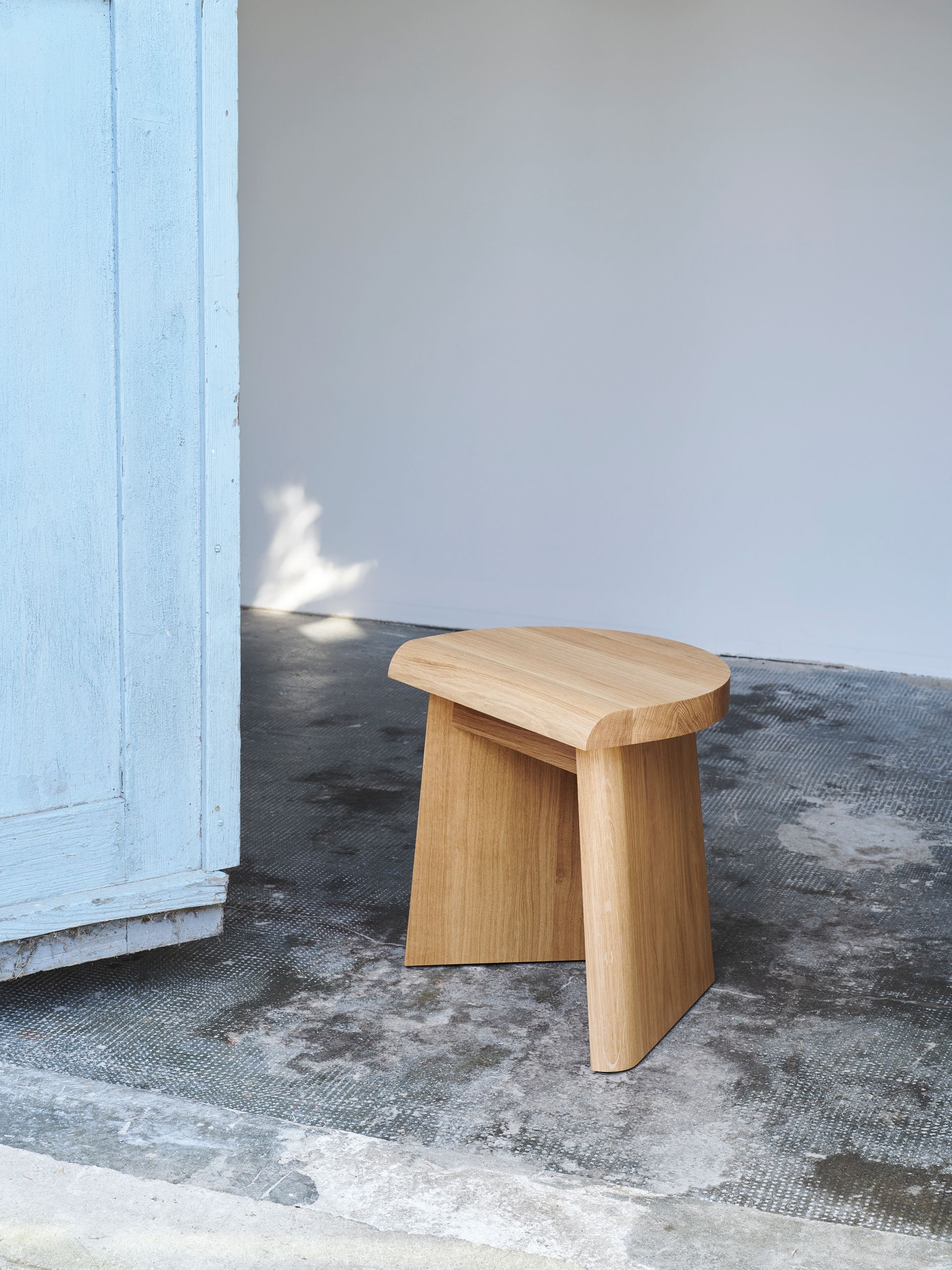 PORTAO by Christian Haas is a stool with a distinct sculptural appearance. Its nuanced design centers on the shape, making the stool an object with a strong character. The monolithic appearance of the piece is underlined by the use of solid oak processed to a high standard. The tapered stool legs as well as the seat are significantly rounded on the front sides, giving a pleasant feeling of softness and offering comfortable seating. PORTAO convinces with its presence in a room, it can also be used as a side table and is available in oiled or black stained oak.