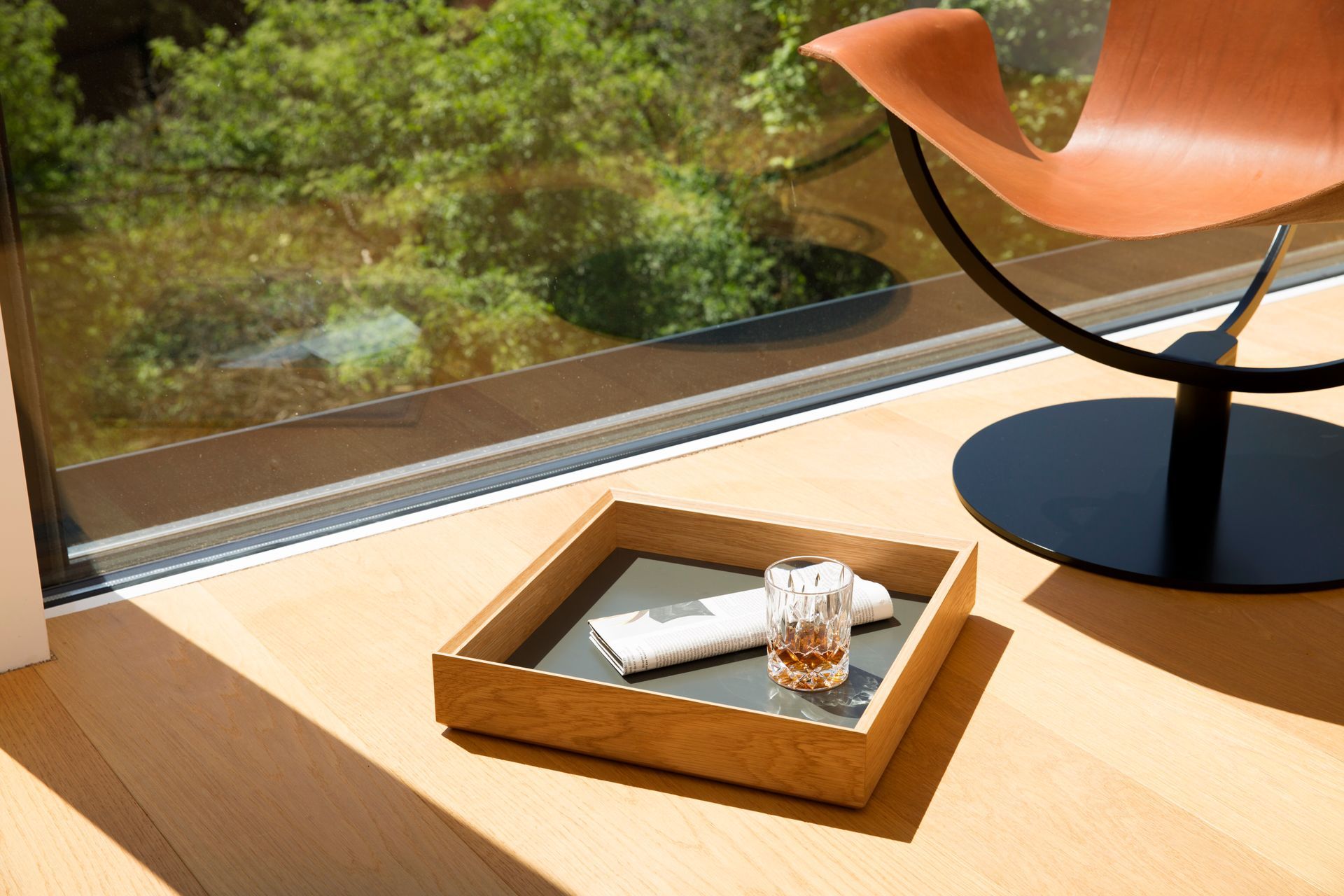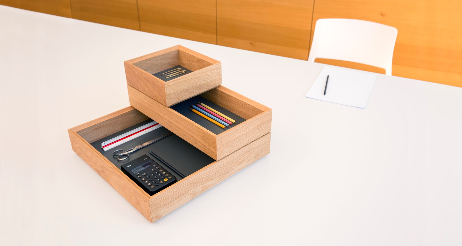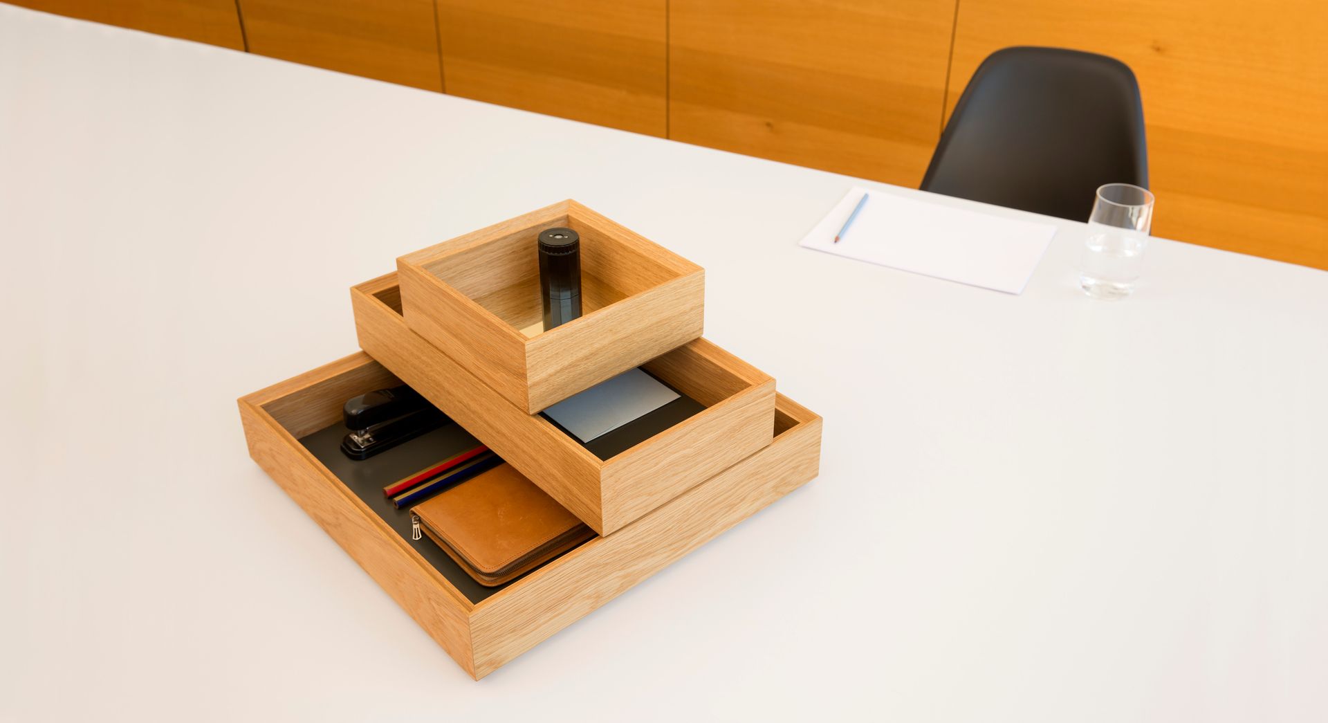 The tray set TIDY helps to save space and avoid clutter. With its linear design, the versatile accessory can be used individually as a tray, in combination as storage for the living area, for cosmetics or for keeping a tidy desk. Available in three sizes, the modules are made out of mitre-jointed oak. Due to their particular profile they slide inside the respectively bigger module for easy access. The inner bottom of the tray is made from matt powder-coated steel. The smallest tray is optionally available with a highly polished brass bottom. With time, the untreated brass surface will develop a special patina unless treated with a suitable care product. TIDY is available as a set of three modules or as a set of the two smaller trays. The biggest tray is also available separately.