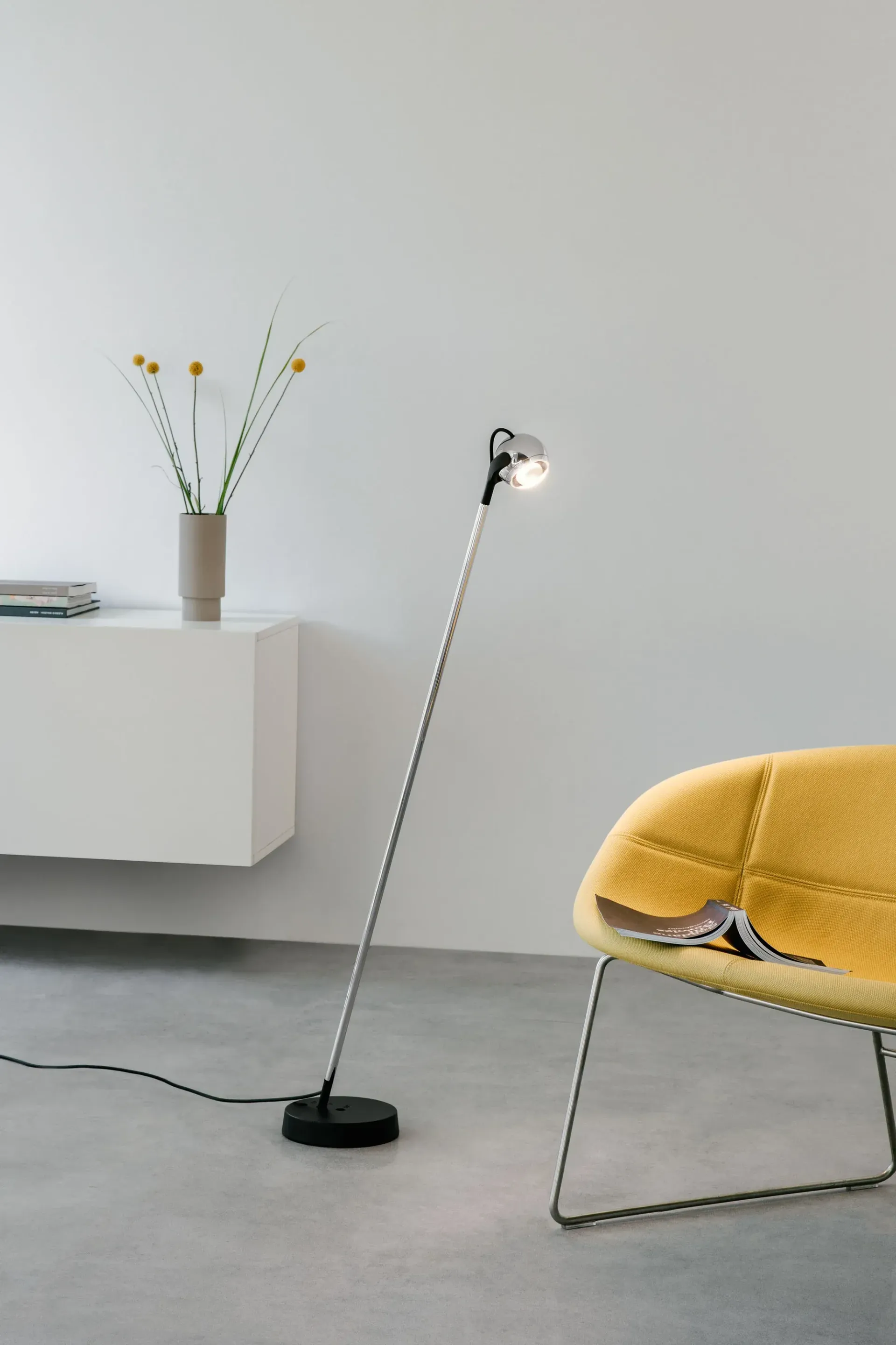 Falling Star Floor is lightness and playful flexibility. Its movable luminaire rod and three different base holes, allow free experimentation with lighting effects and angles.