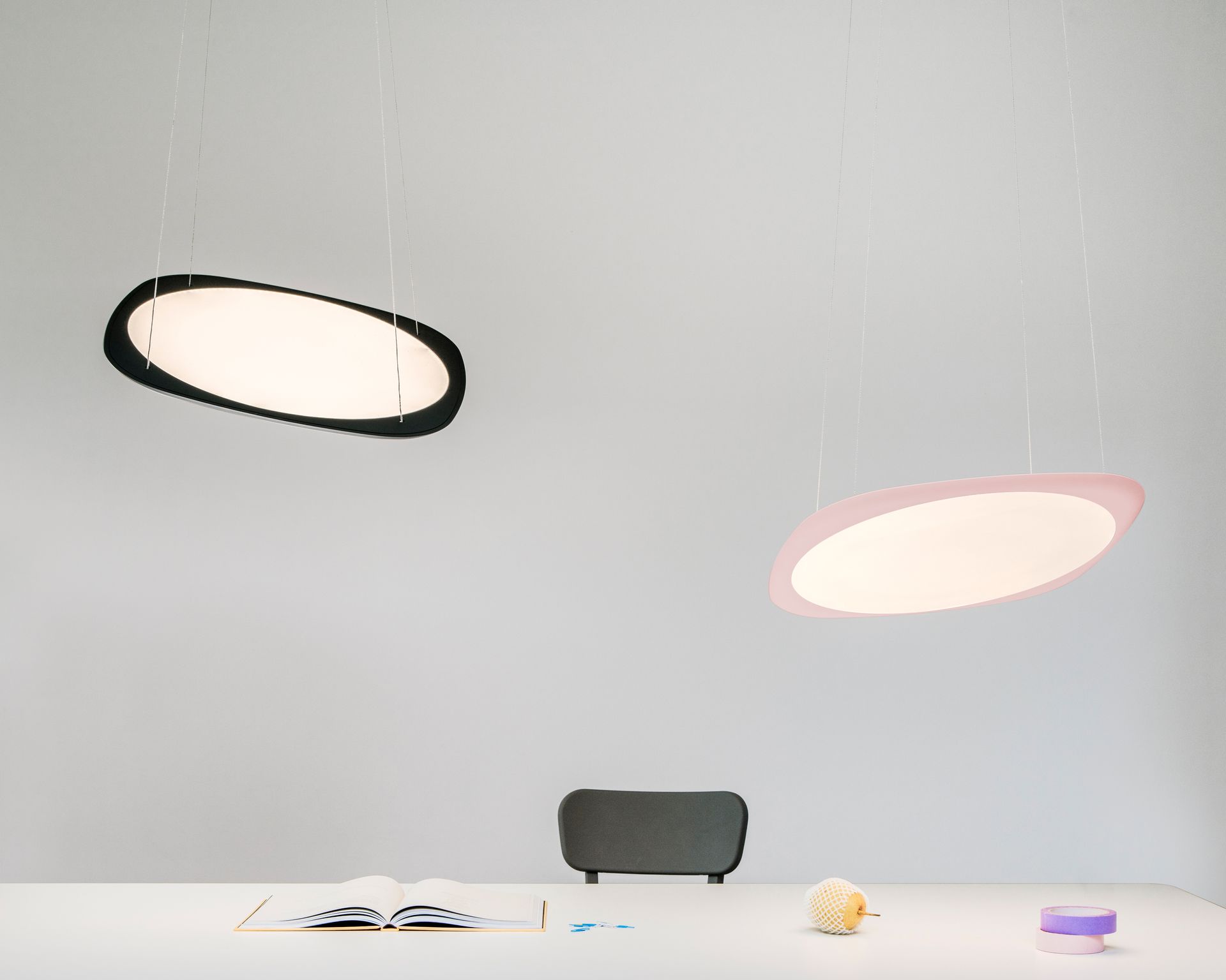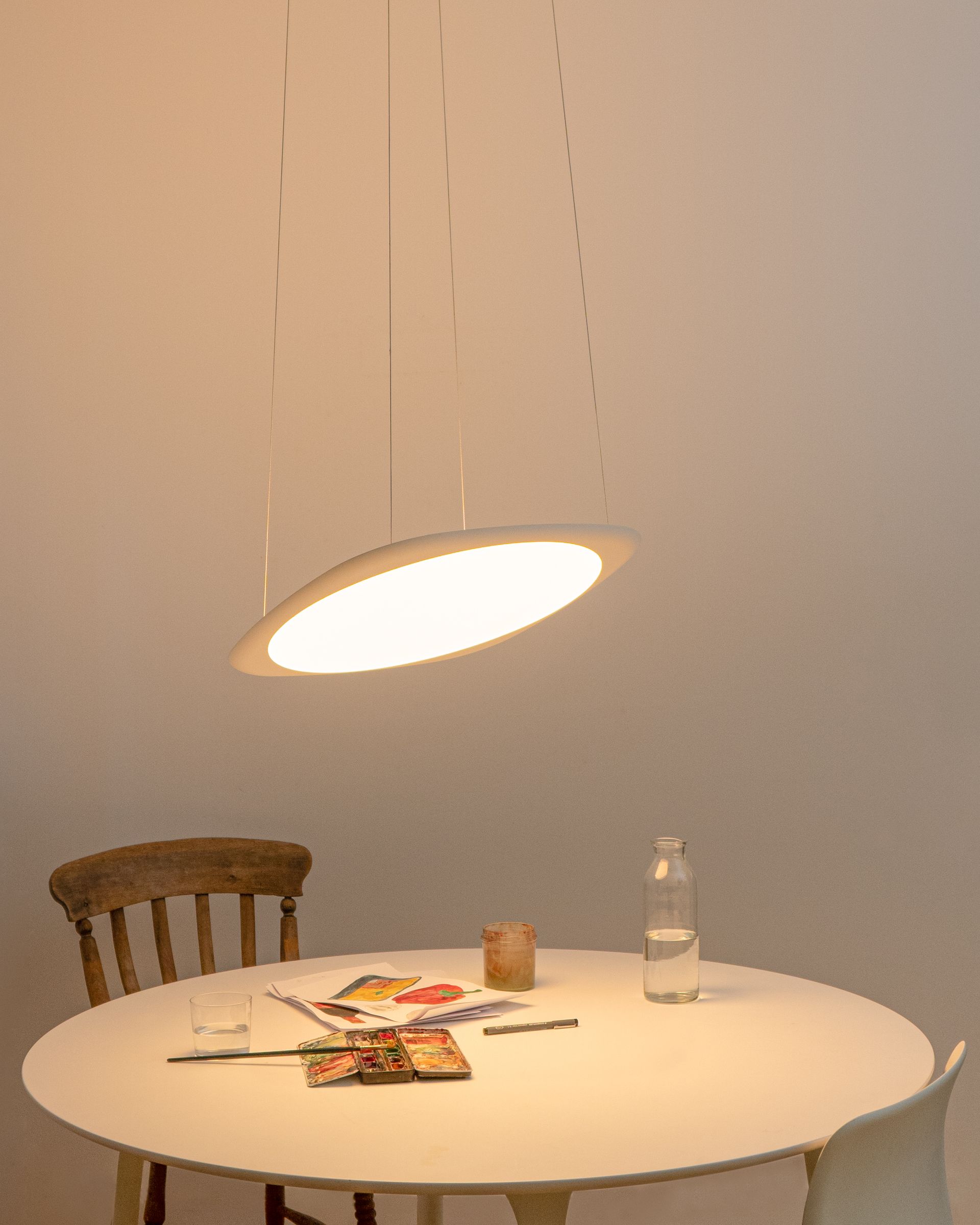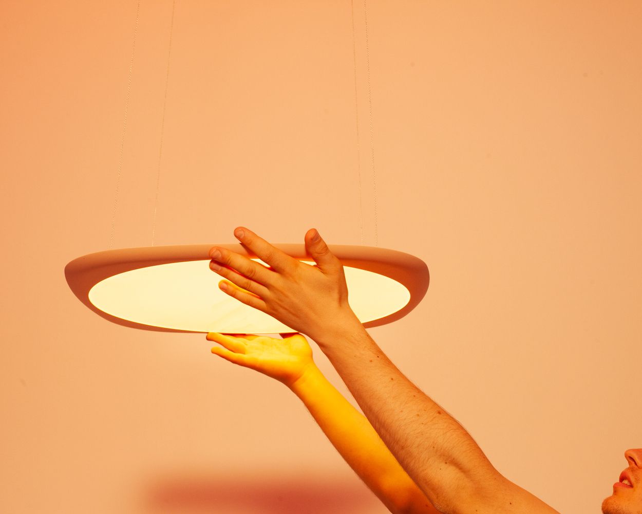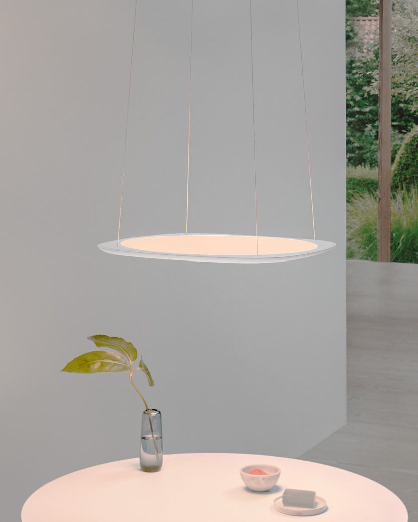 A floating disc that suffuses your space with light. Flying is a flexible delight, adjustable in height, angle, brightness, colour temperature, and light distribution.