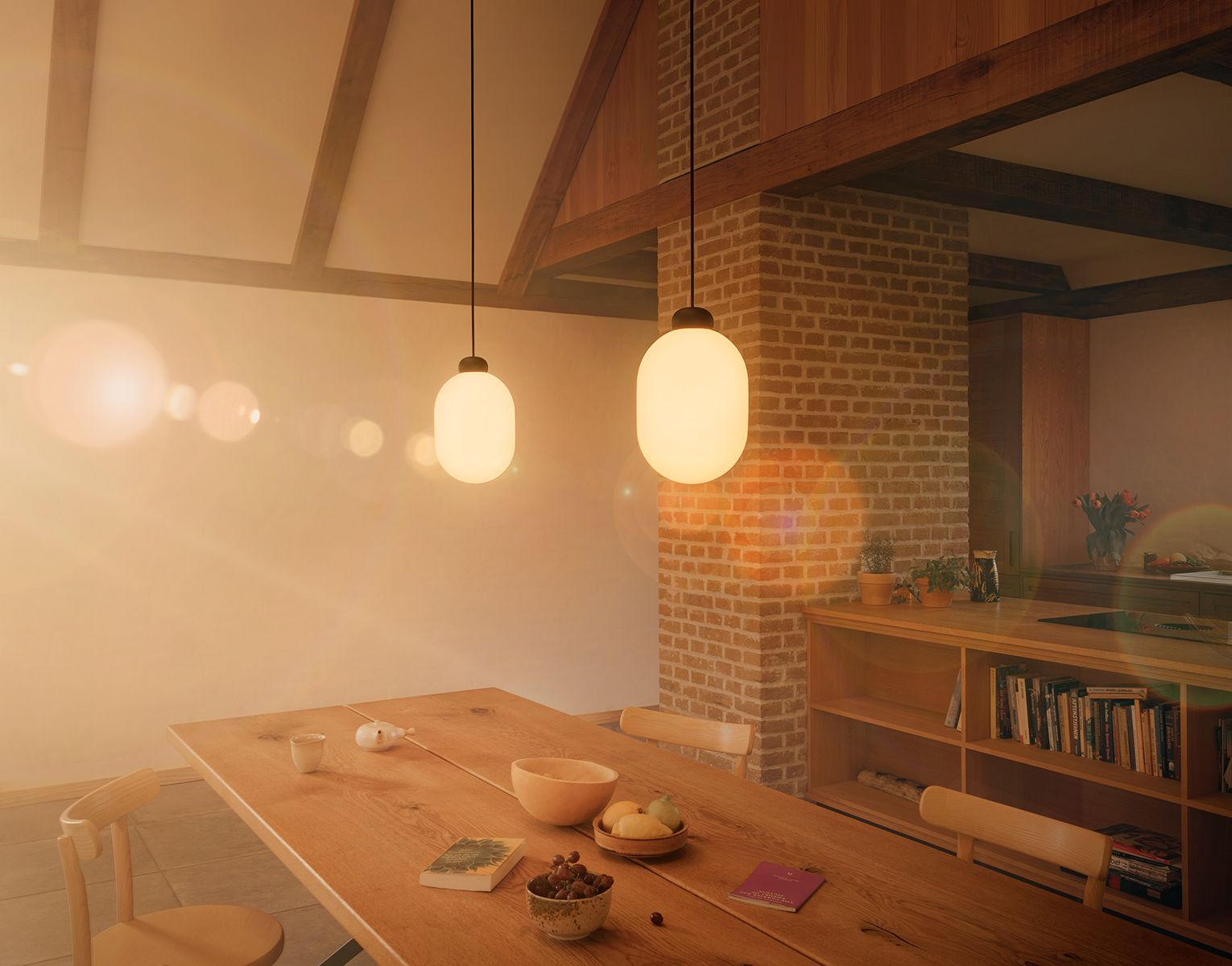 Sun Duo brings the sun above your table. The sensual Ambient light made of hand-blown glass transforms the whole room. With its sculptural form and light feature Sunset Dimming, Sun Duo plays on the broad spectrum of the sun.