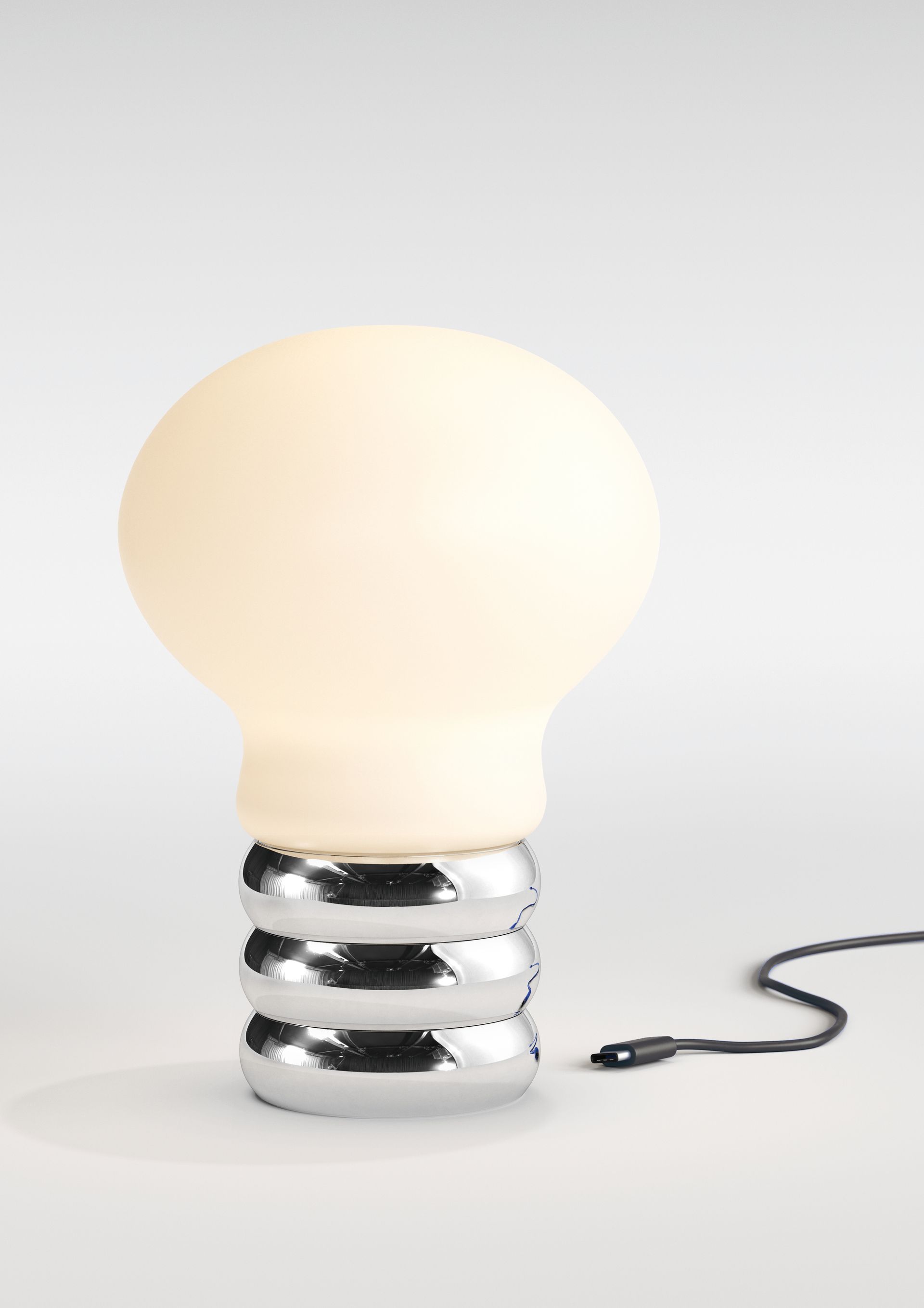b.bulb is the new member of the Ingo Maurer Bulb family. Based on the world-famous design from 1966, the Ingo Maurer team developed a smaller portable version with rechargeable battery. Light to go: the mobile Ingo Maurer lamp accompanies its owner to any place. The b.bulb lamp without cable is perfect to take from one room to another or even outside for a picnic or on the balcony for a barbecue. However, it is not suitable for permanent outdoor use. Rechargeable via USB-C technology. Metal, glass.