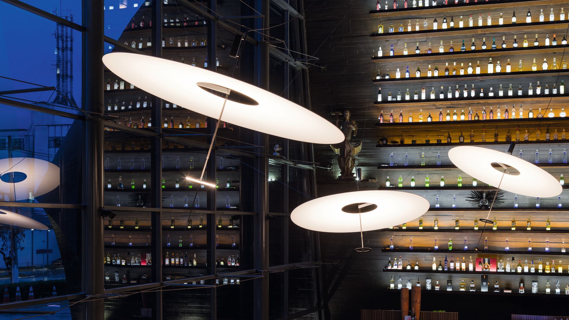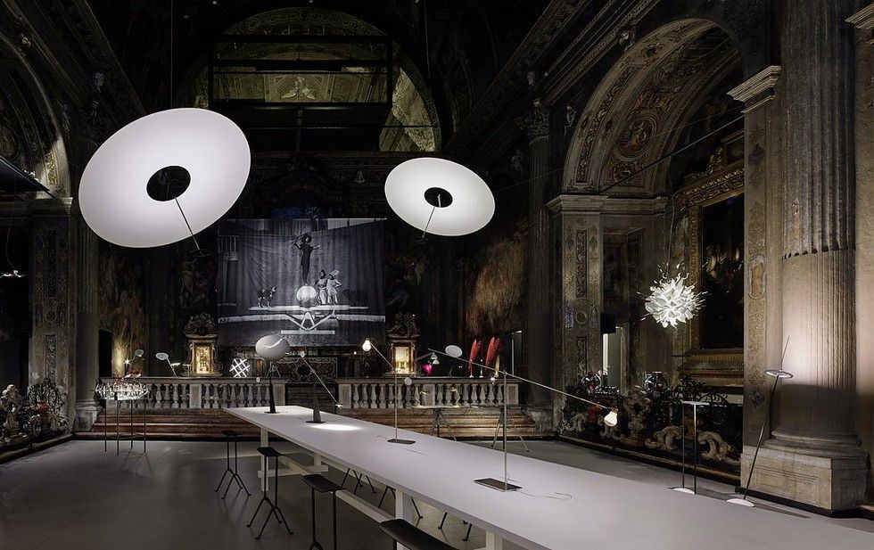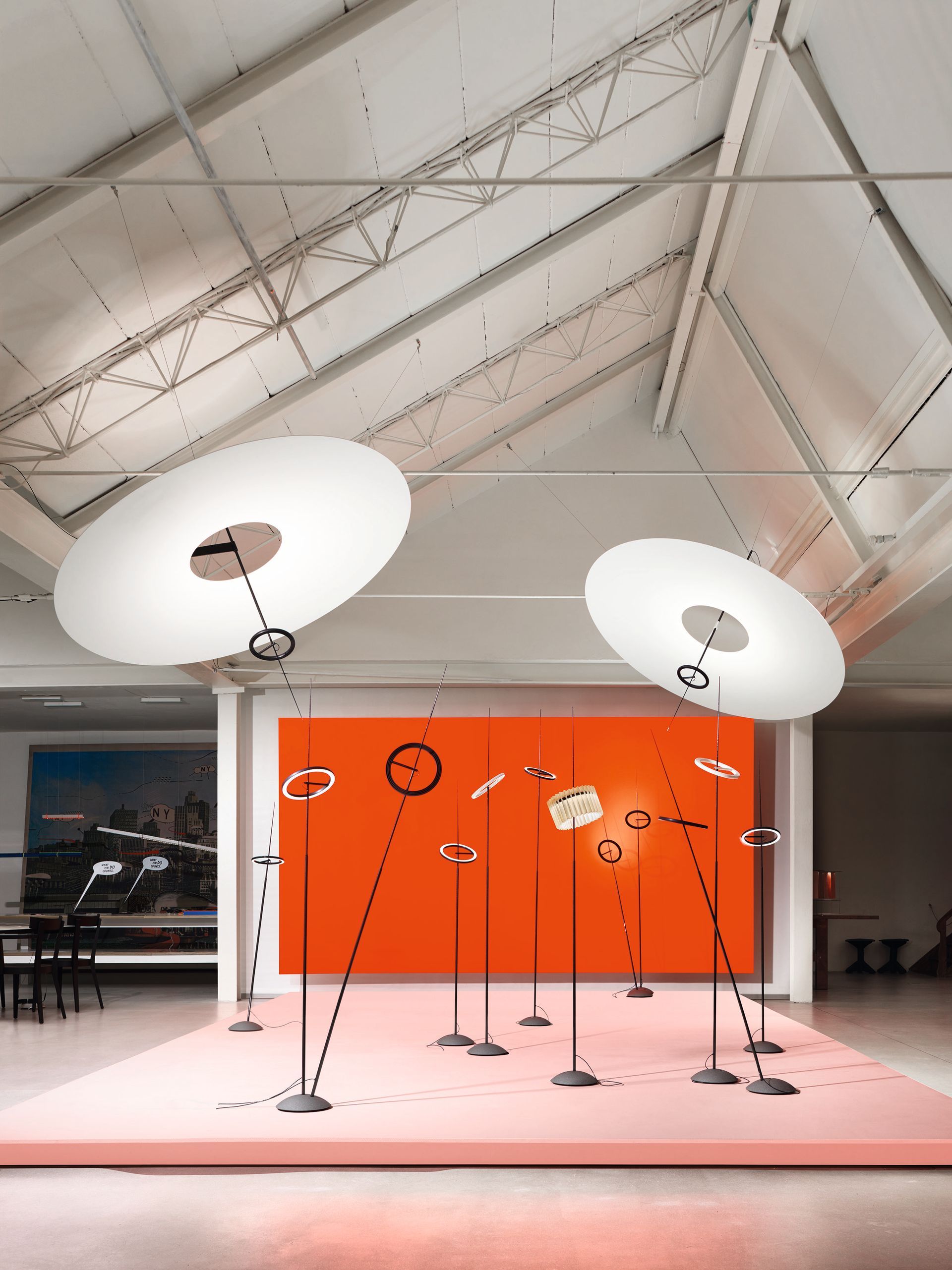 Flying Disc is based on the floor lamp Ringelpiez, which Ingo Maurer first presented at light+building, Frankfurt in March 2016. Two prototypes of the suspended object were presented in Milan at San Paolo Converso, a former church which is now used for exhibitions. Five Flying Disc were installed at Hotel Unique Sao Paulo in 2016.
