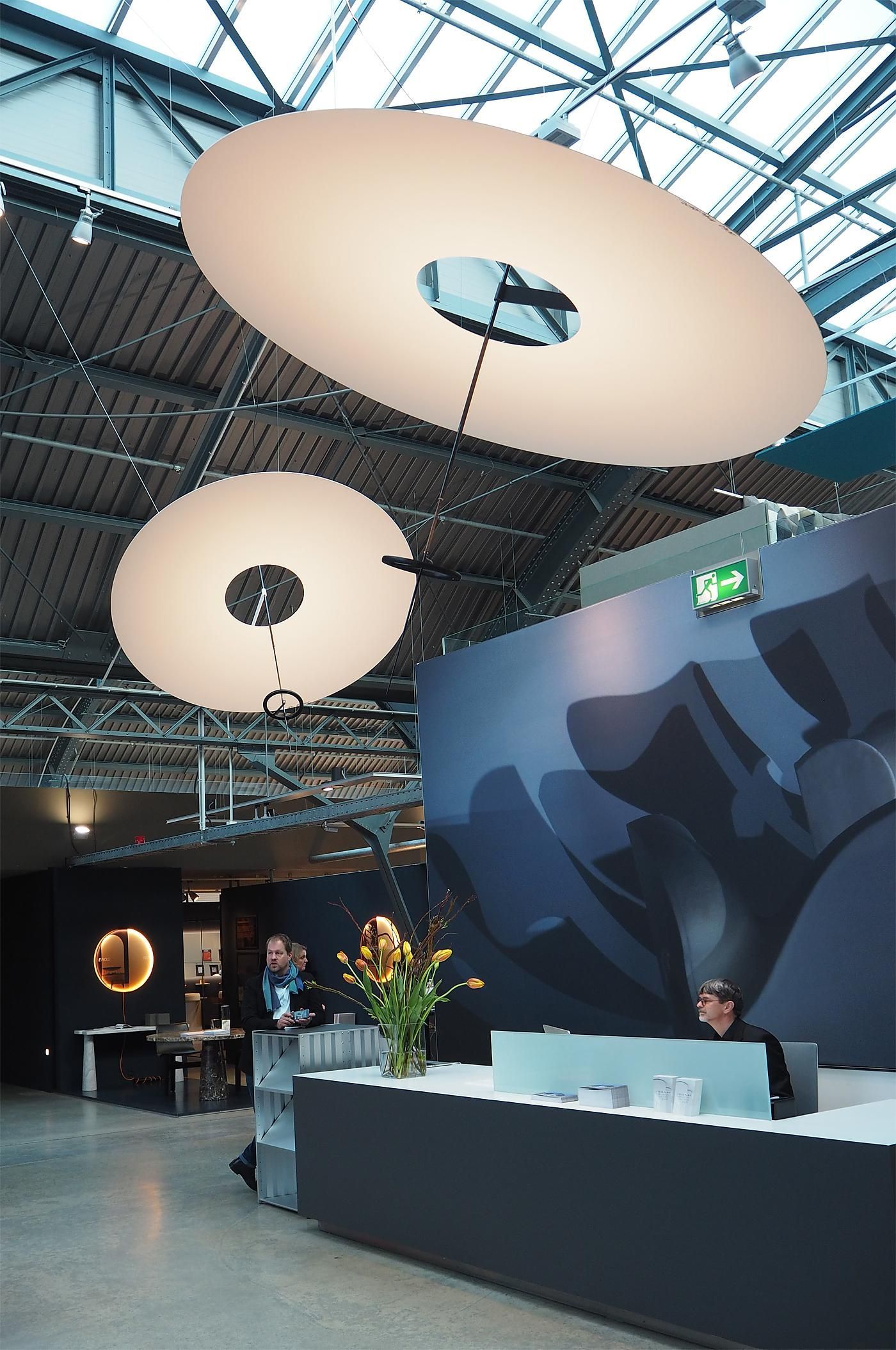 Flying Disc is an extremely light-weight object for indirect lighting. Attached with thin wires, it seems to hover below the ceiling. Suspended from only three wires, it is meant to be installed with a certain angle, to add dynamics to the space. The thin white disc is lit up by a ring of high quality LEDs, diffusing the light. A long slender black rod holds the LED ring below the disc. Both length of the rod and the angle of the ring are adjustable, so that it is possible to light up the diffuser disc asymmetrically. All three parts, the disc, the rod and the ring visually merge to an intriguing graphical object. Materials: Glasfibre, carbon fiber, metal, plastic.
