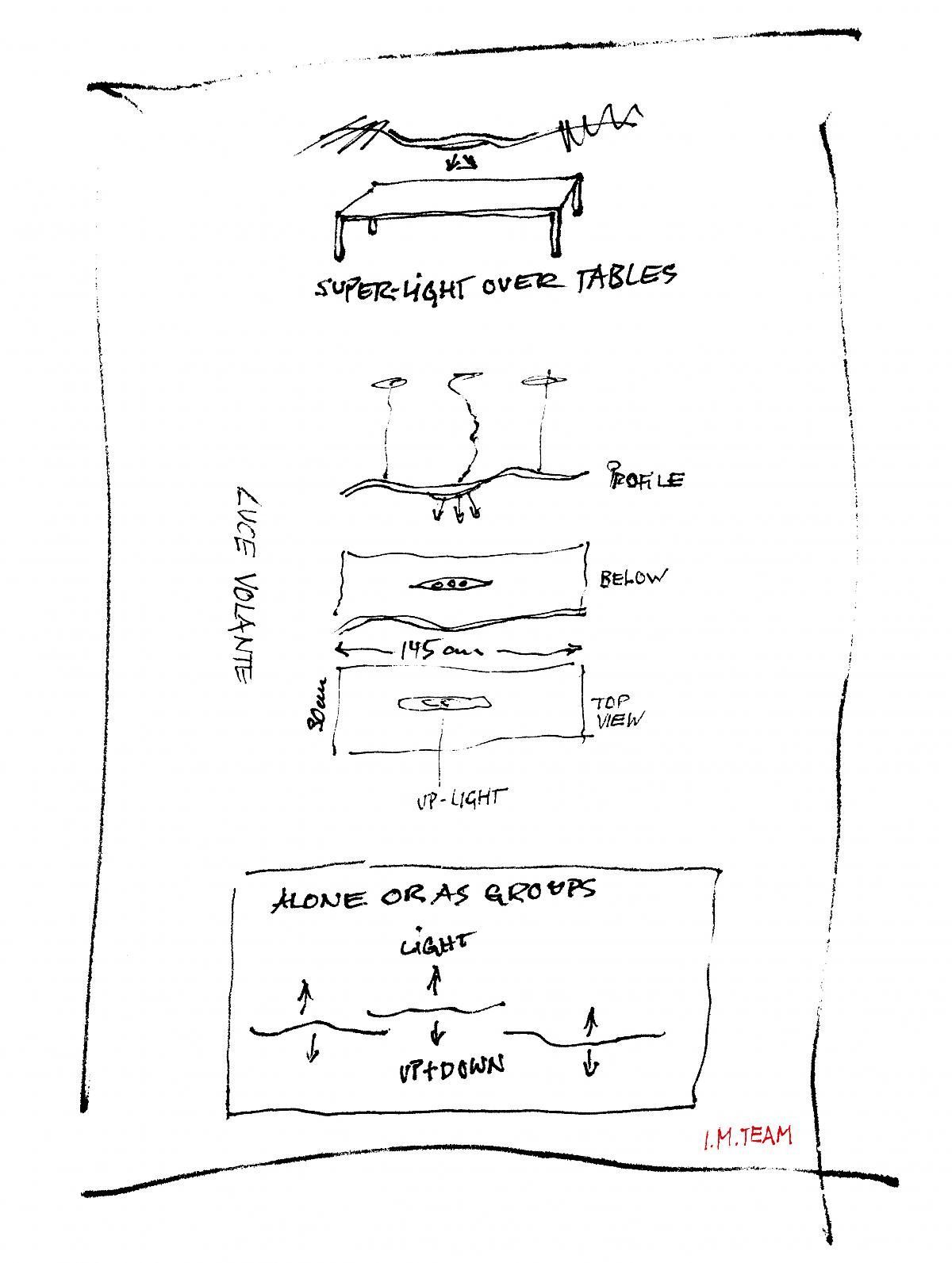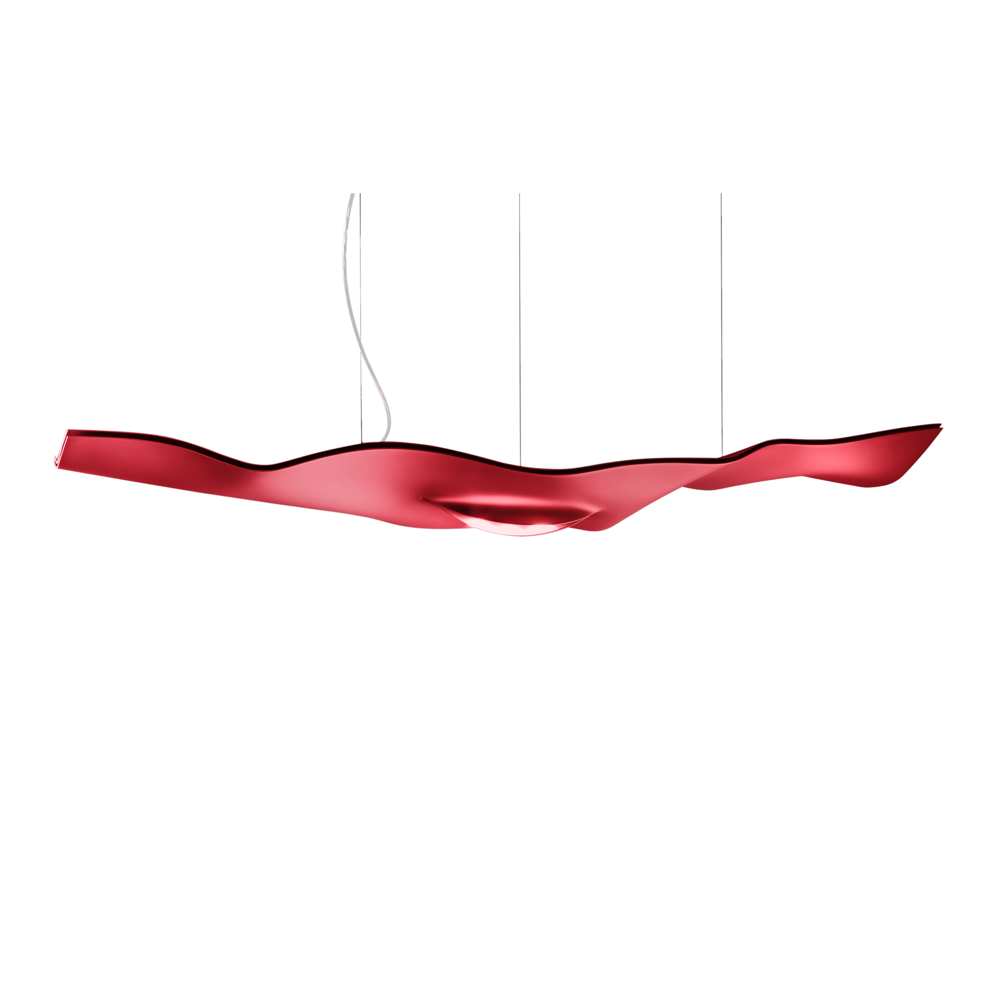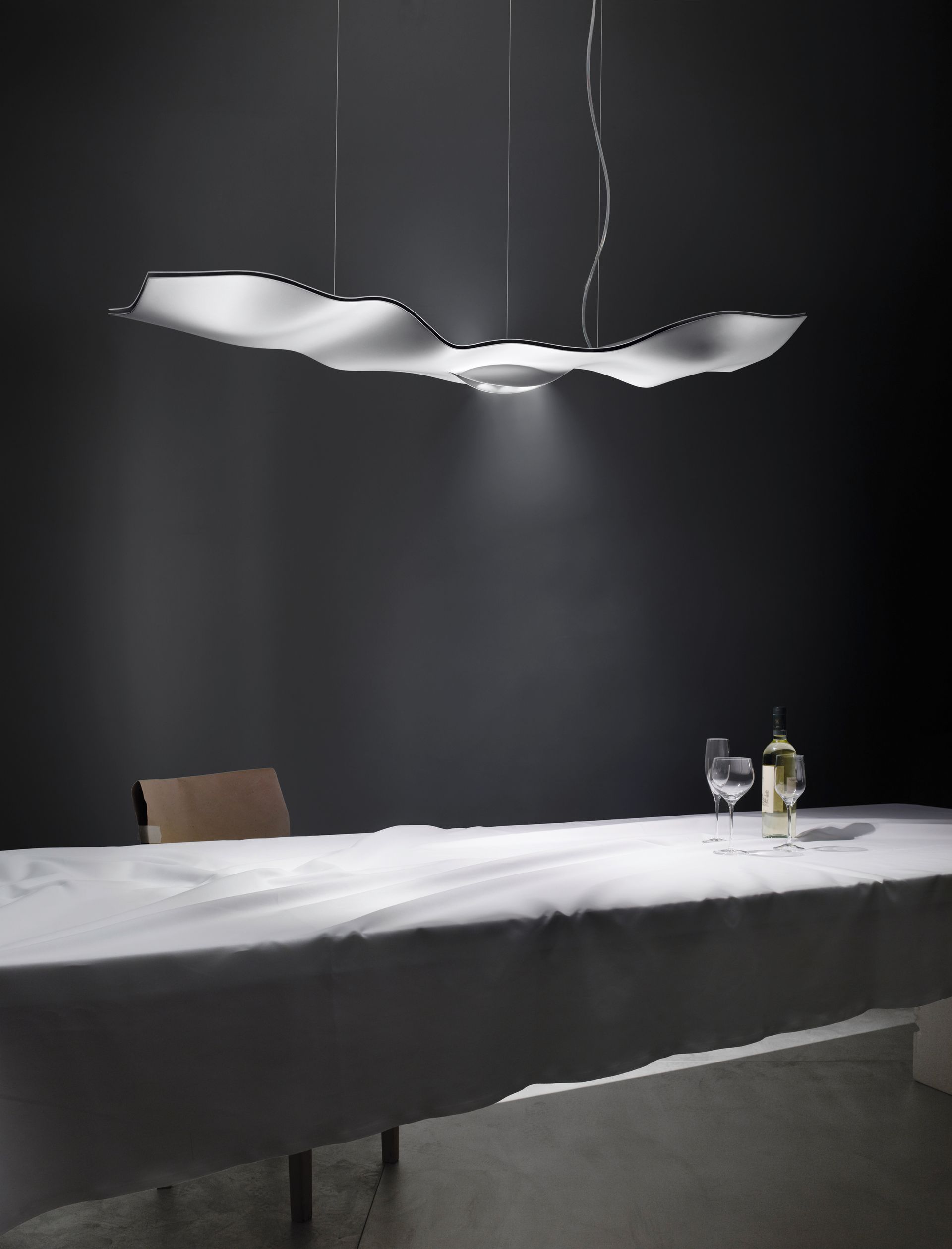 The flat, ondulated light body consists of glass fibre and aluminium. A slot in the lower part makes possible for the downlight to shine downwards in a narrow angle, while a weaker uplight provides a pleasant background illumination. When the light is dimmed, it gets warmer and more pleasant (dim-to-warm). Luce Volante is discreetly suspended on three cables. The electrical cable runs loosely between light fixture and ceiling.