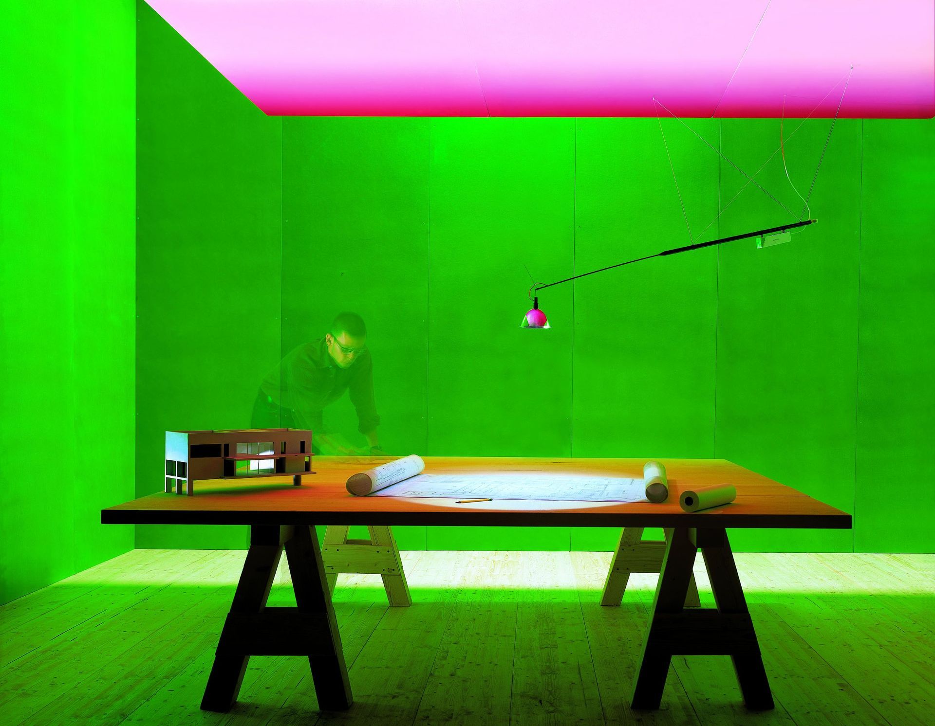 The light shade is adjustable by approx. 180 degrees with a handle and rests on a slender, telescopic, extendable stem which can be turned sideways and tilted to the front. The table and the floor lamps have a ball-joint while Max. Mover is made moveable with the aid of a filigreed suspension on Nylon cables. The electrical cable runs next to the stem.