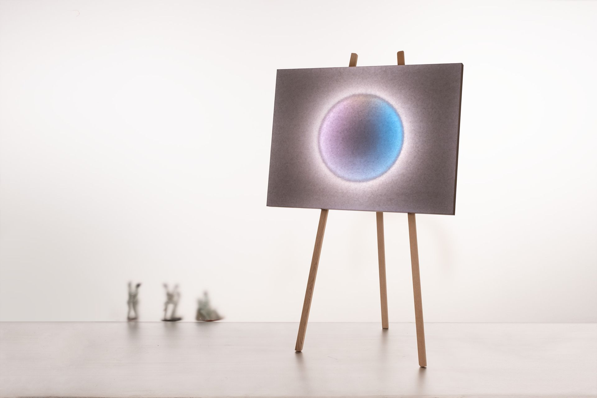 The light gradients shine through the Japanese paper and give the impression as if the designer had painted on a canvas with luminous paint. On the available tripod made of light ash, which is visually reminiscent of an artist's easel, the luminaire takes on the appearance of a free-standing watercolour in a studio.