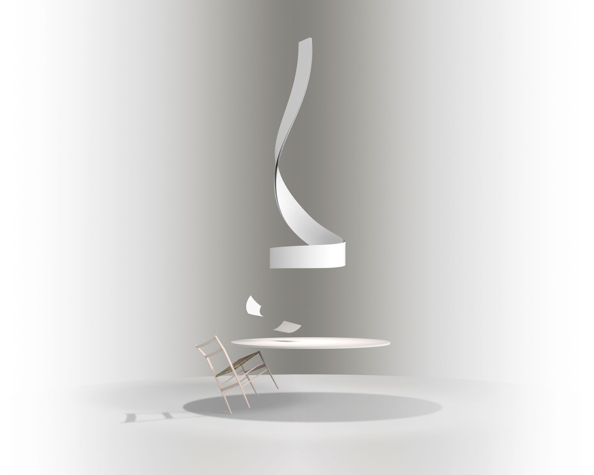 Thin as a paper scroll, Oop'sala curls and unfurls. Carefully selected diodes at the bottom end of the object light the table. Ingo Maurer designed Oop'sala for a round table. Production on request.