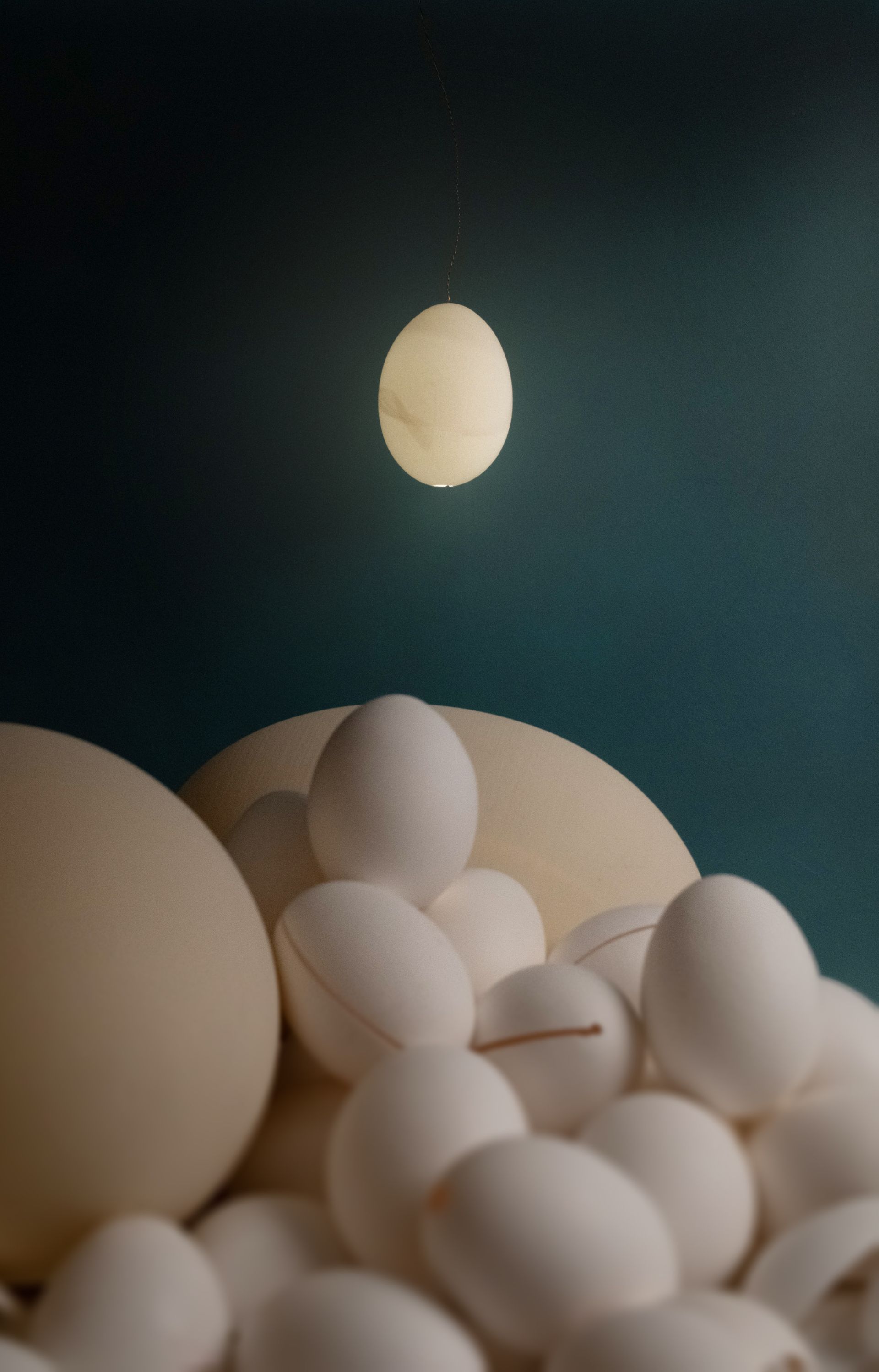 Piero della Francesca, in which a hanging egg can be seen above the depiction of the Virgin Mary. This egg is often interpreted as a symbol of the Immaculate Conception and carries a deeper meaning in Christian art. The Reality luminaire captures the essence of this image and translates it three-dimensionally into the world of design and lighting.