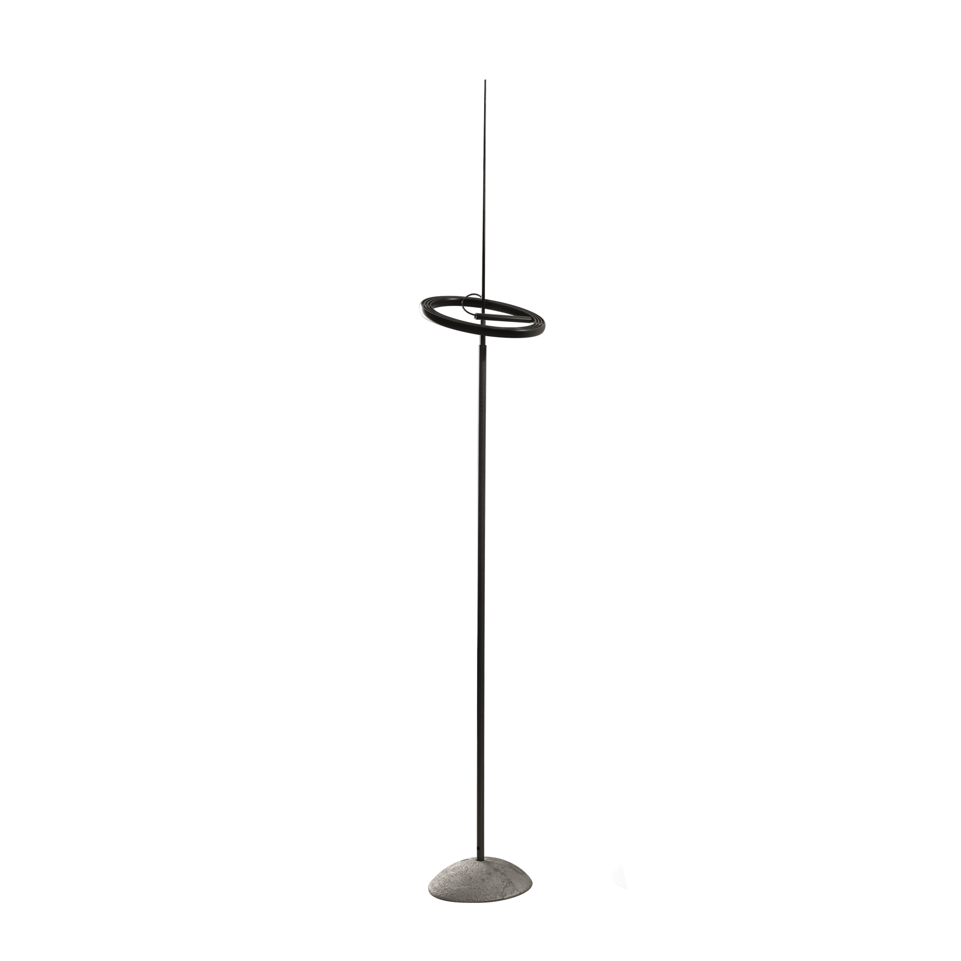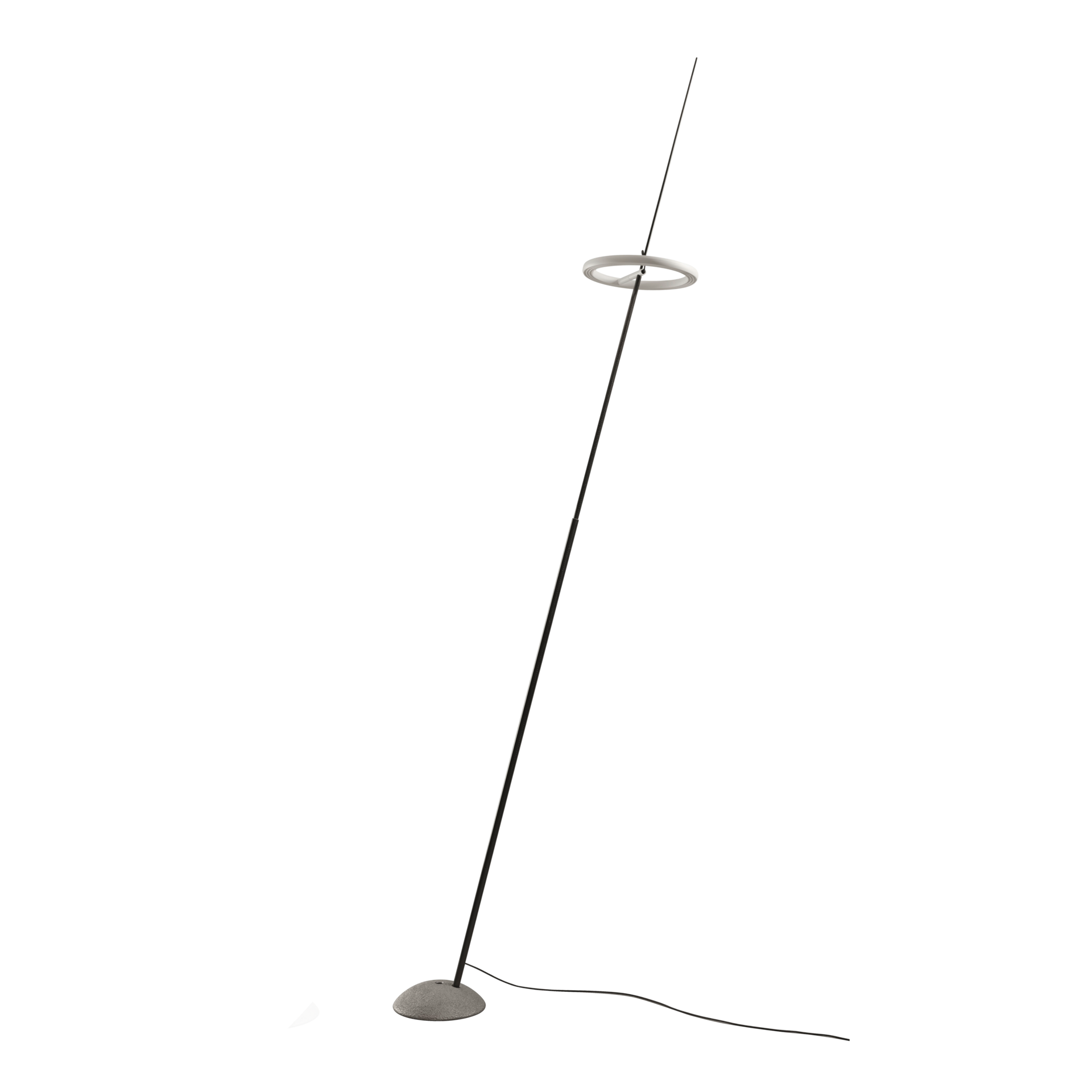 The aluminium ring with integrated dimmable LEDs can be fixed as up- or downlight. Without tools, you can adjust the angle of the ring, the rod or even change the orientation of the LEDs. The rod in carbon fiber can be fixed vertically or at an angle of 15° in the base. There is no visual noise around the slender pointed rod, the cable is inside. Even so, the rod is extendable from 150 to 210 cm. Transformer with slide control. Dimmable. The ring with LEDs is only available in black.