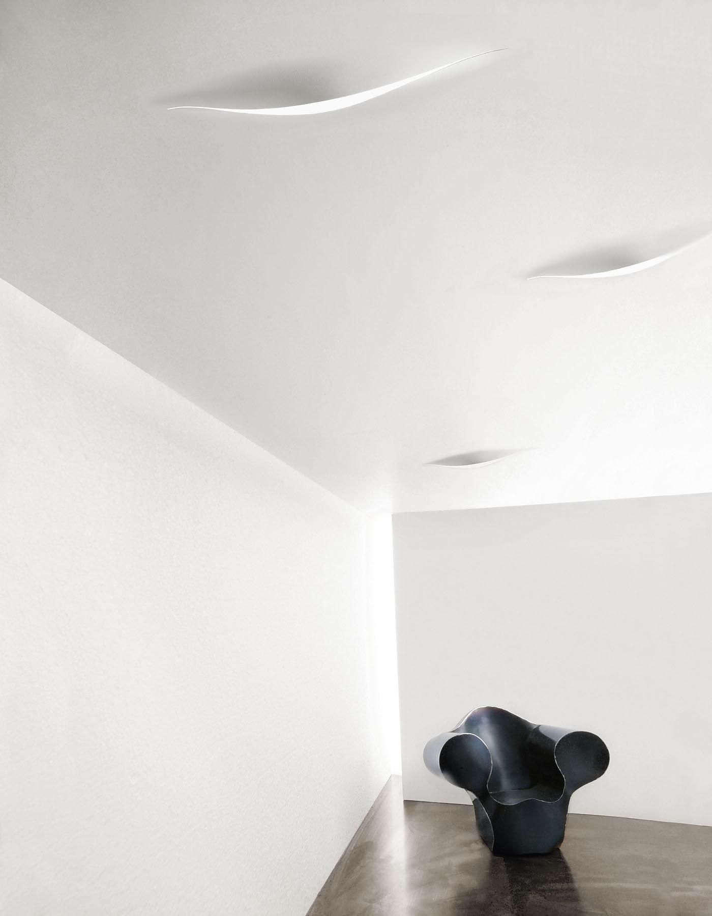 Aluminium, glass fibre. Ceiling lamp for flush mounting into false ceilings.