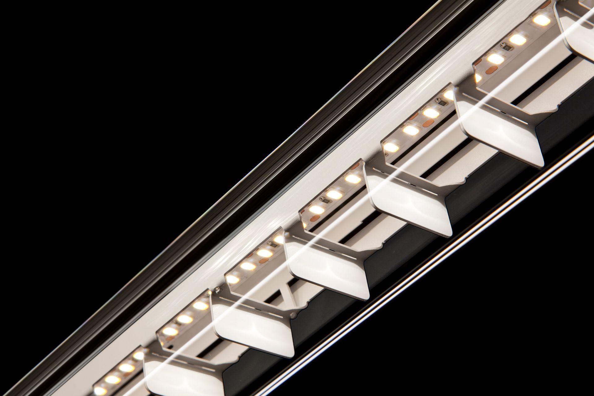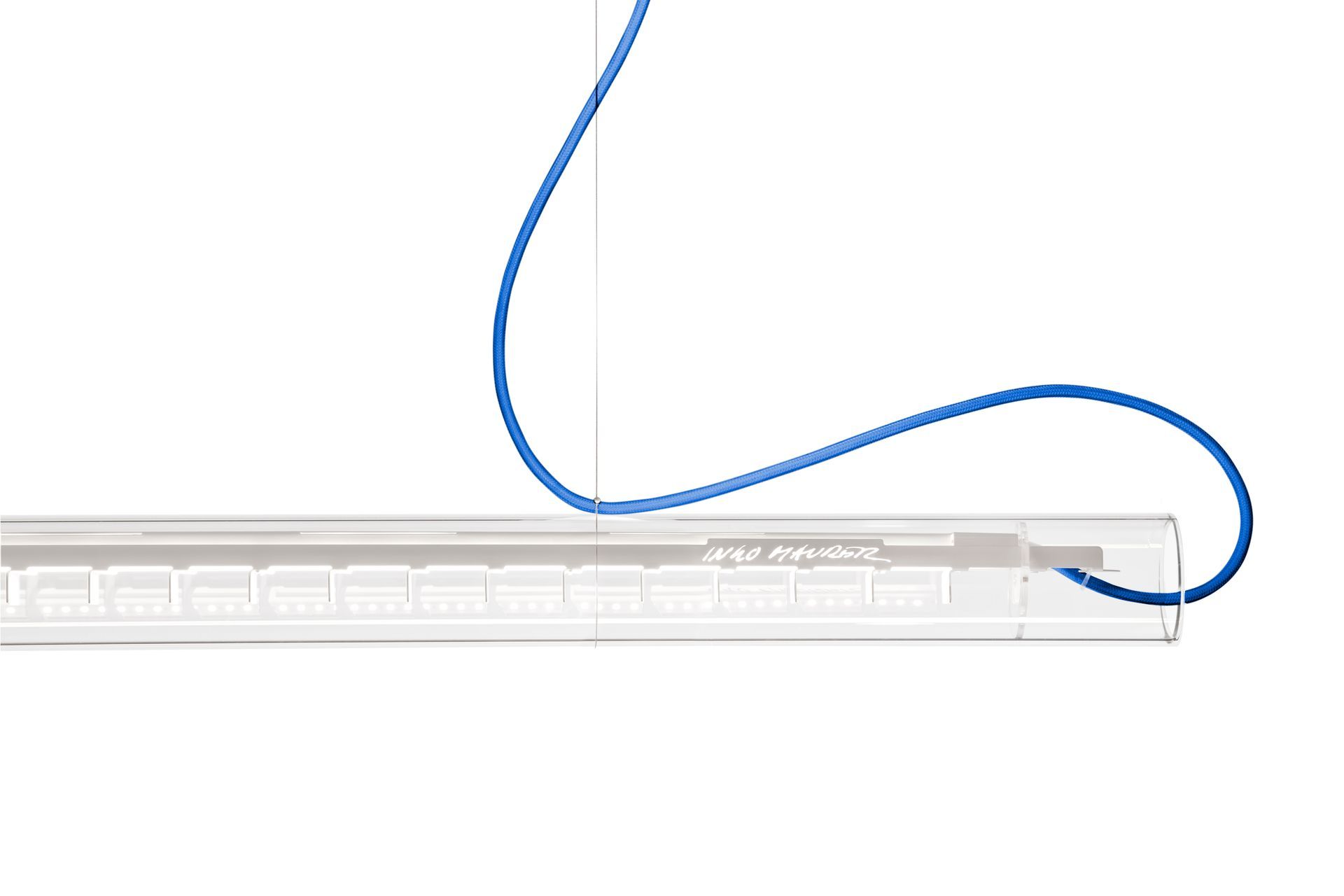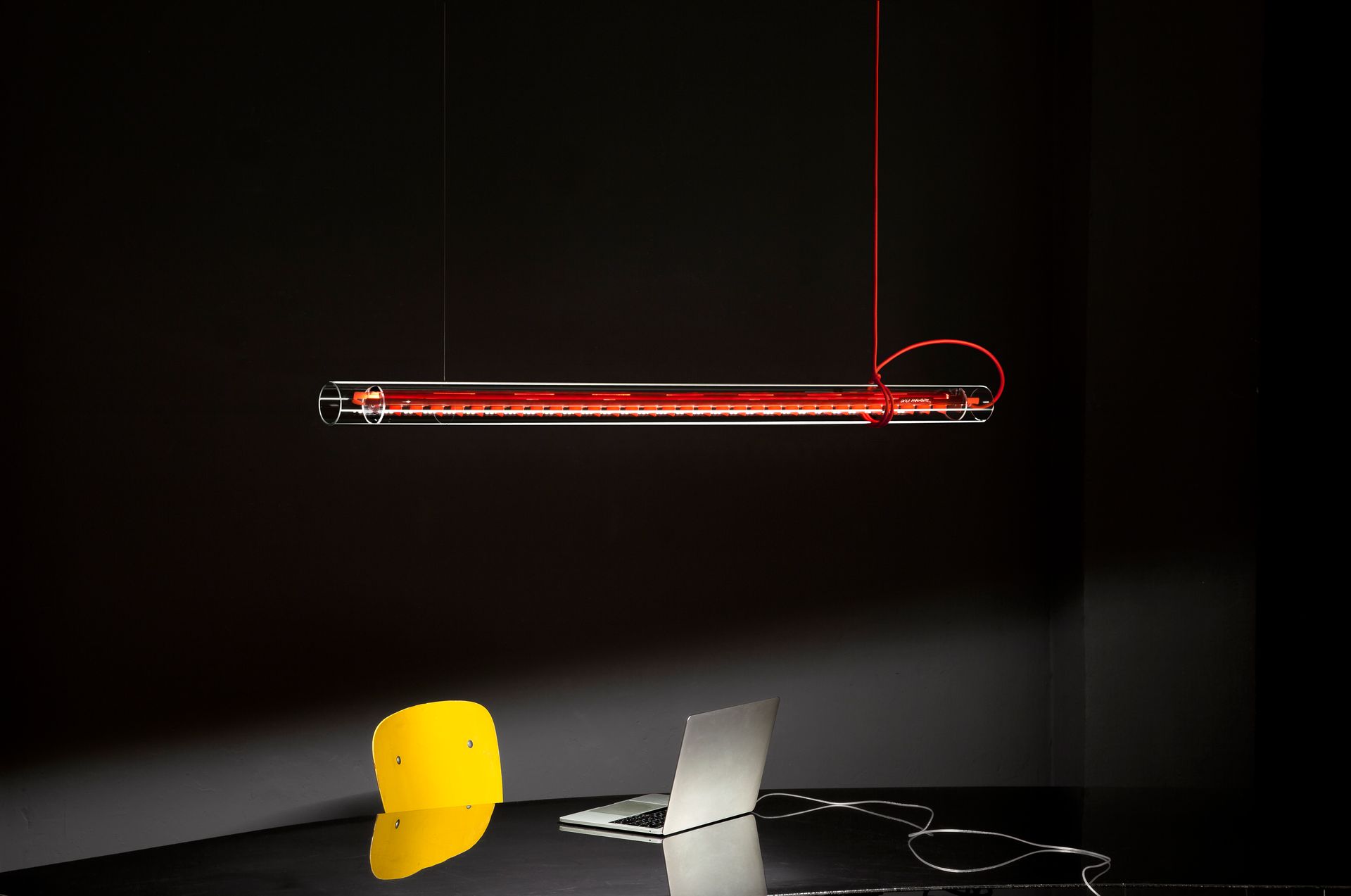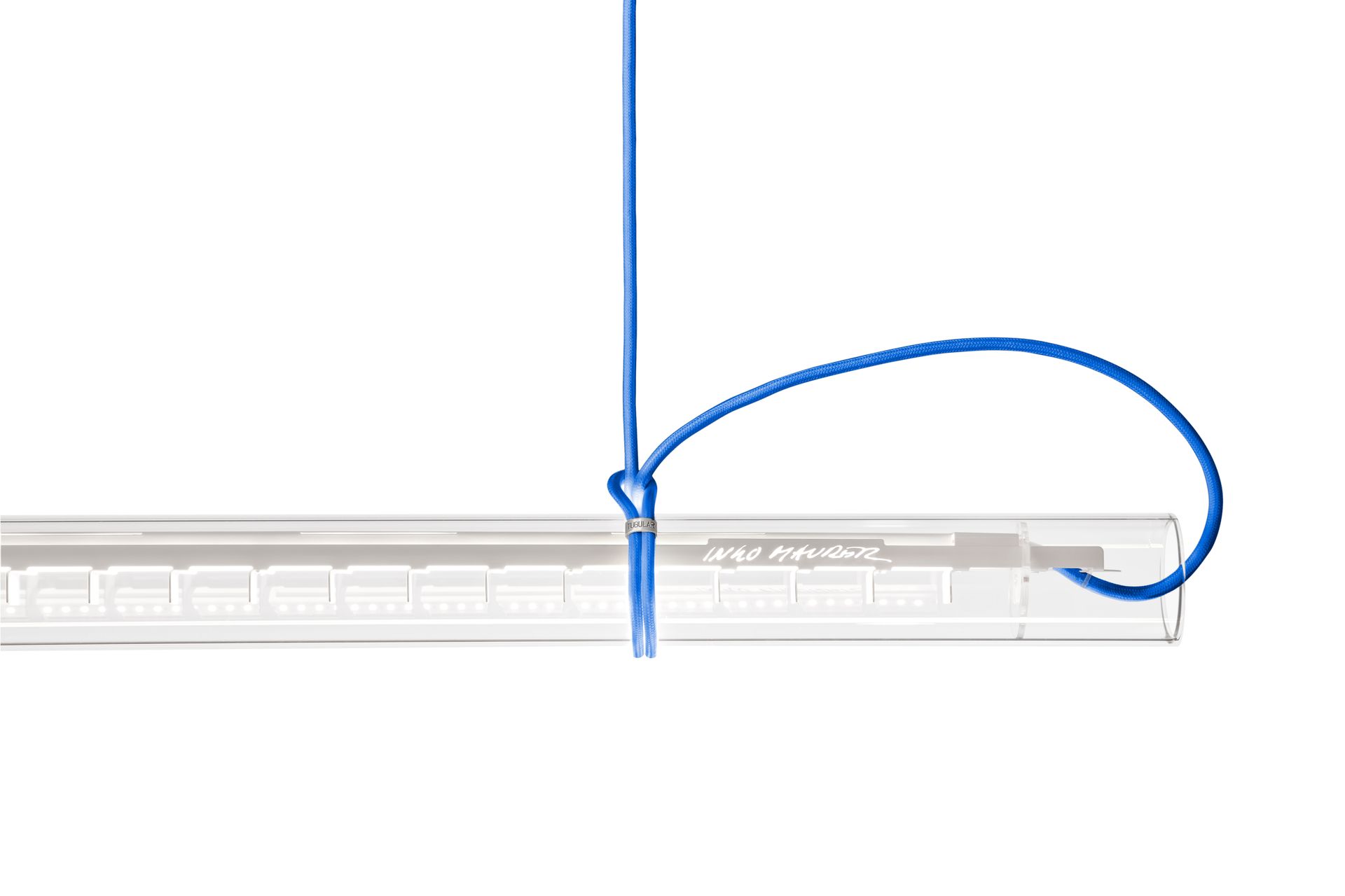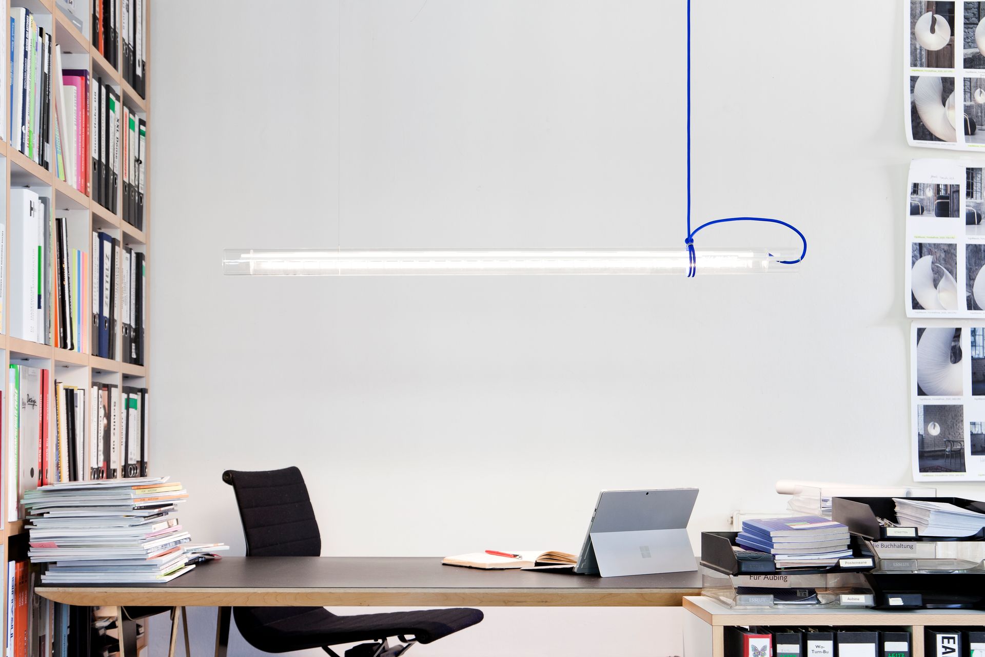 The LEDs are arranged in a row and spread an even, generously spread light. The tube is suspended on nearly invisible cables and with a textile cable - depending on the model via a ceiling rose or a cylindrical counterweight, placed on the table. Because the tube rests in the cable loop, is can be turned by 360 degrees, and shines downwards, laterally or upwards. Depending on the needs, the Tubular lights are able to provide soft, indirect illumination, bright direct light for a dining table or working place or pleasant lighting accents.
