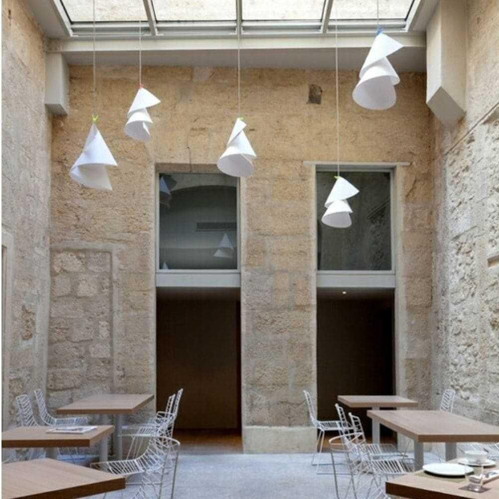 Willydilly by Ingo Maurer is a curved hanging lamp made of high-quality, light-transparent cardboard. The white cardboard shade wraps around the light source and is attached to the pull cord by a fluorescent Japanese clothes peg.