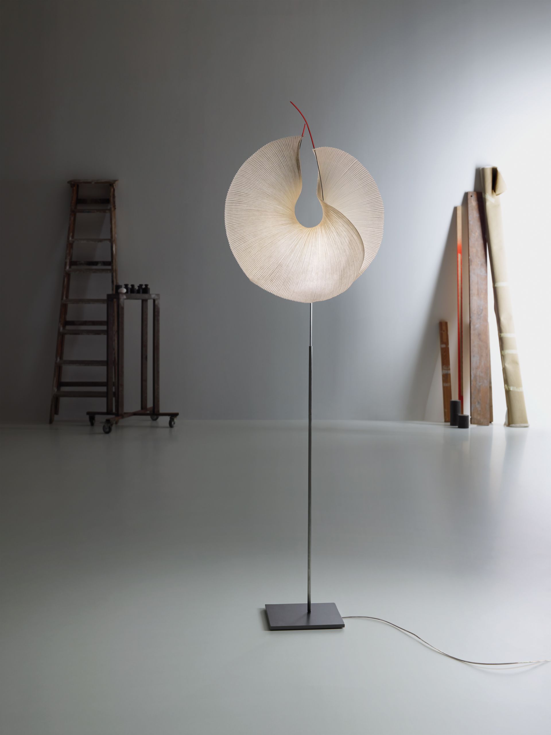 Paper, metal, stainless steel, silicone. Yoruba Rose Floor is a new version of the floor lamp Yoruba Rose. Just as in all other MaMo Nouchies, the lampshade consists of Japanese paper, which has to undergo a special manufacturing process in Dagmar Mombach’s studio, until the desired shape is achieved. The light source is an LED module, provided with a cooling element, developed by Ingo Maurer especially for the MaMa Nouchies. Its light is so warm and soft, that any difference can hardly be noticed when compared to conventional halogen light sources.