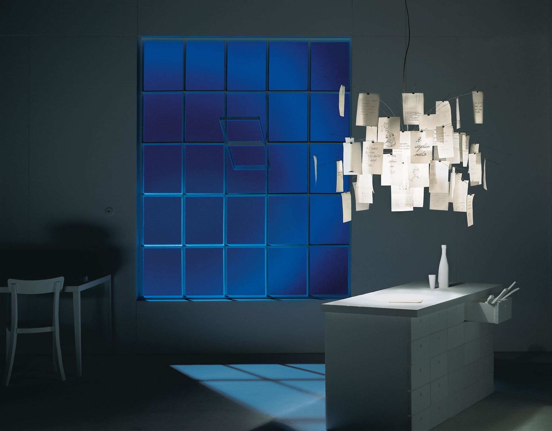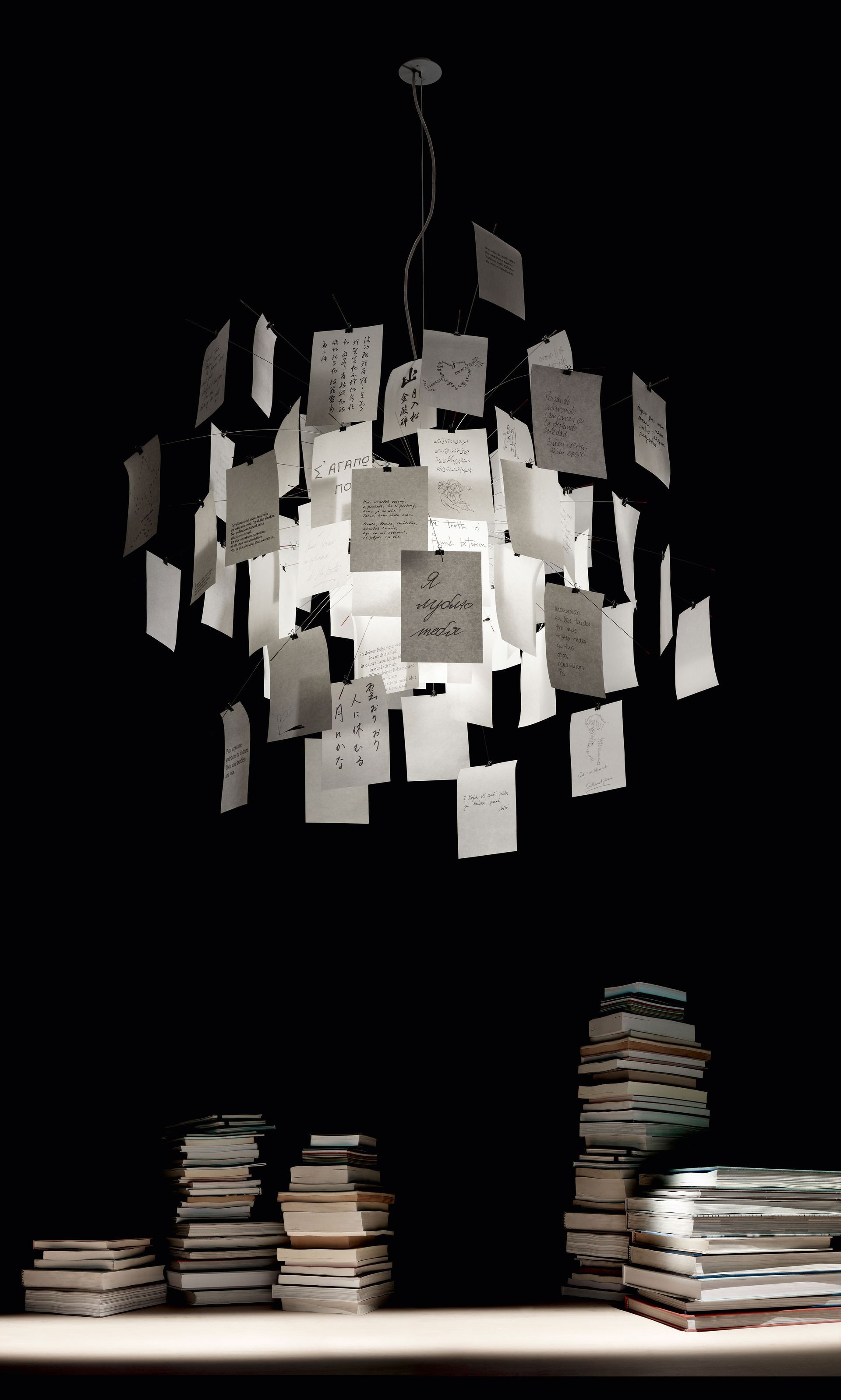 Products in the "Essentials" category are usually available for immediate delivery. Stainless steel, heat-resistant satin-frosted glass, Japanese paper. 31 printed and 49 blank paper sheets DIN A5 or 40 printed and 40 blank paper sheets DIN A6. The Zettel'z is one of Ingo Maurer’s best known lamps. It gives the user plenty of room for his or her own creativity, and can be set up so that it is space-consuming and loose or narrow and dense. The blank sheets of paper supplied with it are designed to be used for your own messages or sketches. The Japanese paper is very thin and translucent. Two bulbs provide good light.