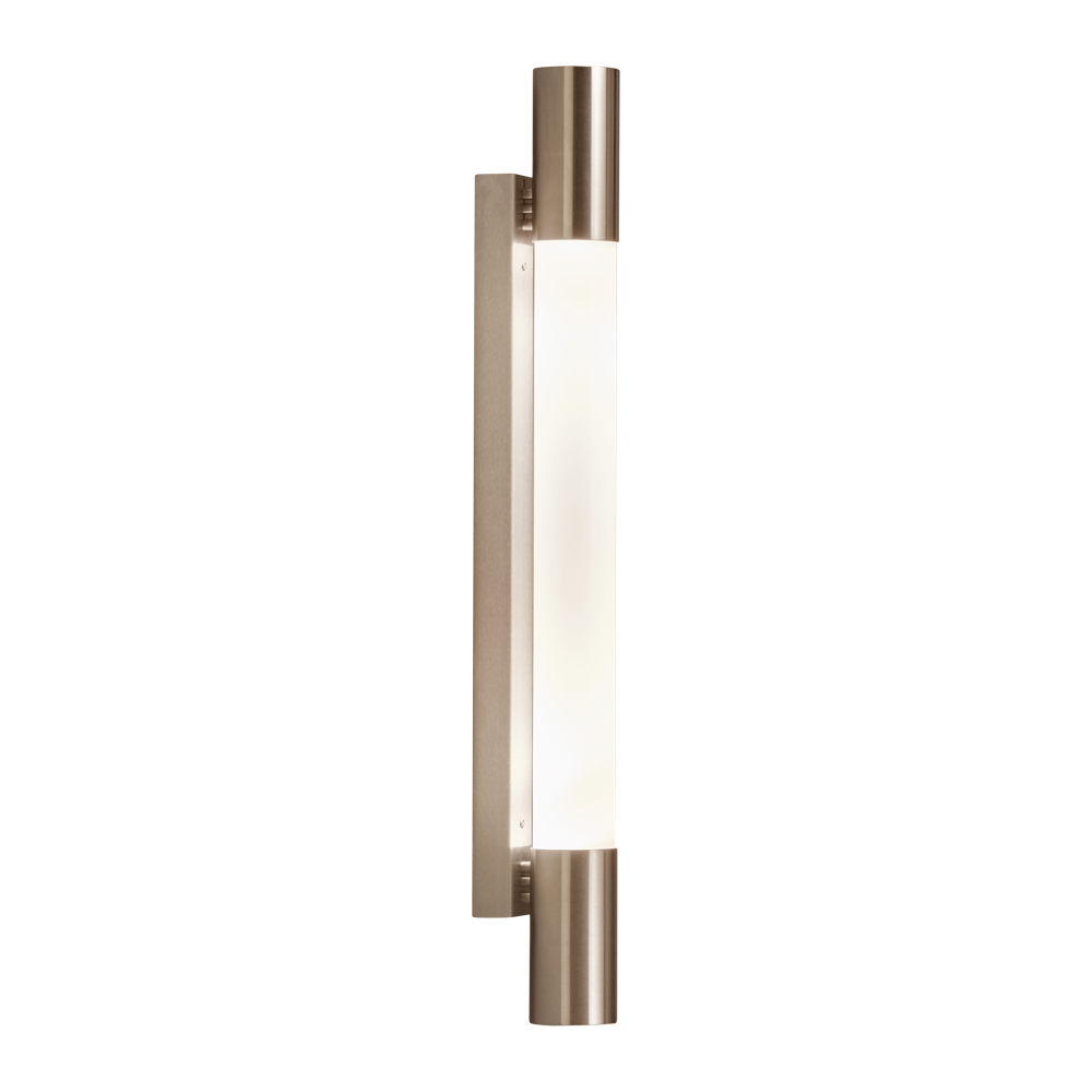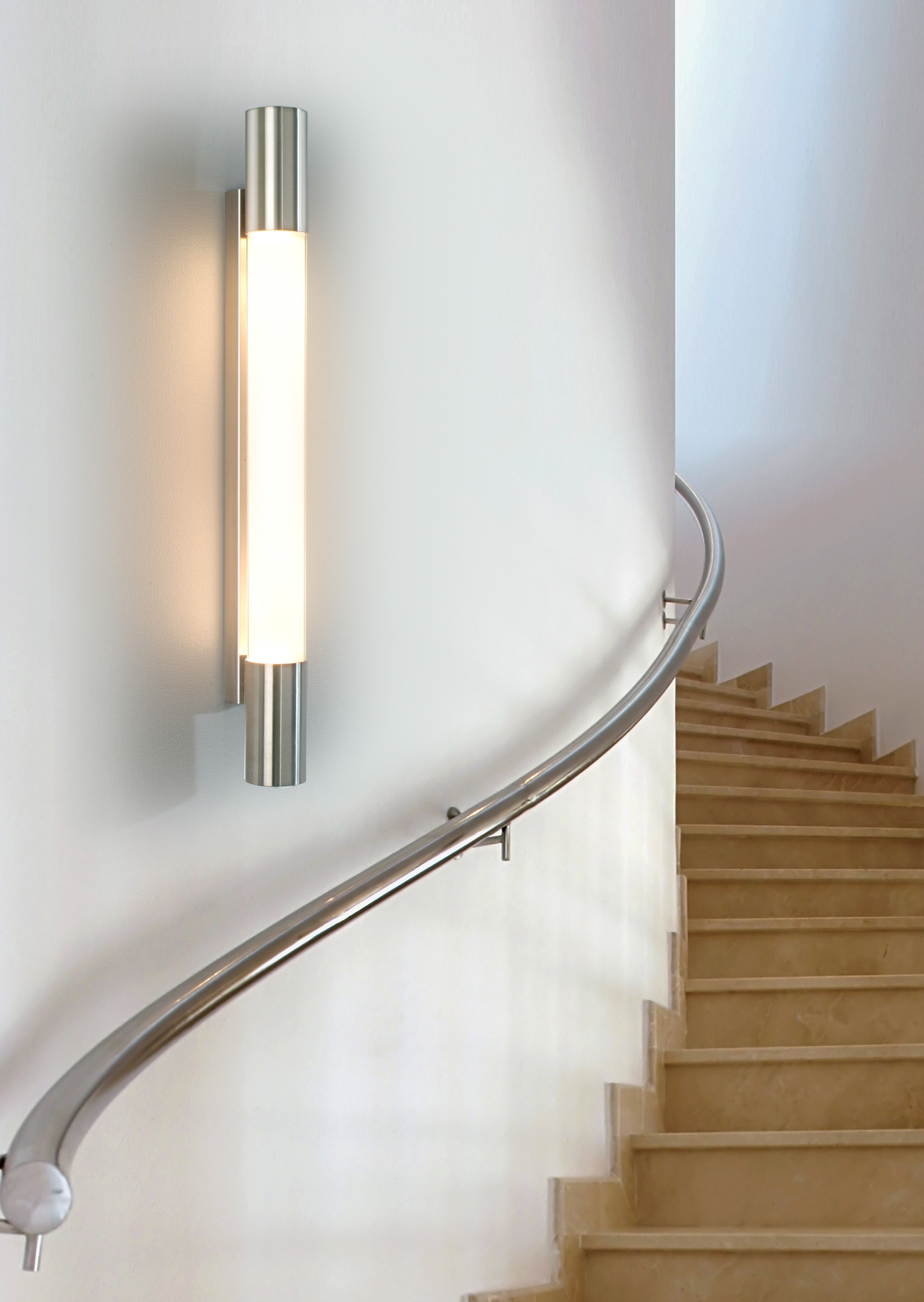 This sophisticated wall lamp is ideal for mirrors, staircases and hallways. It can only be mounted in an upright position with two matt stainless-steel cylinders at each end. Its special plastic diffuser ensures a very even distribution of light over a wide area.