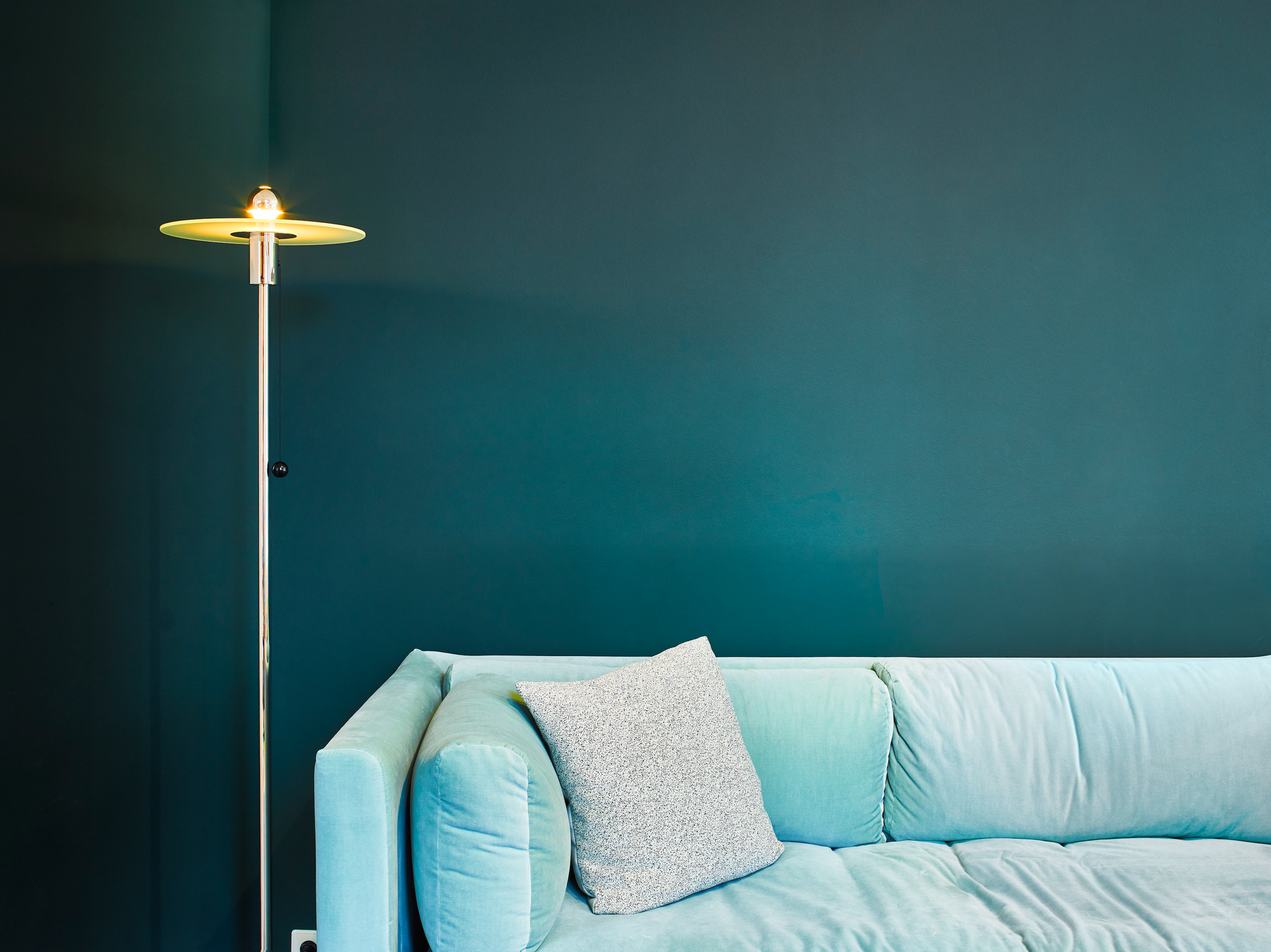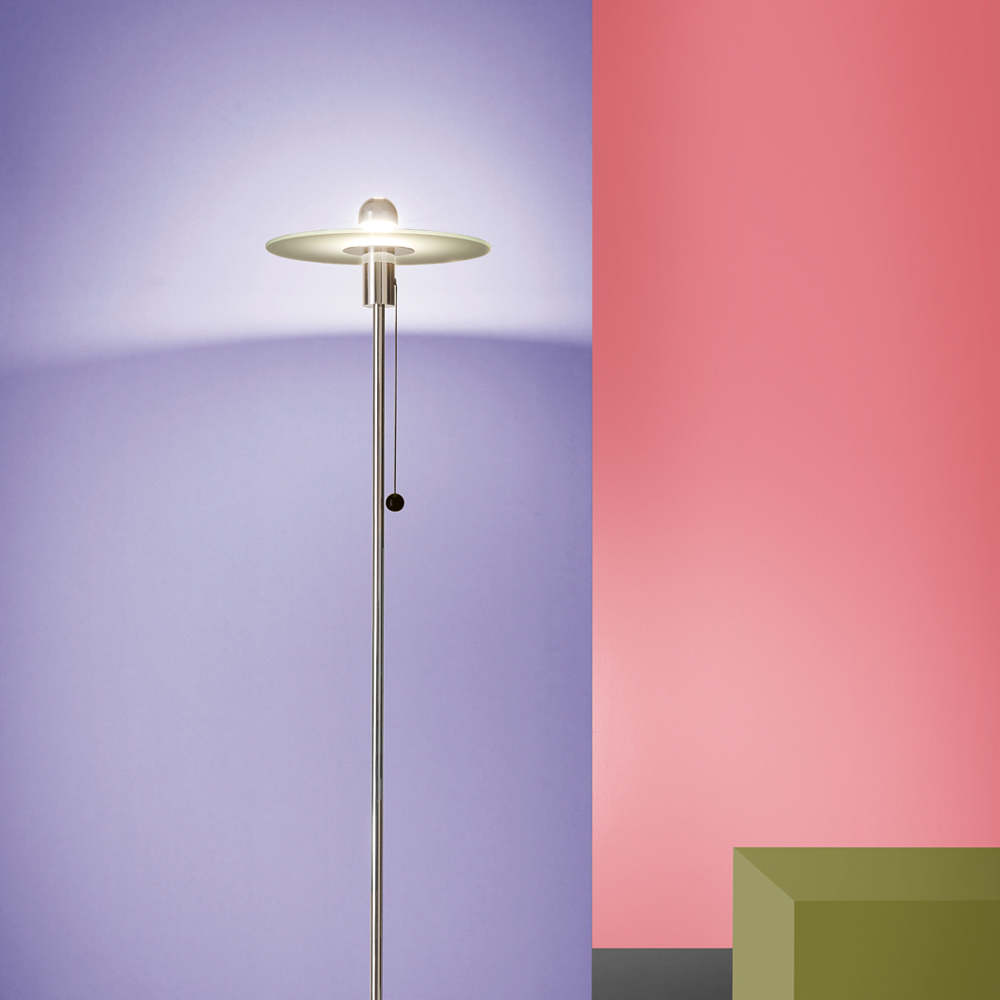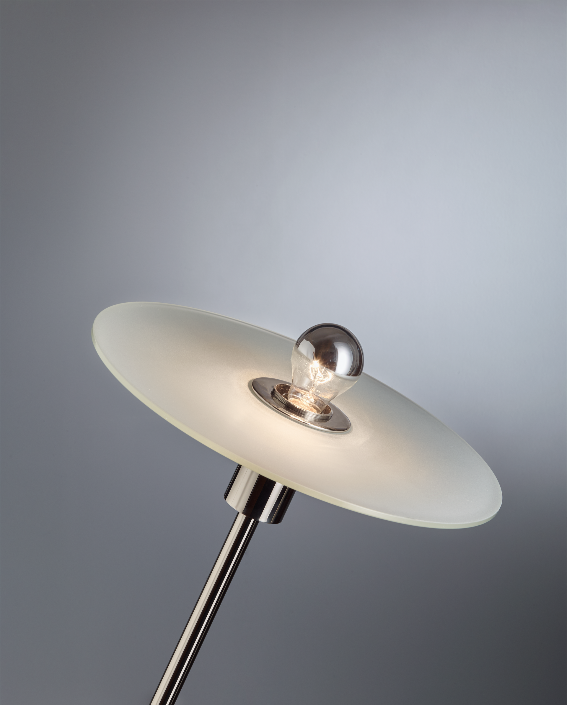 The light source is a special design feature in its own right – an exposed incandescent light bulb with a mirrored dome, which had just been invented at the time. The rays of light are channelled downwards, making the light source appear dark. The light is absorbed and refracted by the etched pane of frosted glass in such a way that it appears to float like a shining layer above the thin, nickel-plated metal tube.