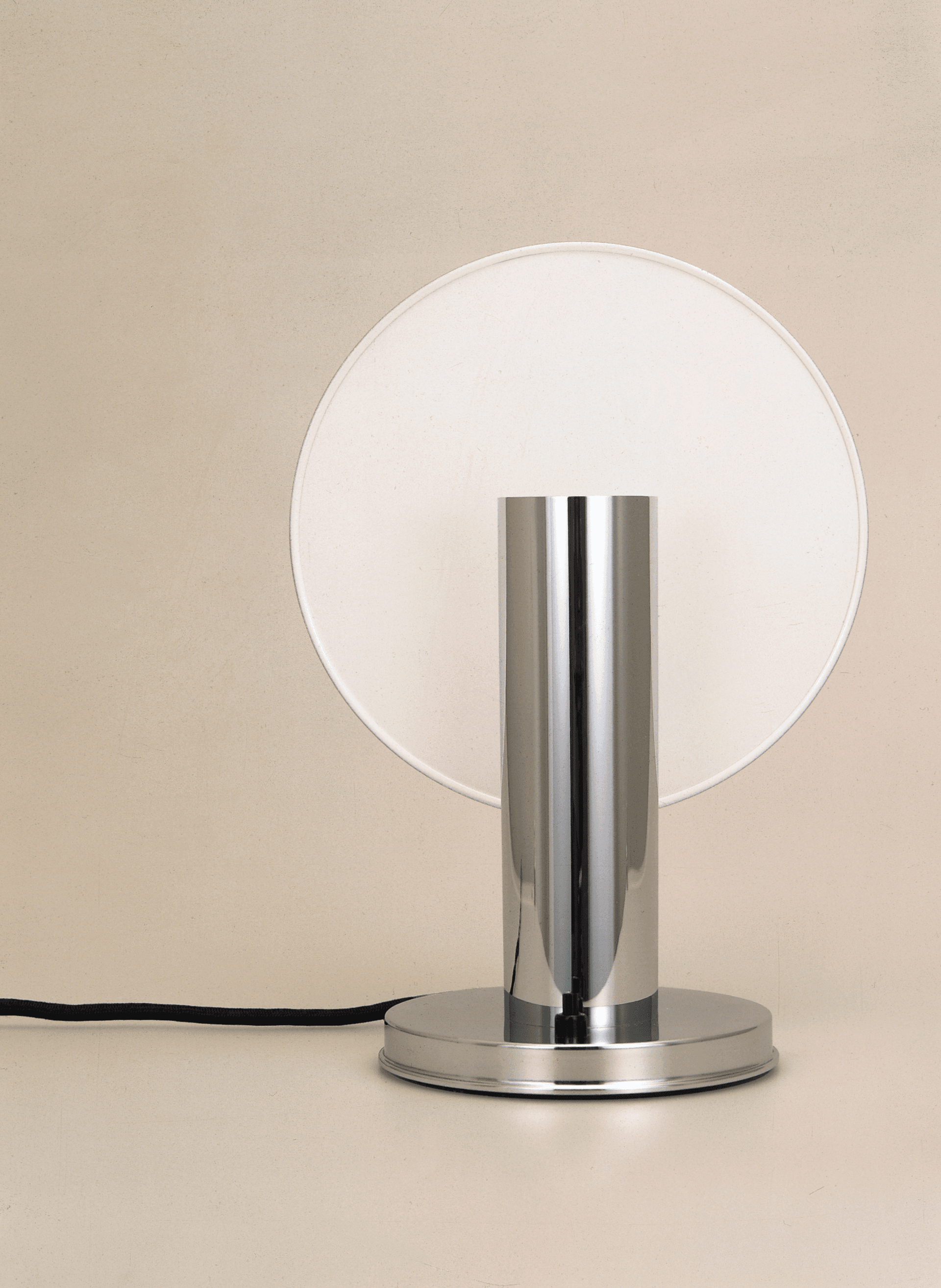The light source for this bedside lamp is concealed in a cylinder that stands on a round baseplate, and the glow is reflected softly by a white varnished pane. The reflector screen is mounted asymmetrically and can be adjusted by simply turning it.