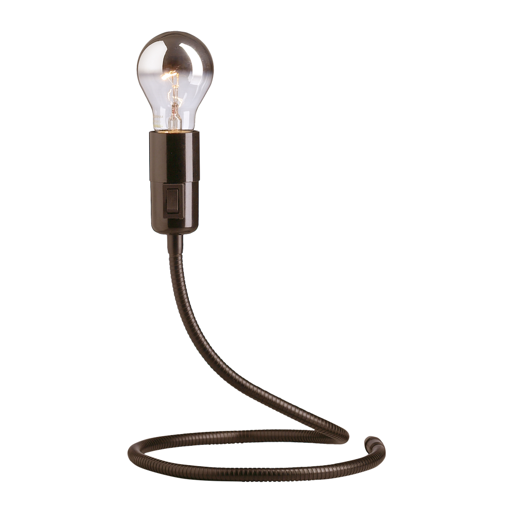 This lamp is characterised by its flexibility. Its base is made of flexible metal links, while its head is a light bulb with a silvery tip. The switch is framed in black plastic. We offer the “Lightworm” with a black or nickel-plated base, and the cable is then black or transparent to match.