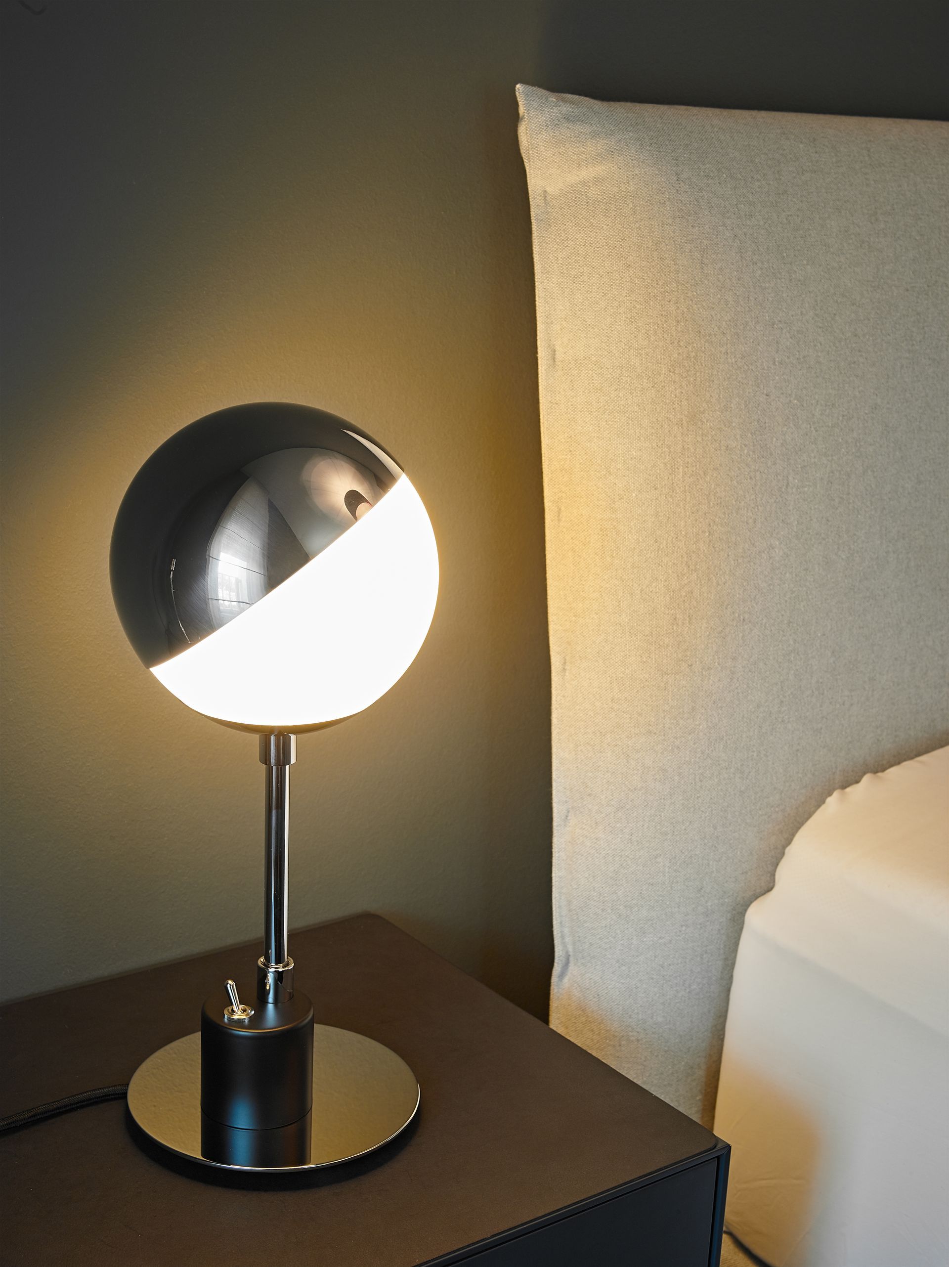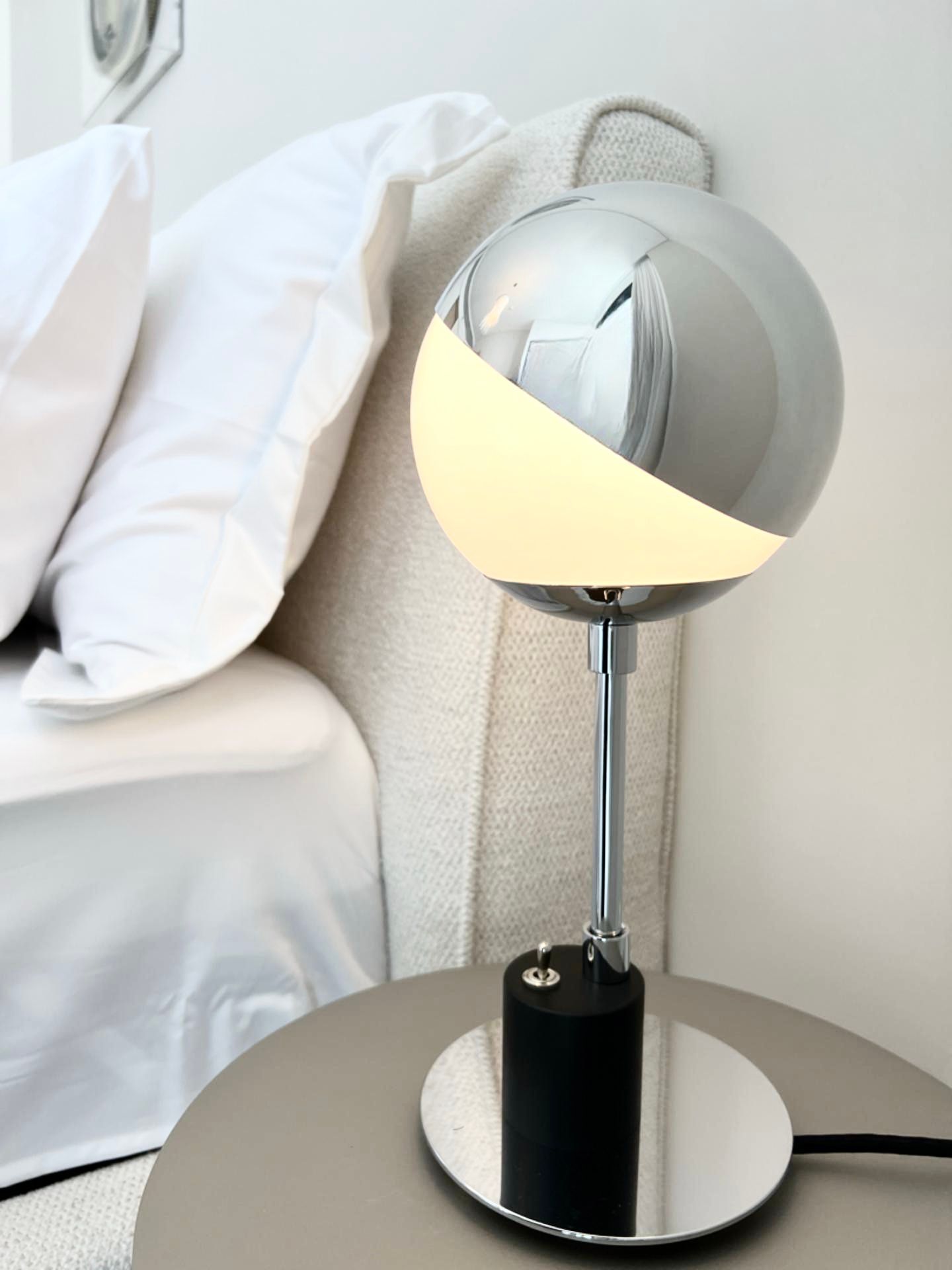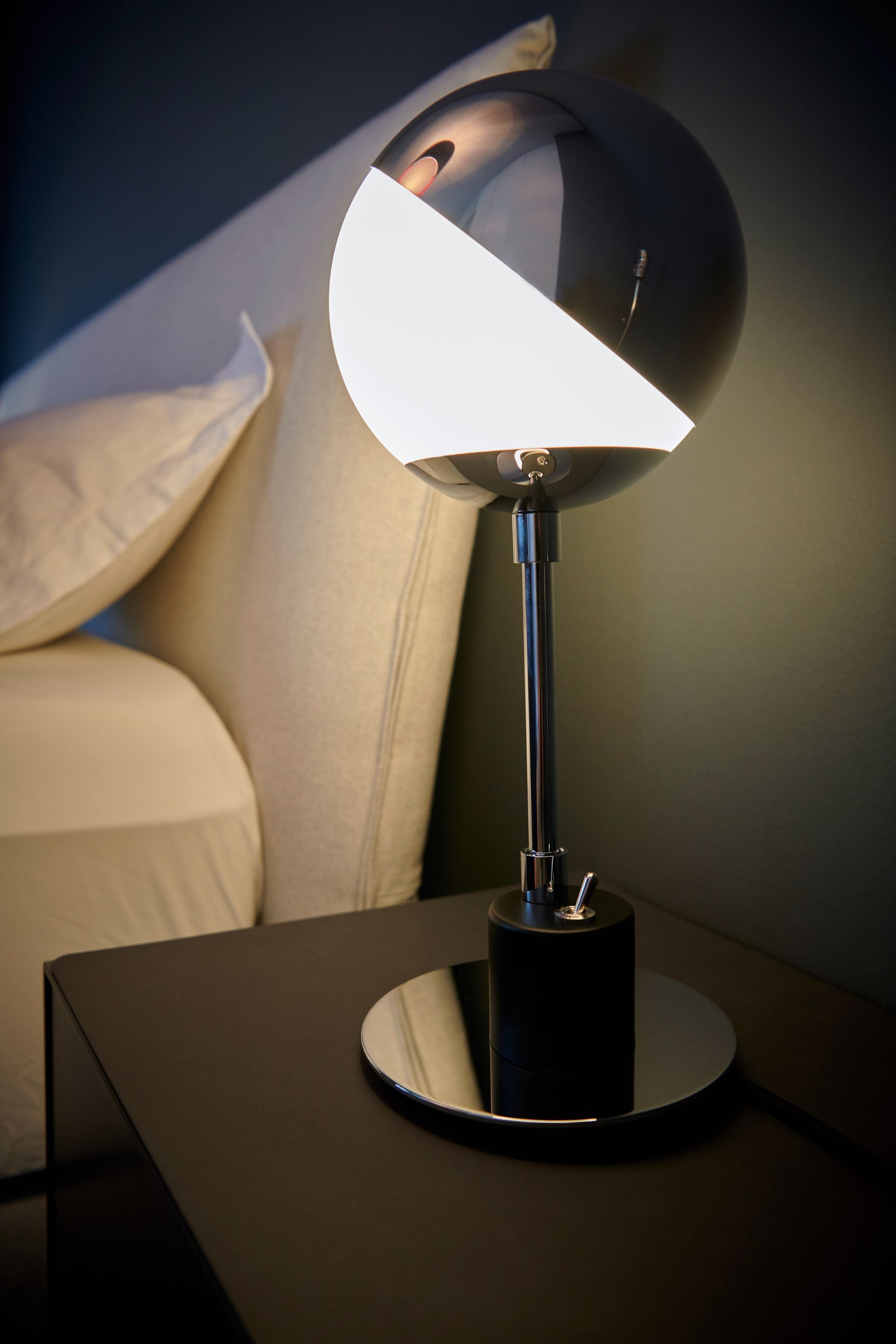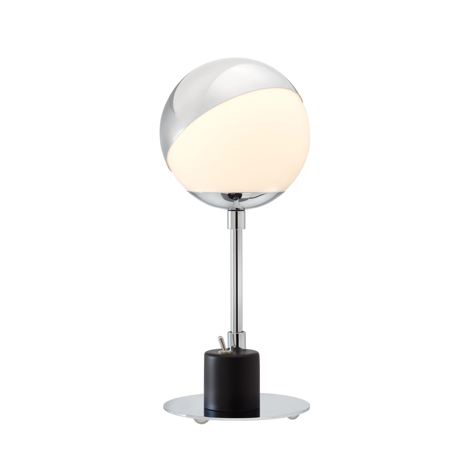 The polished aluminium cap stays on the glass sphere through friction alone. The reflector can be adjusted at any time without causing glare. This table lamp has retained its practicality throughout the years thanks to its design, which has been reduced to the simplest spherical and cylindrical shapes that are necessary to enable its functions.