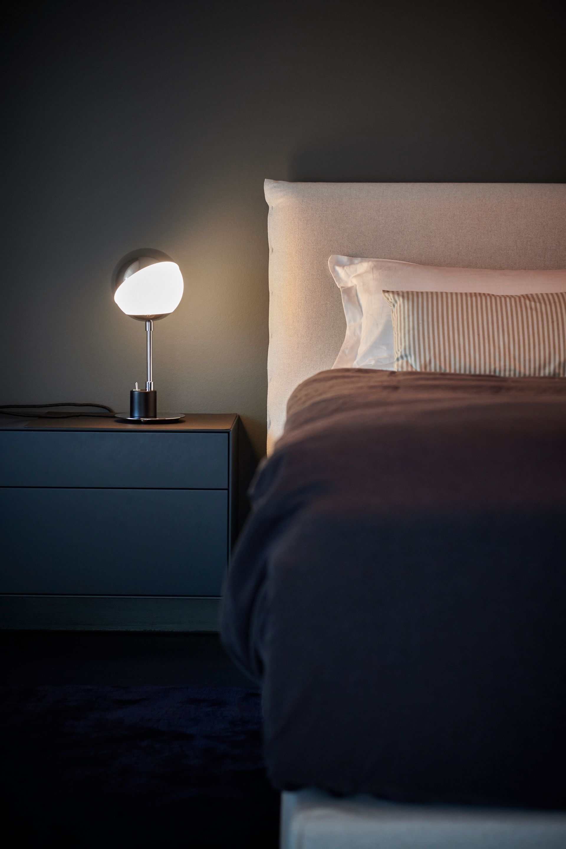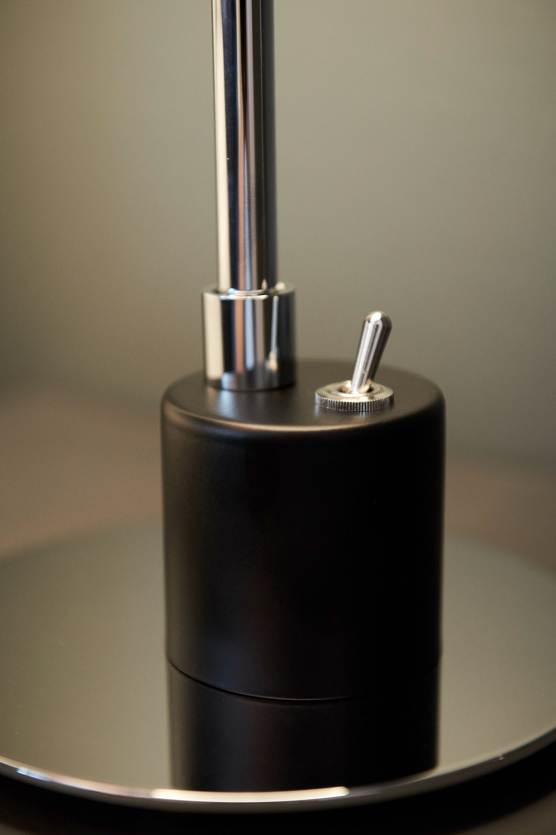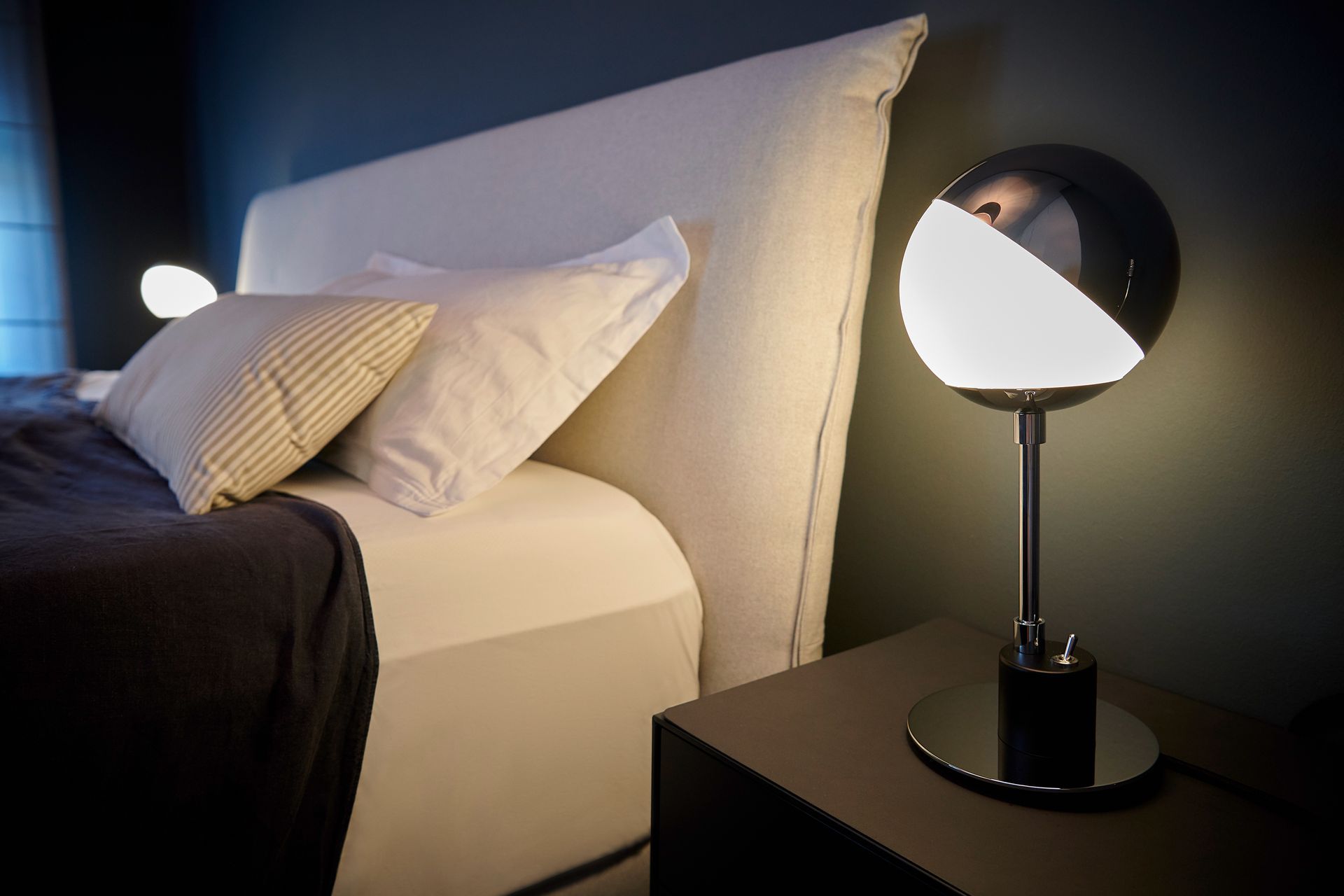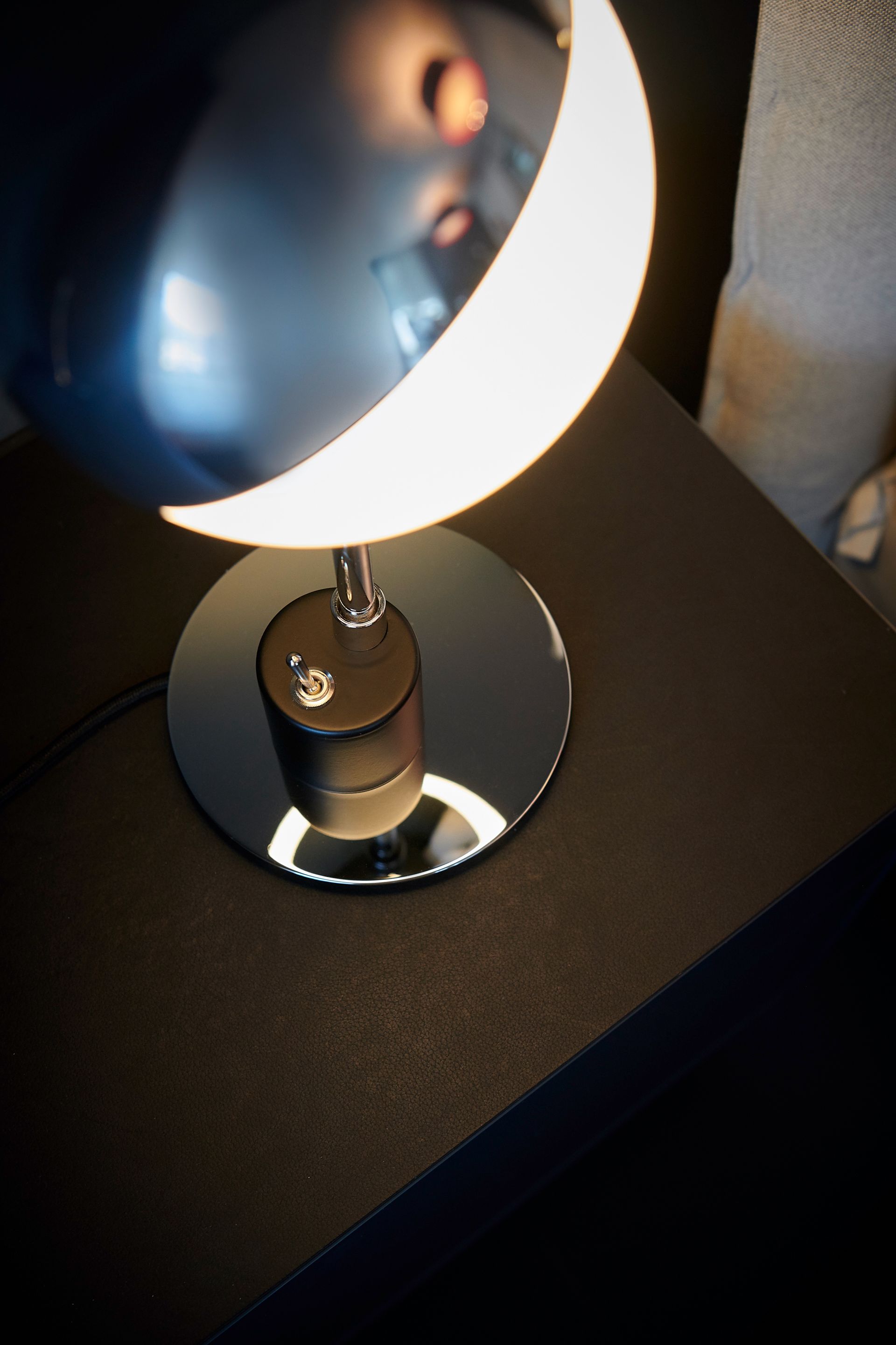 The polished aluminium cap stays on the glass sphere through friction alone. The reflector can be adjusted at any time without causing glare. This table lamp has retained its practicality throughout the years thanks to its design, which has been reduced to the simplest spherical and cylindrical shapes that are necessary to enable its functions.