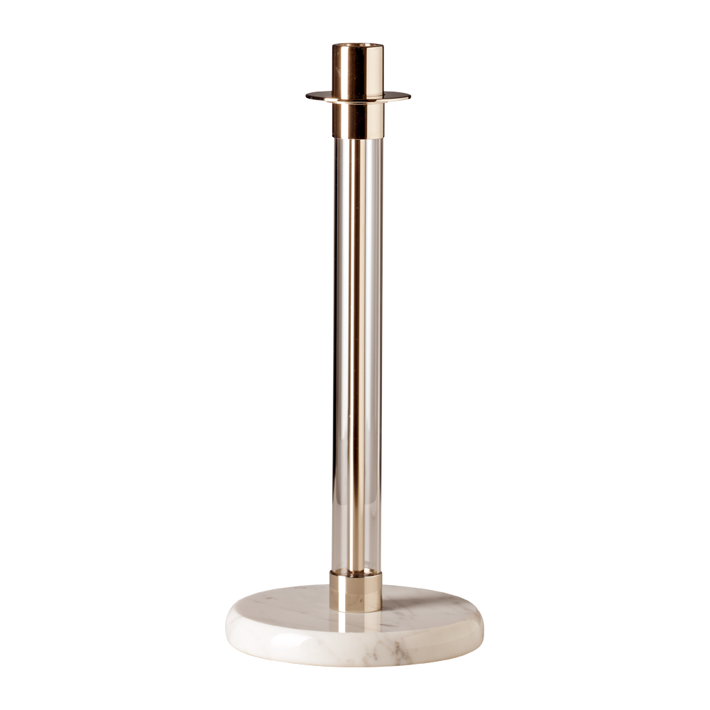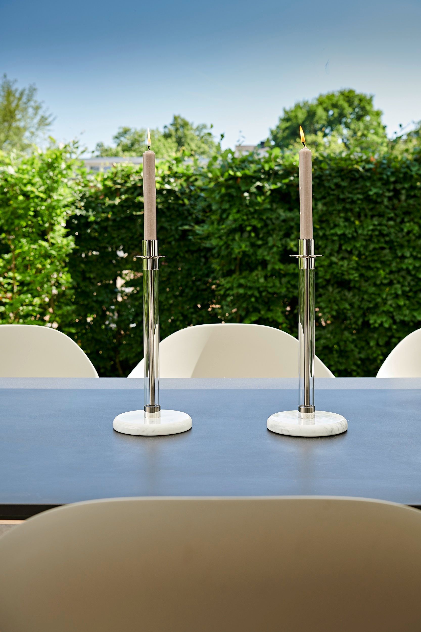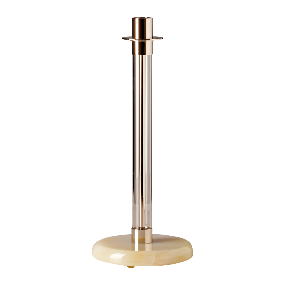 In the magazine “Die Form” (issue 23/24, 1930) this Jewish Sabbath candlestick was shown as an example of a formally good solution for cult devices. The designer is unknown; the candlestick was formerly manufactured by a no longer existing company L. Wolpert in Frankfurt a.M. The base is made of marble, the shaft is similar in construction to that of the Wagenfeld glass lamp. A nickel-plated tube that carries the candle holder runs in a glass tube. The chandelier is still produced in two different versions: the base is made of white marble or white onyx. A removable disc catches the drops. All candlesticks are made according to the original available to us.