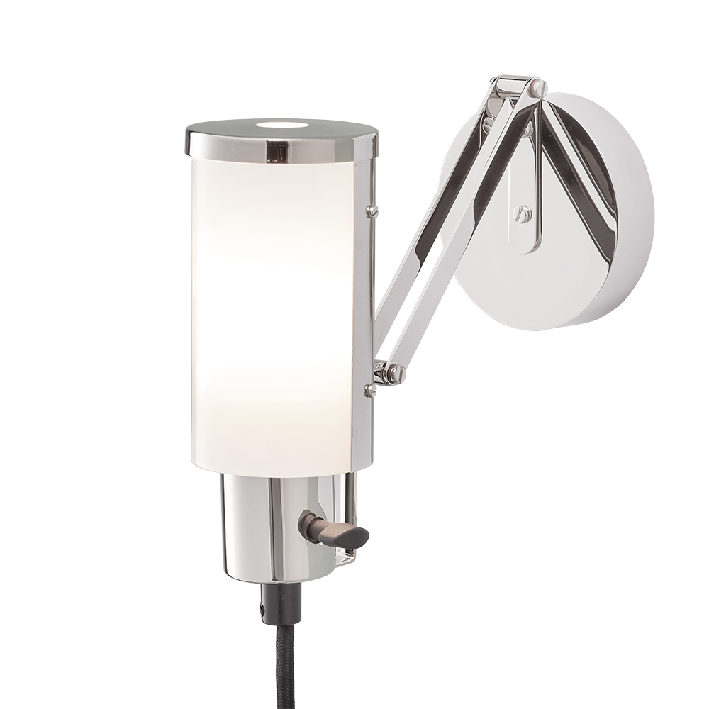 The lamp can be moved using two joints, but the light is only ever emitted to one side. The rotary switch is located on the body beneath the shade. The solid, heavy brass body is plated with nickel instead of chrome, giving the metal an unusually warm look and a fine, deep shine when polished.