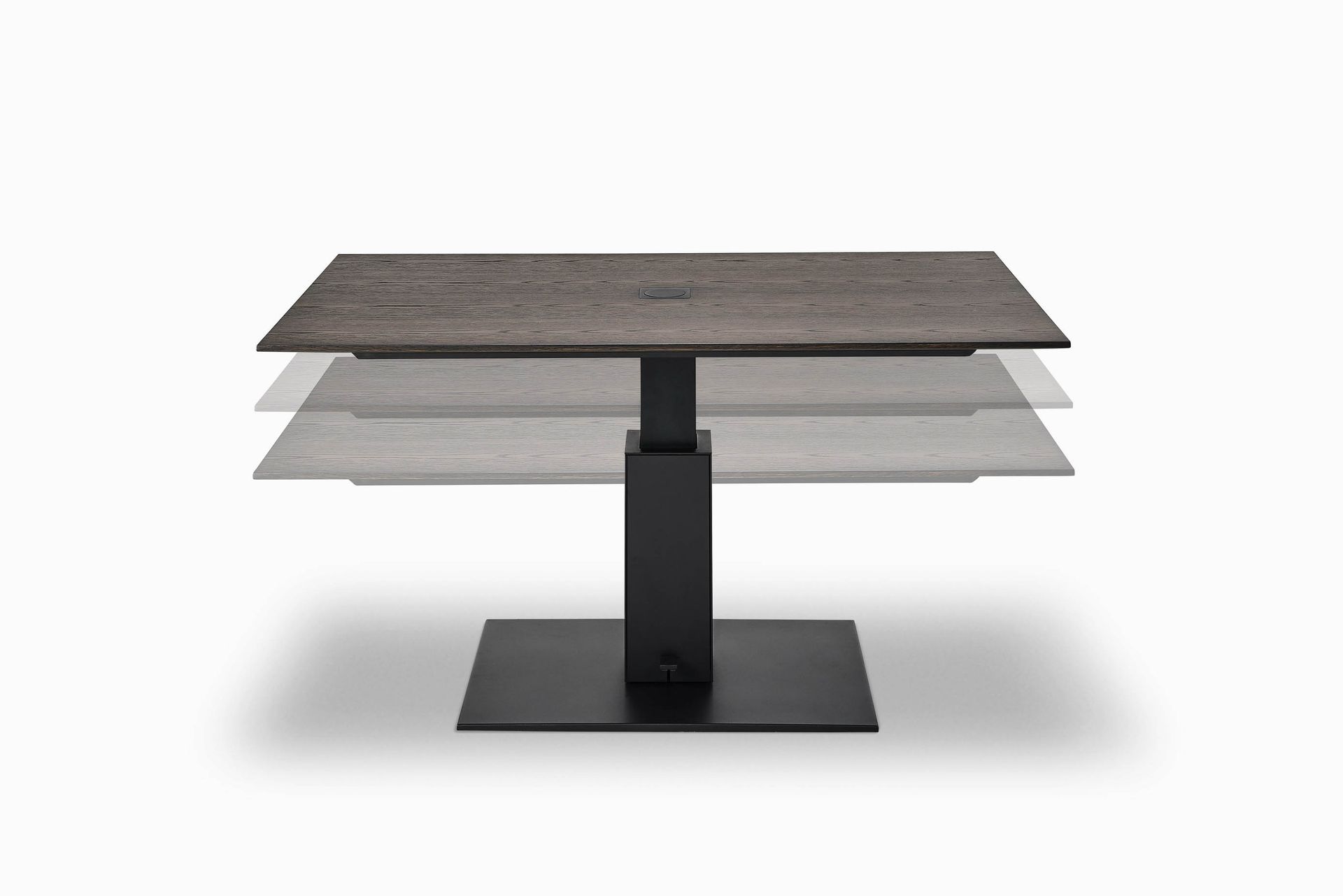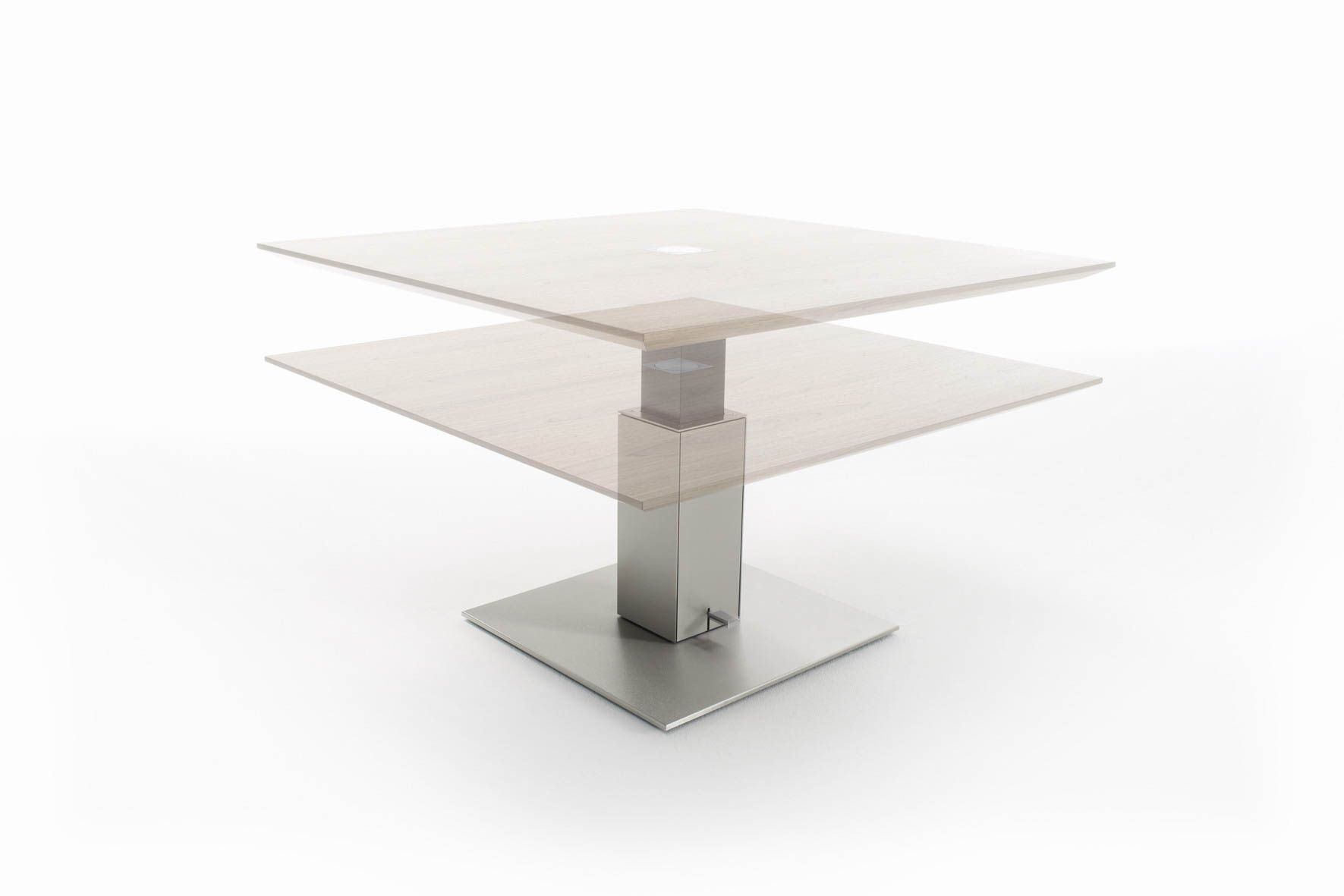 DRIVE is the name of the multifunctional, transformable coffee table from Yomei. The starting point of the development was the desire to play, work or eat with the family on the sofa. The coffee table can be changed in three ways: The height can be adjusted from 48 cm to 68 cm via gas pressure spring. In addition, the top can be moved horizontally in any direction by 30 cm, so that sitting across corners is also possible comfortably. The base and column remain in place.