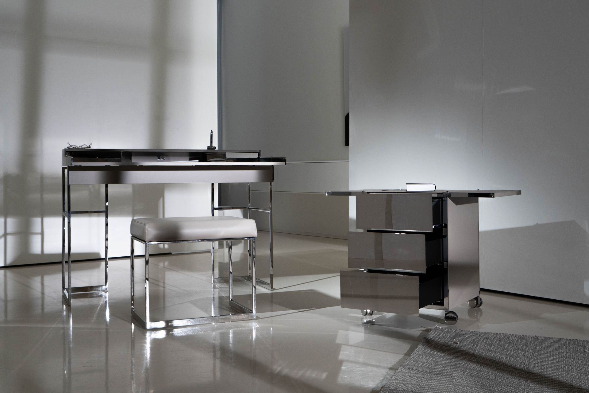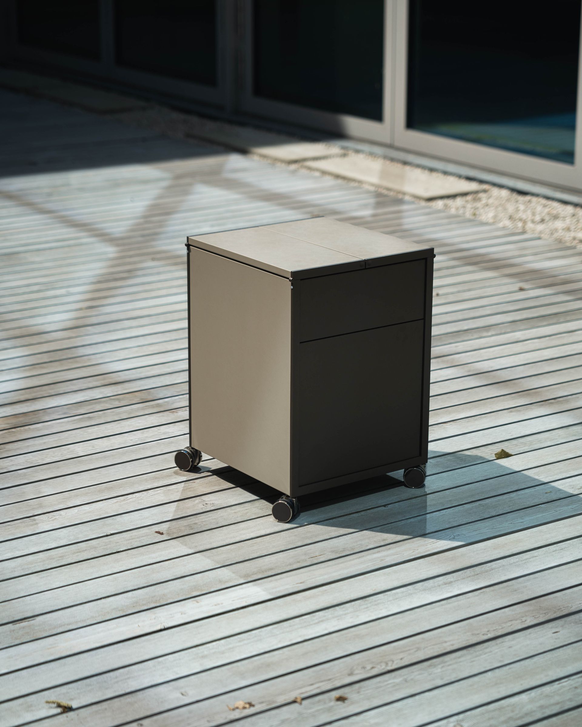 Fine details and functional storage space characterize this mobile pedestal. The top shelf can be folded out and extended from 41 cm to 82 cm, providing a large storage area and alternatively a space-saving solution when the bottom is folded in. 2 drawers in a classy finish with textile leather frames and velvet bottom offer plenty of storage space. There is a small drawer with an insert for pens and a large drawer in which folders can also be stored or a suspension file can be used.
