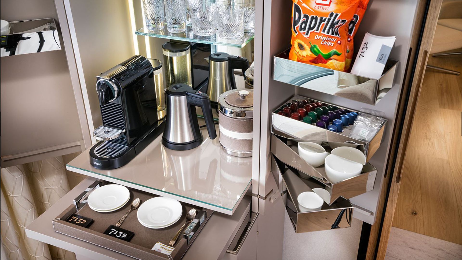 High-quality details such as mirror and stainless steel elements, as well as the possibility to integrate a refrigerator, make the MAGIC CUBE BAR L a fully equipped luxury bar.