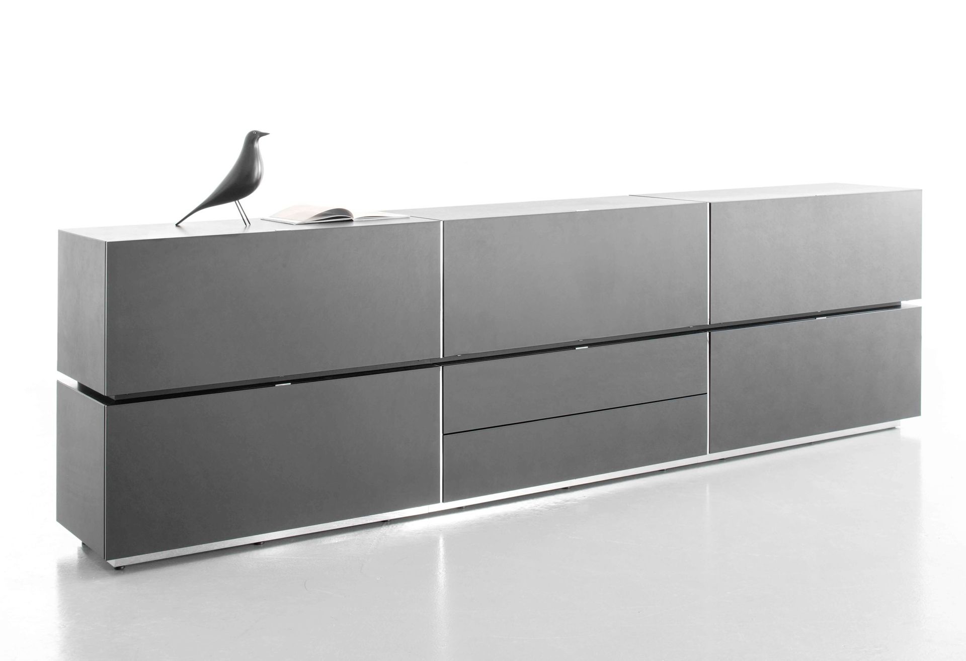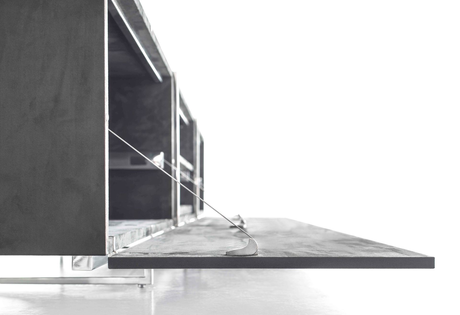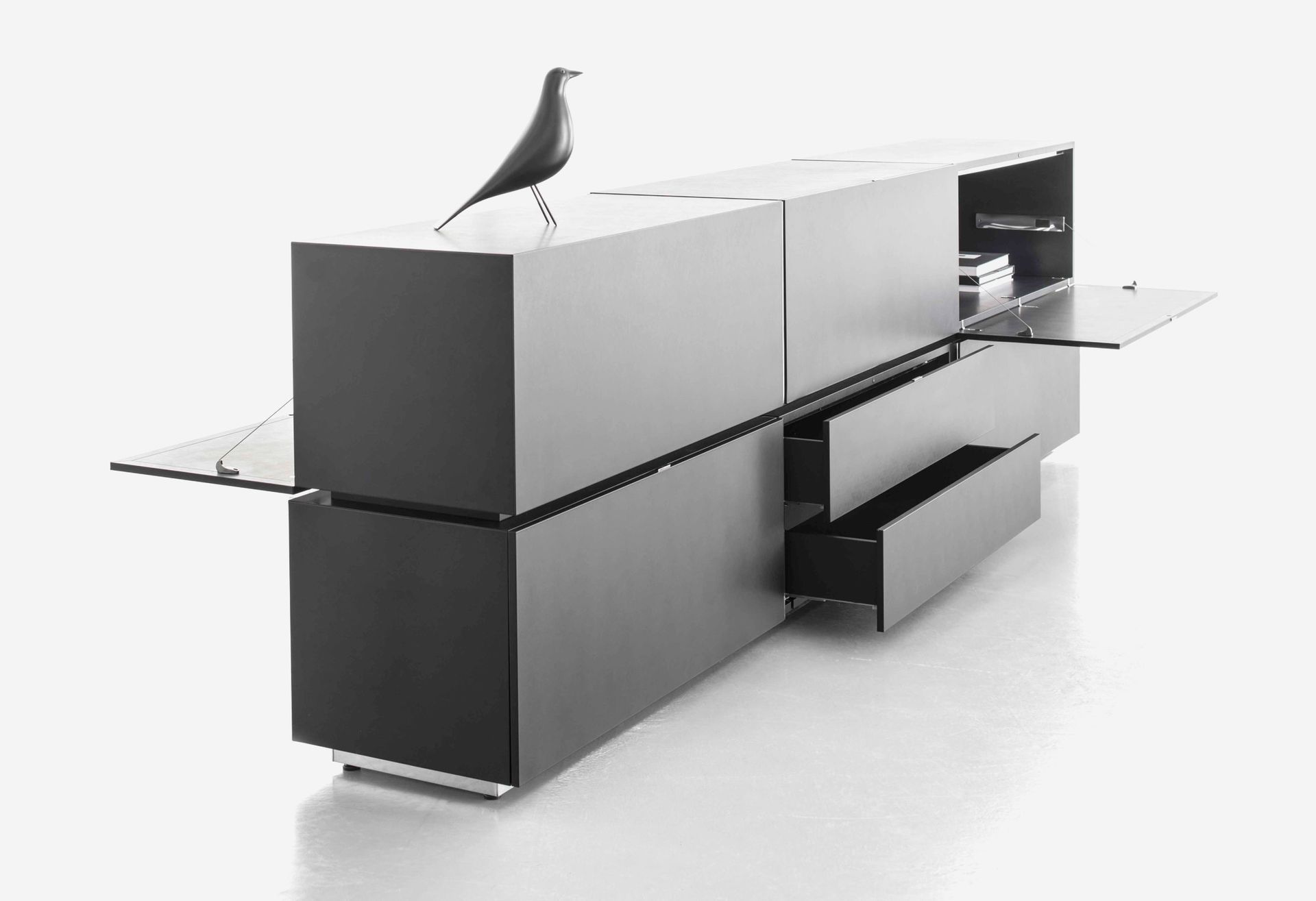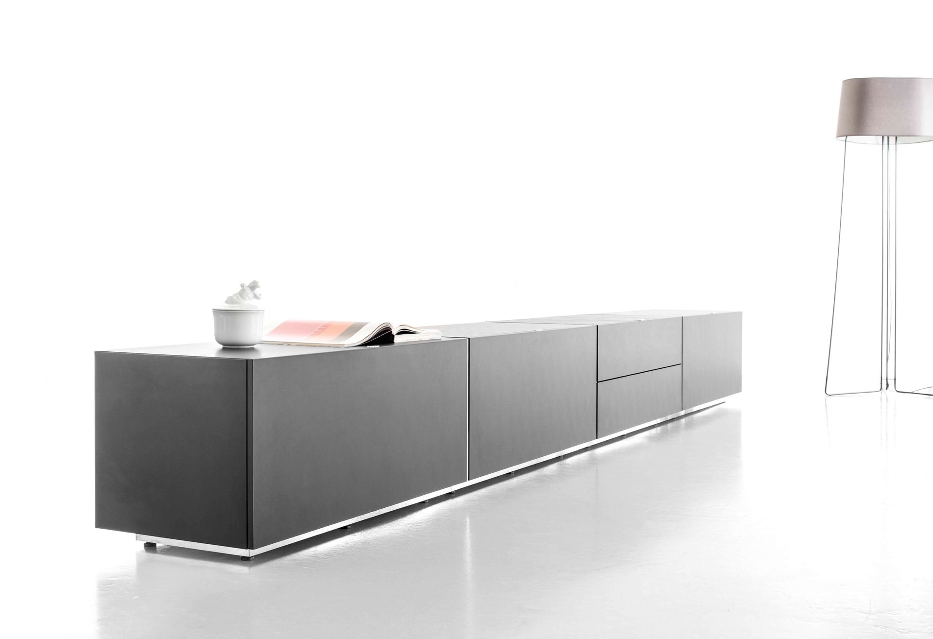 Shelf and lowboard can be configured into one unit or combined separately. You can endlessly line up the elements, which are available with flap or drawers, and stack them on top of each other. The connection of the types is made with a slim stainless steel profile.
