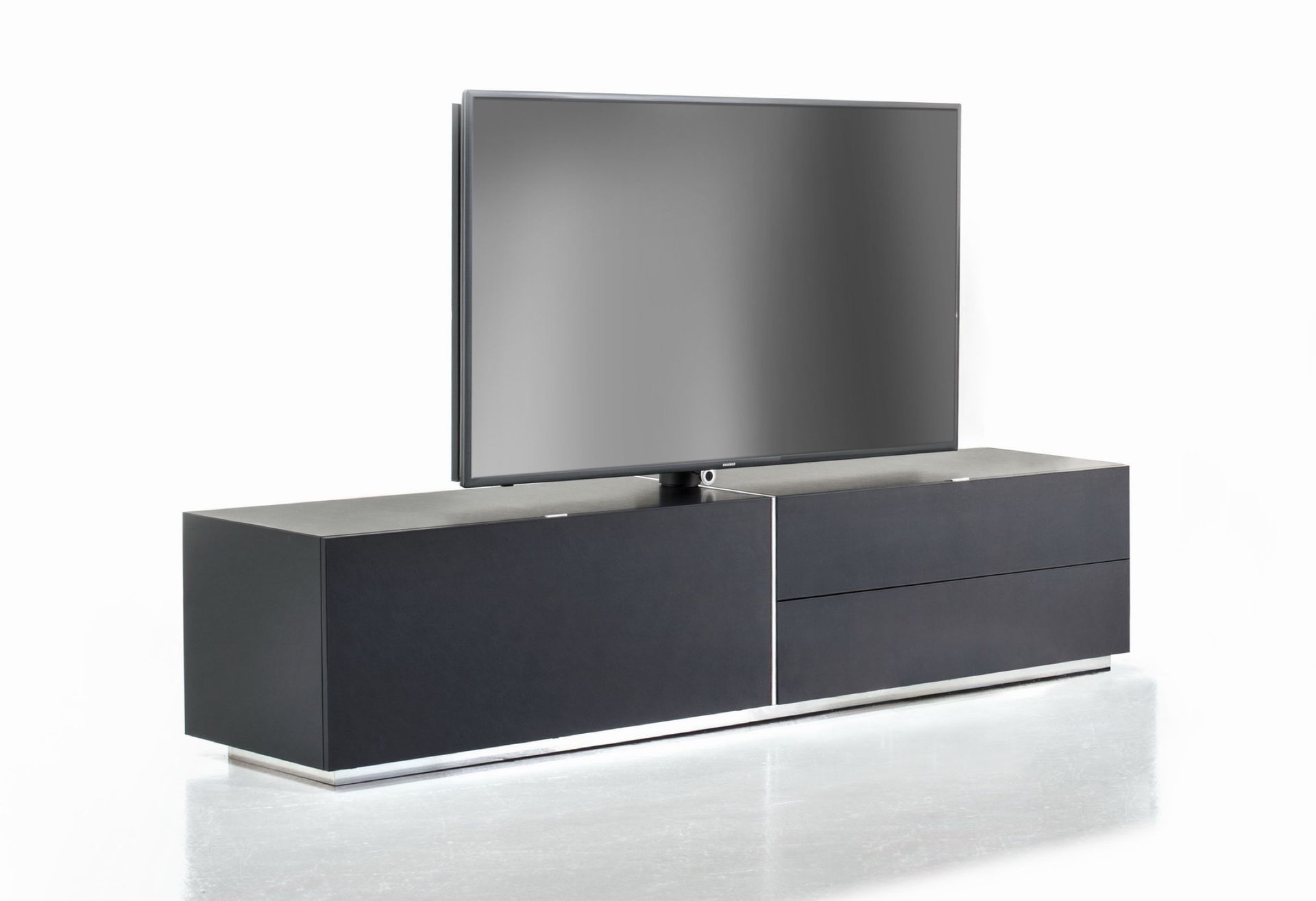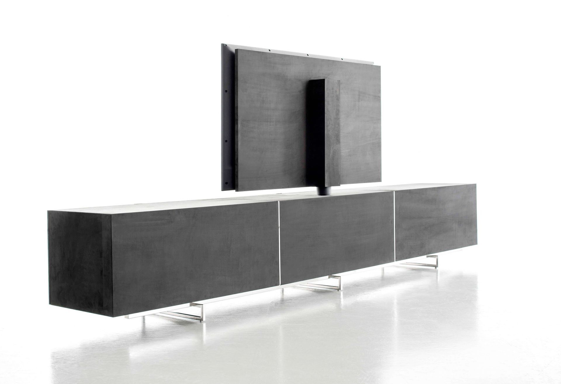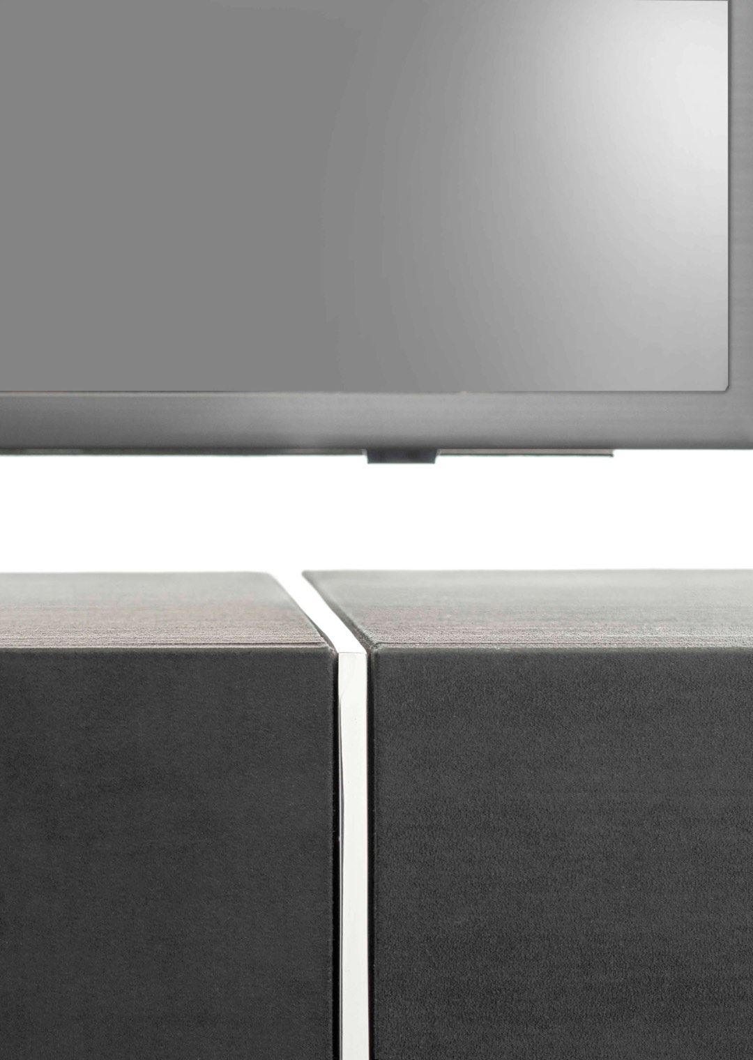 Like the Magic Matrix shelving system, this lowboard offers endless combination possibilities and functions. A storage carcass in widths of 73 and 98 cm is the basis for this system. You can endlessly line up the elements and stack them on top of each other. The surface is made of leather and is manufactured with a special folding technique. Thus, even the back of the lowboard is finished in visible quality and the furniture is also ideal as a room divider especially since the types can be combined so that the opening is on different sides. Whether lowboard, sideboard or highboard, all combinations are possible. For the lowboard, which is used as a TV solution, there is a TV holder that can be rotated 270 degrees, with back panel, bracket and infrared repeater. Cable channels provide a hassle-free and invisible cable routing.