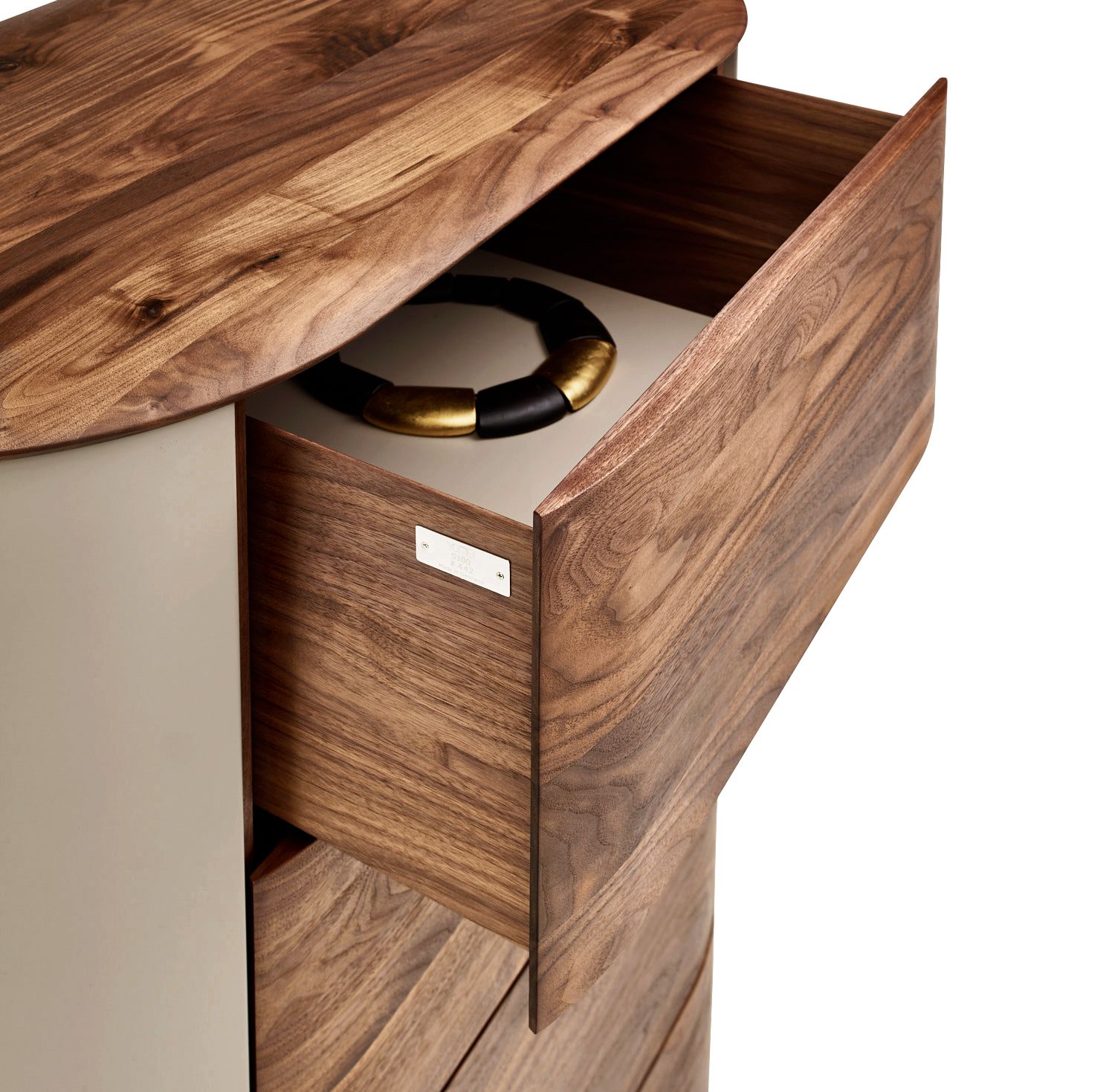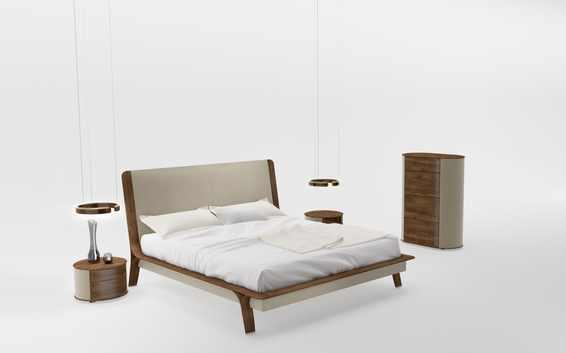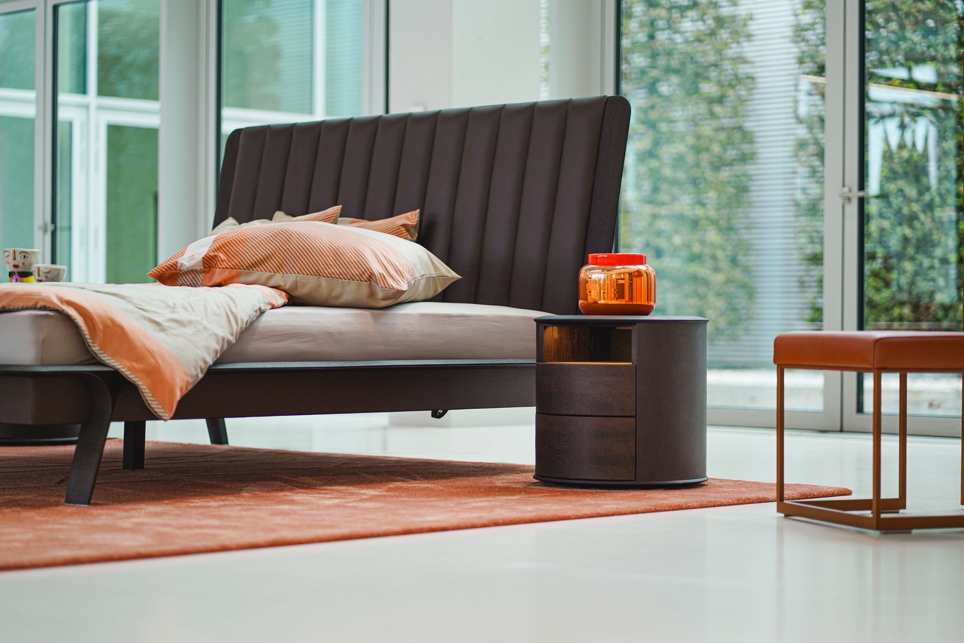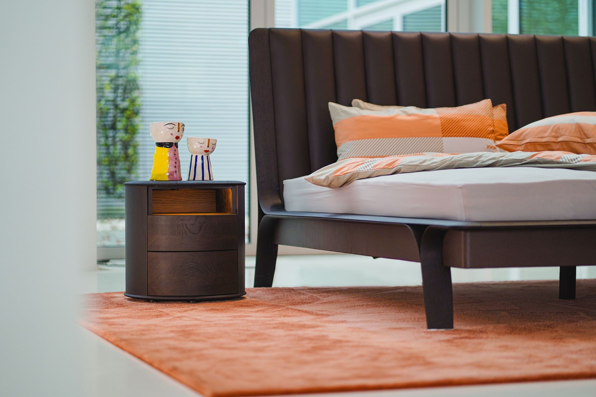 The bedside tables and chests of our S100 series are true space charmers. Elegant cylinders made of solid wood and leather, which adapt to individual wishes through 3 different heights.
