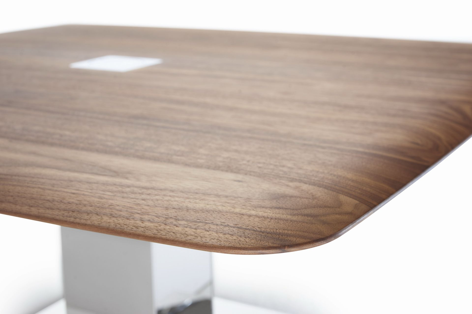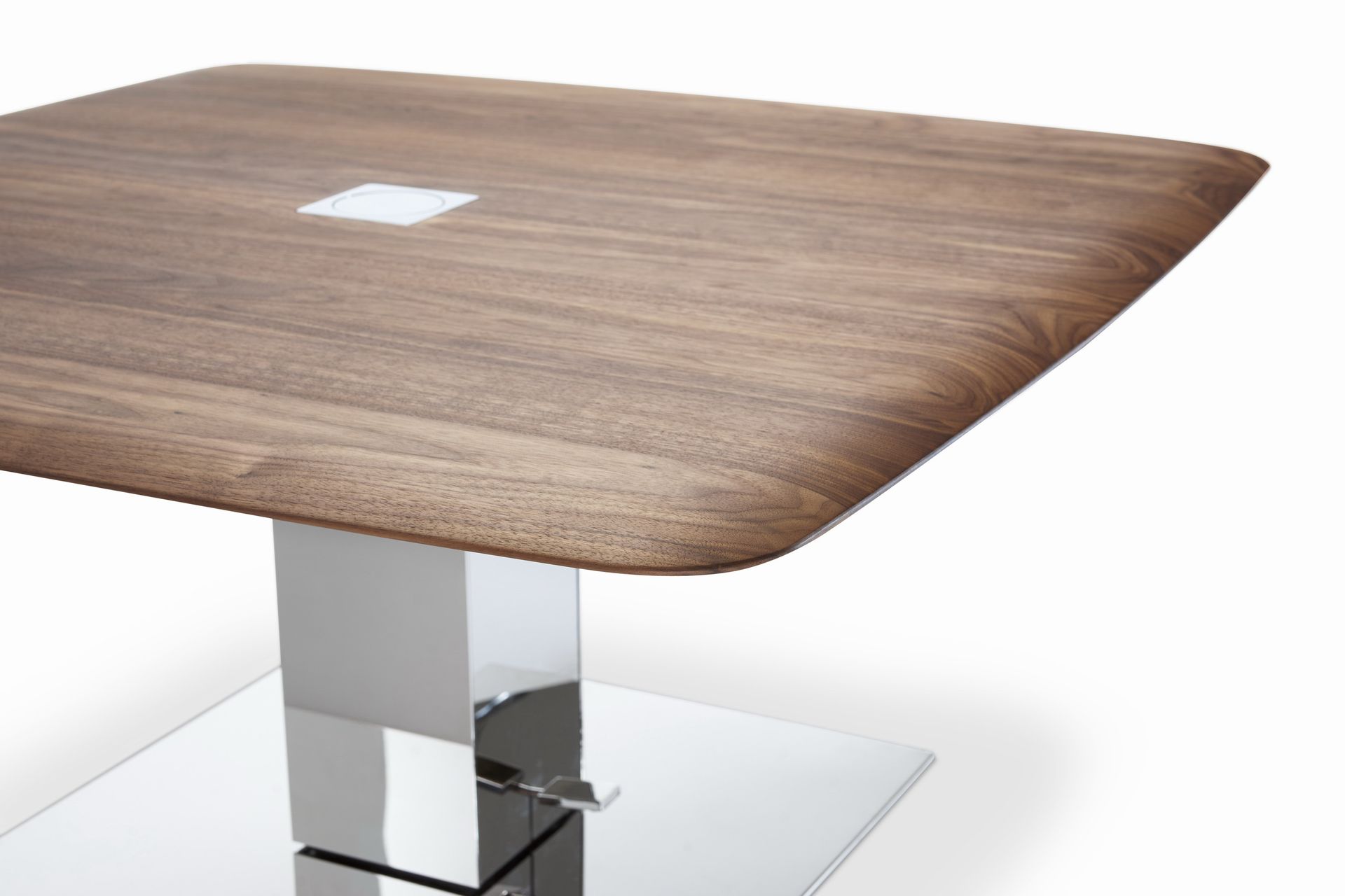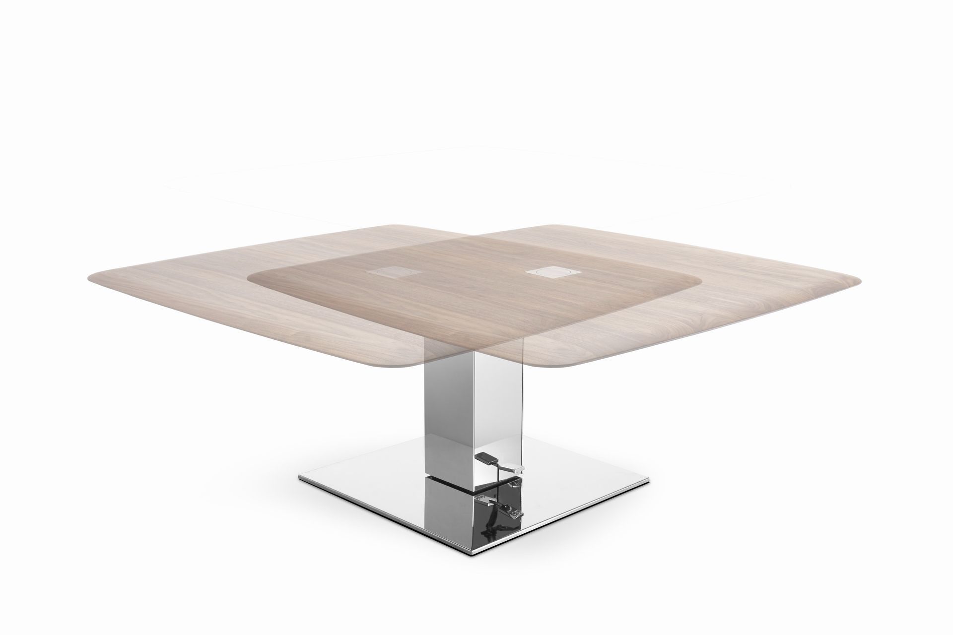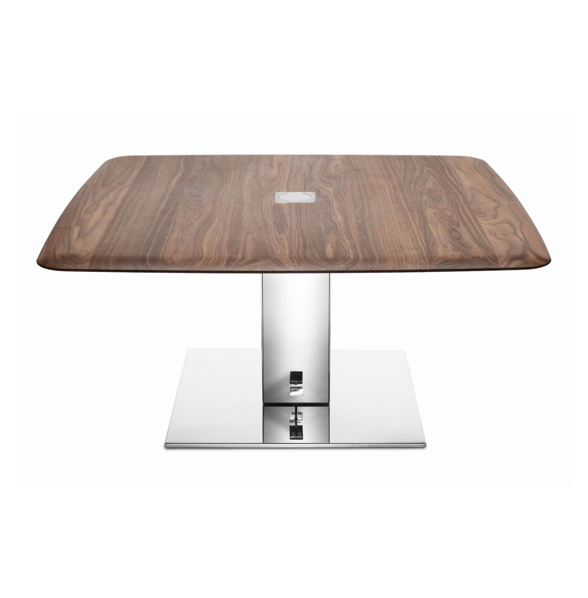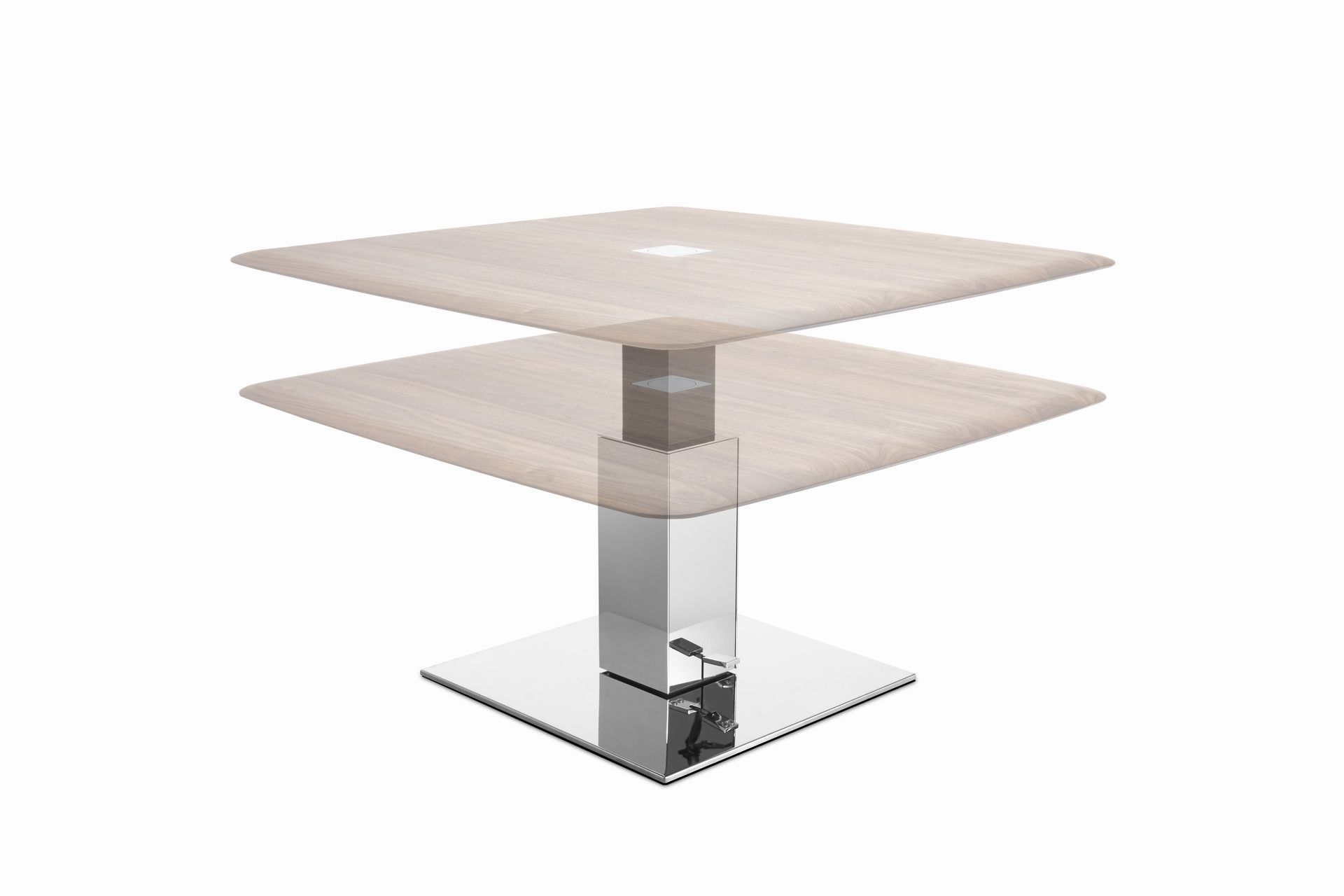 The table top of the coffee table in a size of 100 x 100 cm is adjustable in height from 48 to 68 cm and can be moved in all directions by 30 cm. The characteristic feature of the table top is the soft lines of the table top.