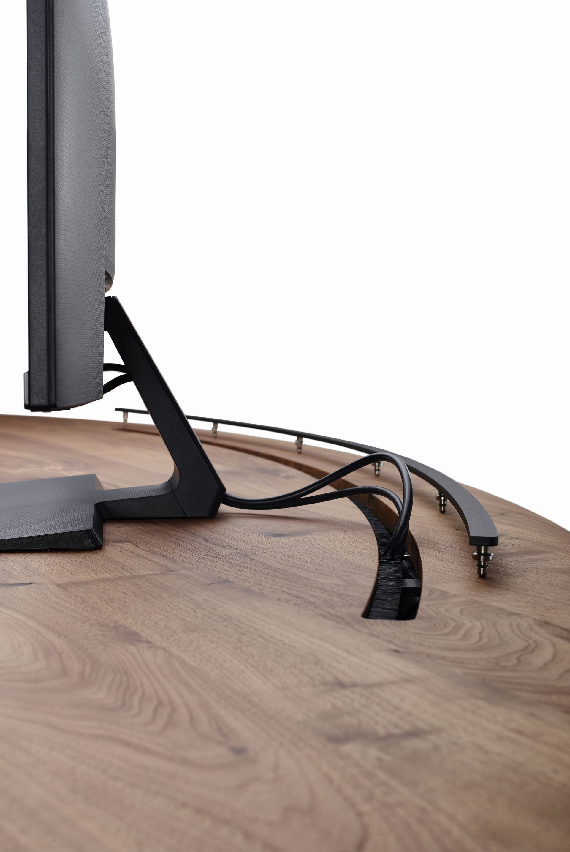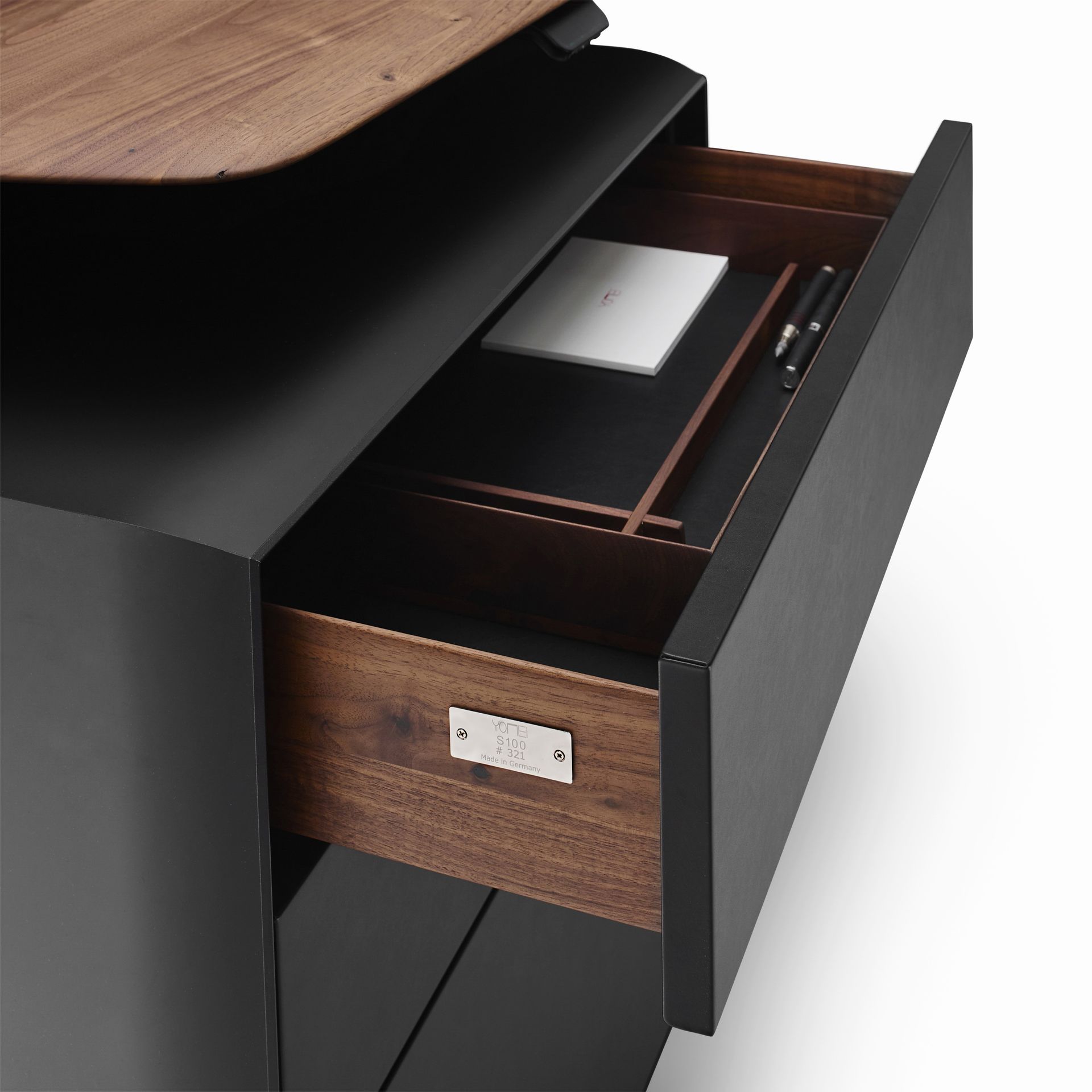 The S100 Desk is a true all-rounder in terms of design. Whether with a curved or rectangular tabletop, it fits into any workspace. The desk tops with all-round soft profile can be aligned on the matching desk container either on the left or right side. Electrical supply lines and sockets are already installed under the tabletop and avoid unnecessary cable chaos.