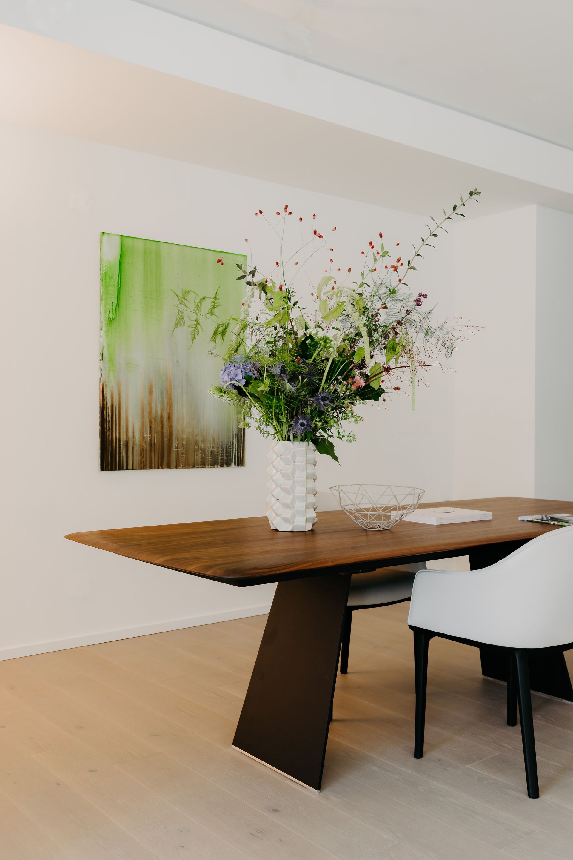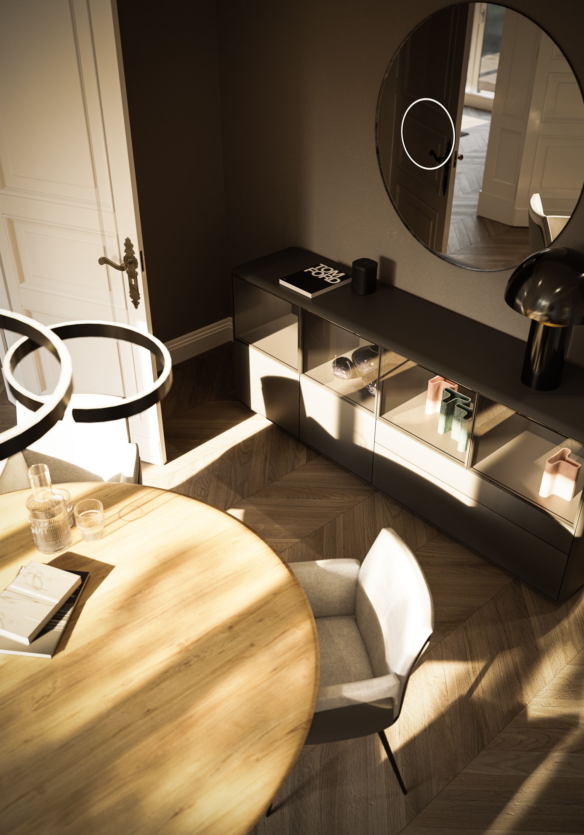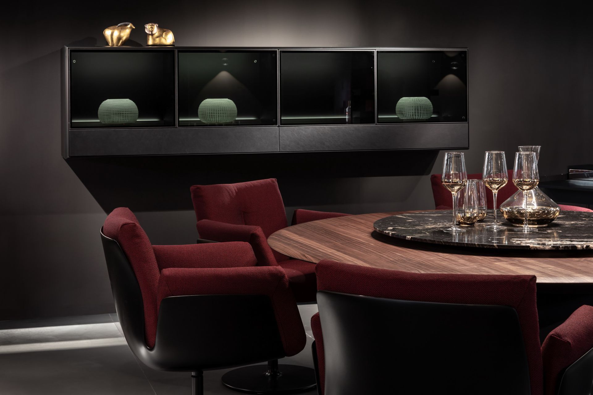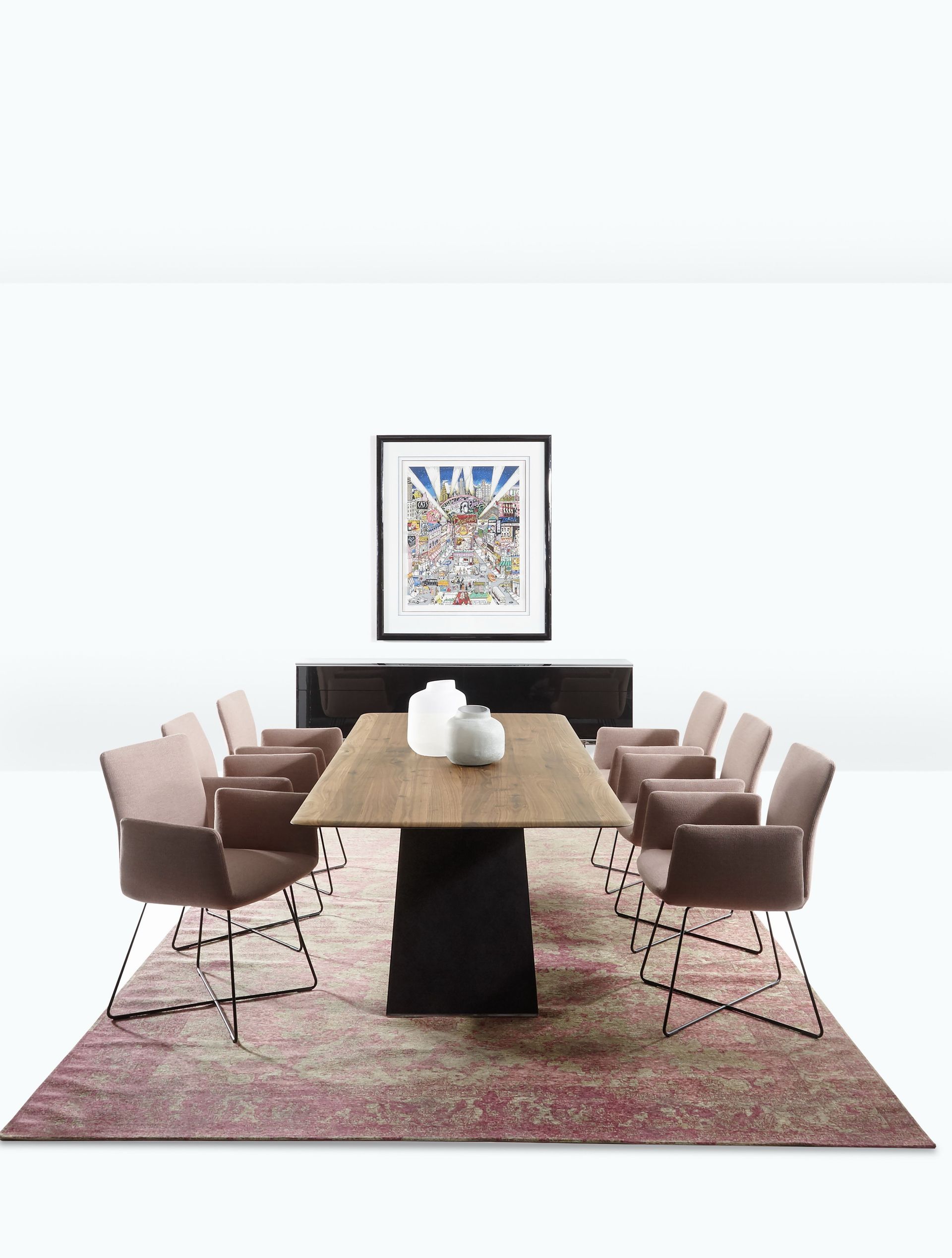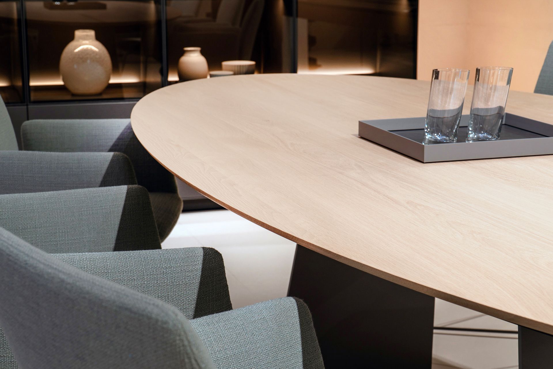The S100 range is rounded off by the beautifully designed dining table. The characteristic feature of the table top is its soft lines. The all-round rounded edge integrates perfectly into the design concept and is also a haptic delight.