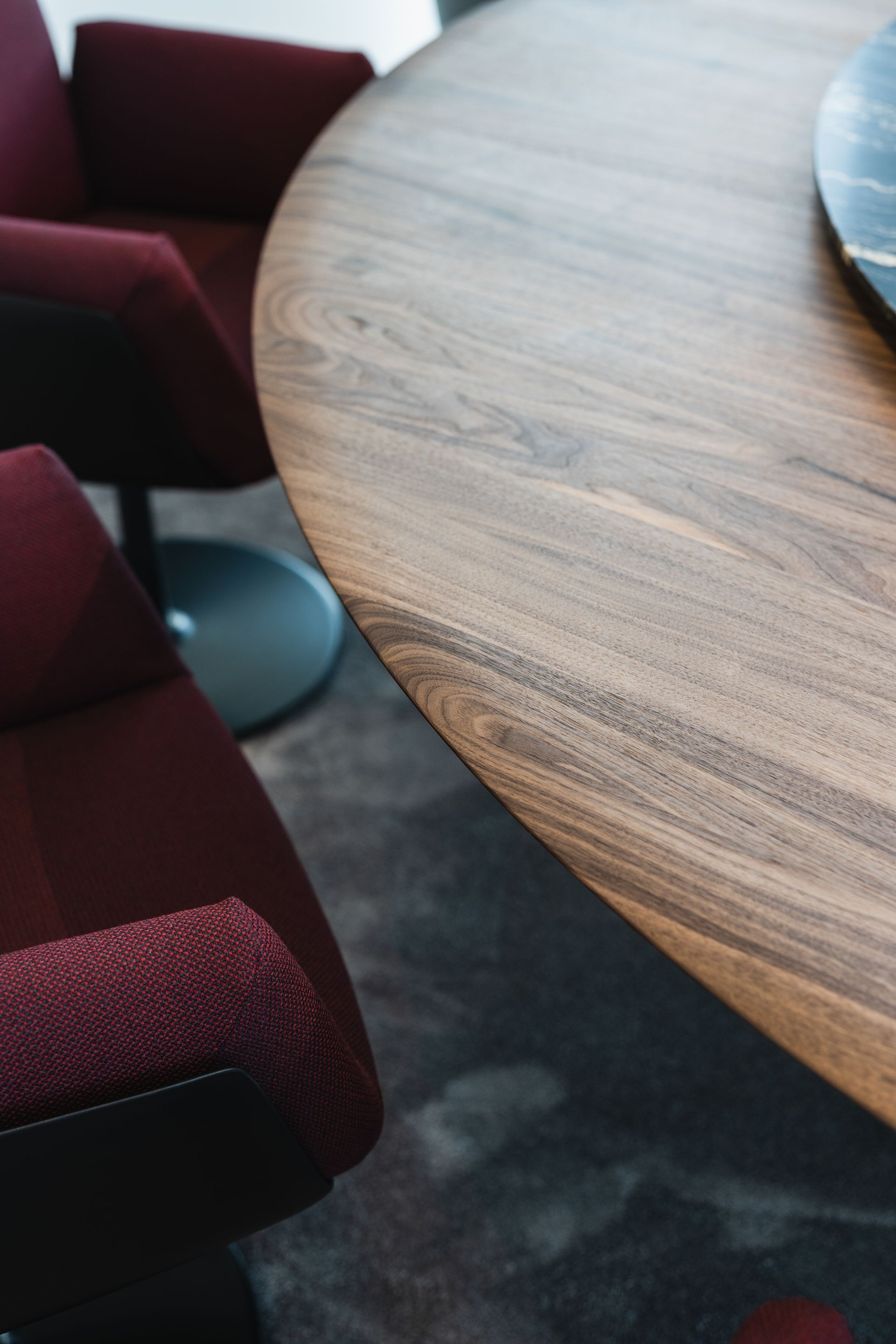 The S100 dining table is available in either fine walnut or maple. Available in round and square. The metal cheeks of the base are powder coated.