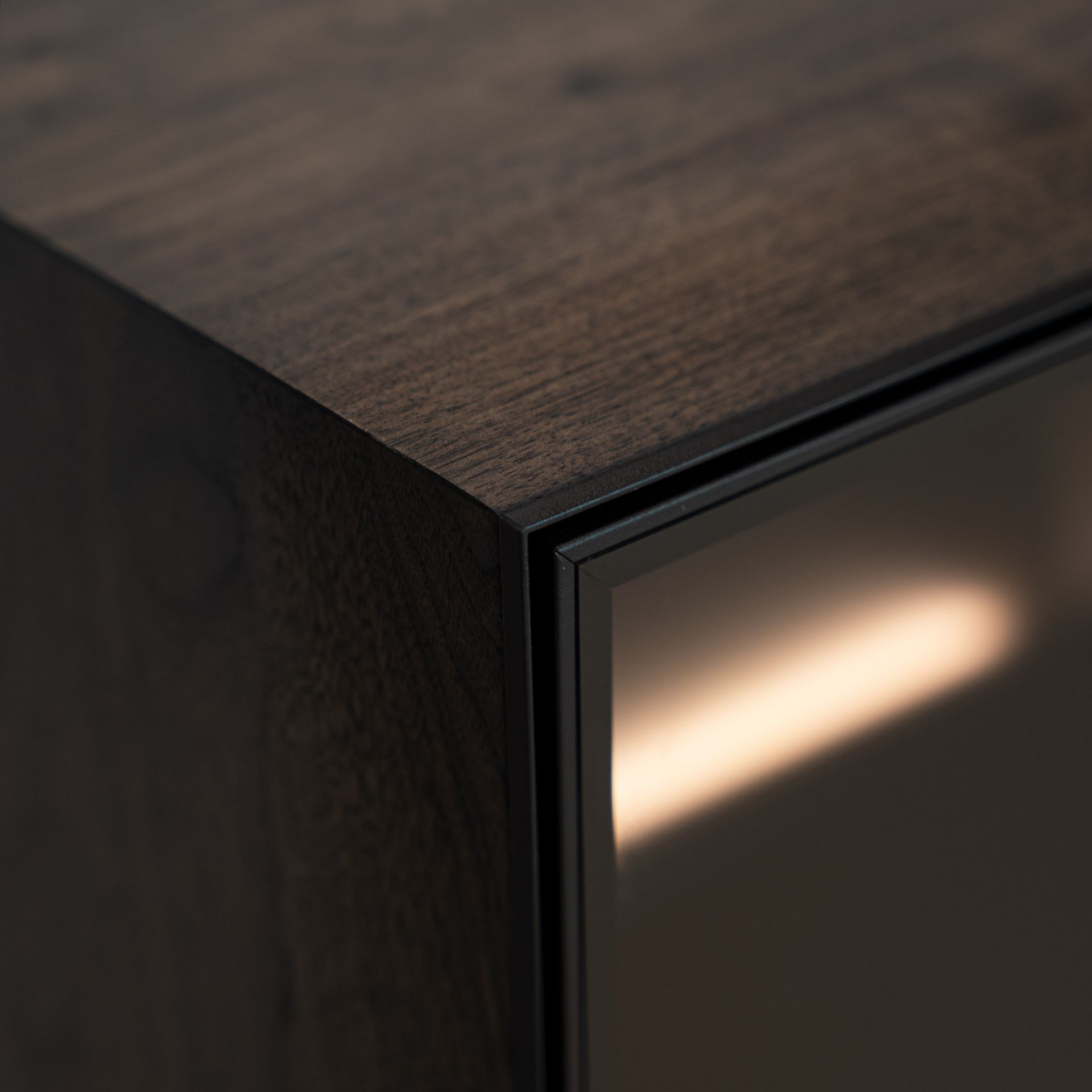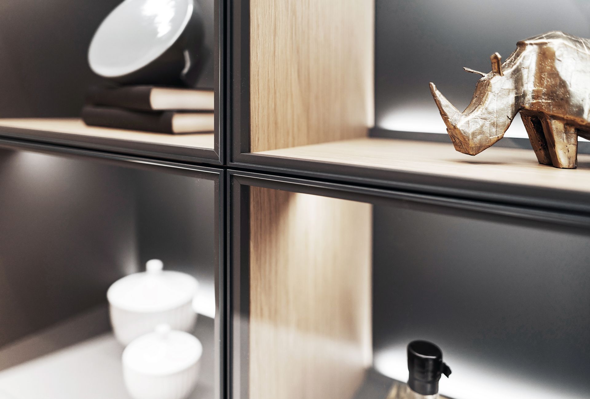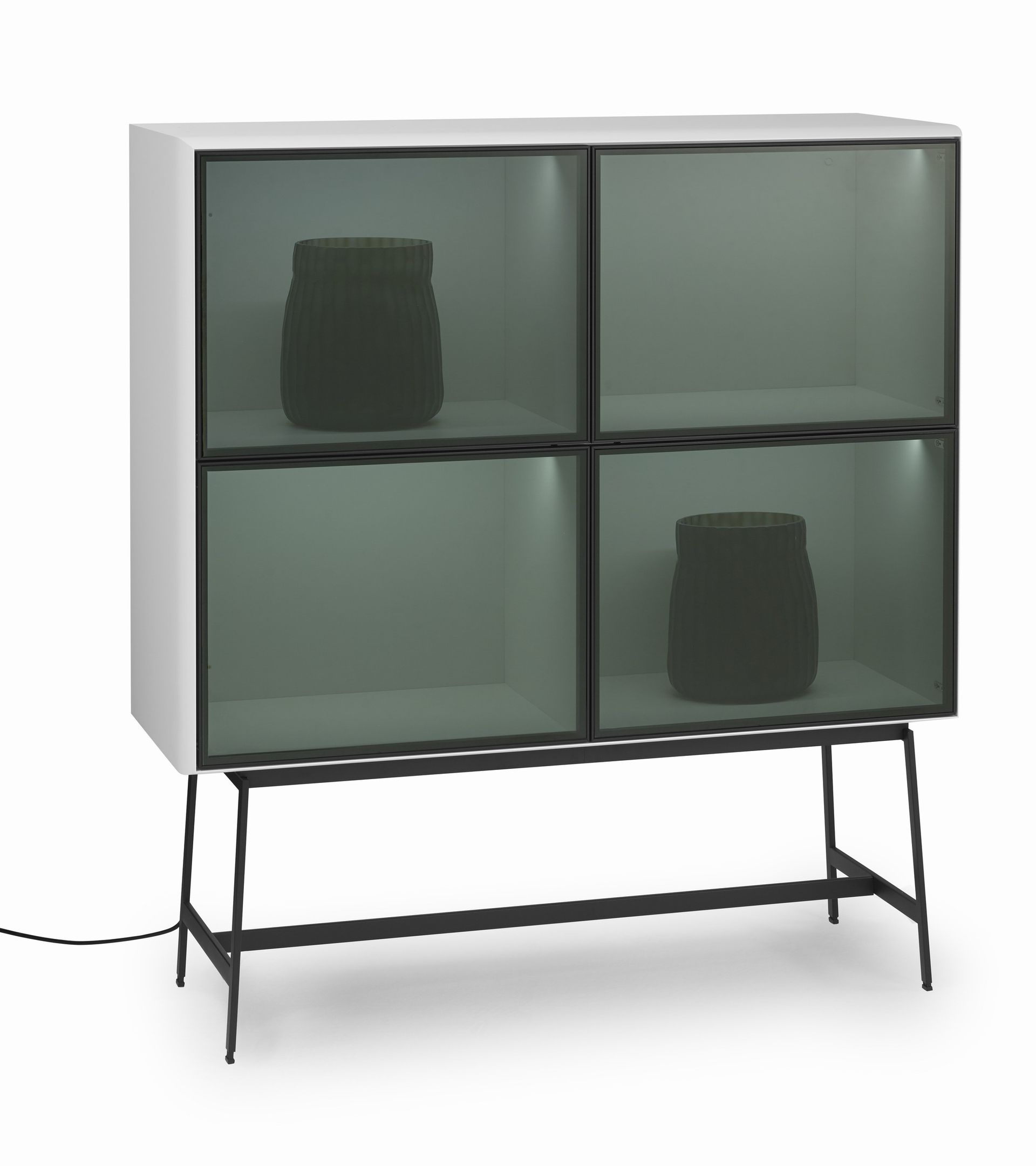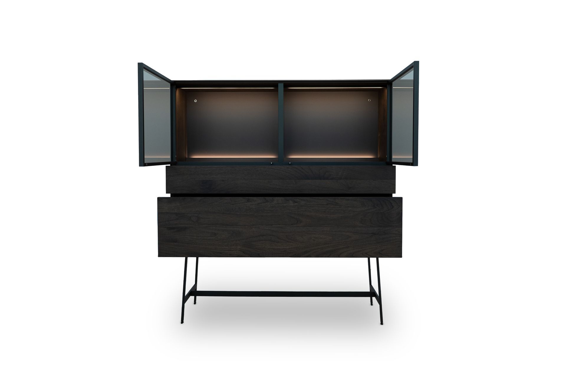 The solitaire display case offer individually suitable variation options for different uses. Four glass-framed doors offer space for the presentation of favorite pieces, two glass-framed doors and two drawers or two hinged doors as an exciting combination of showcase and storage space.