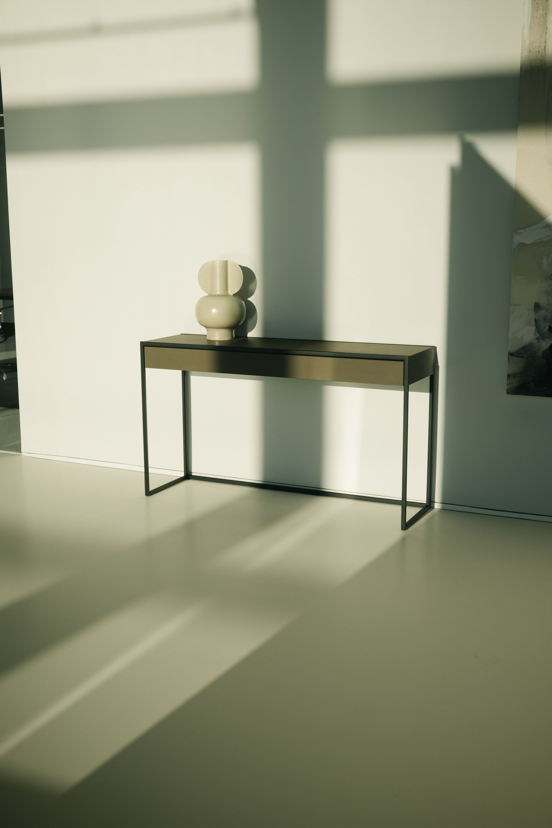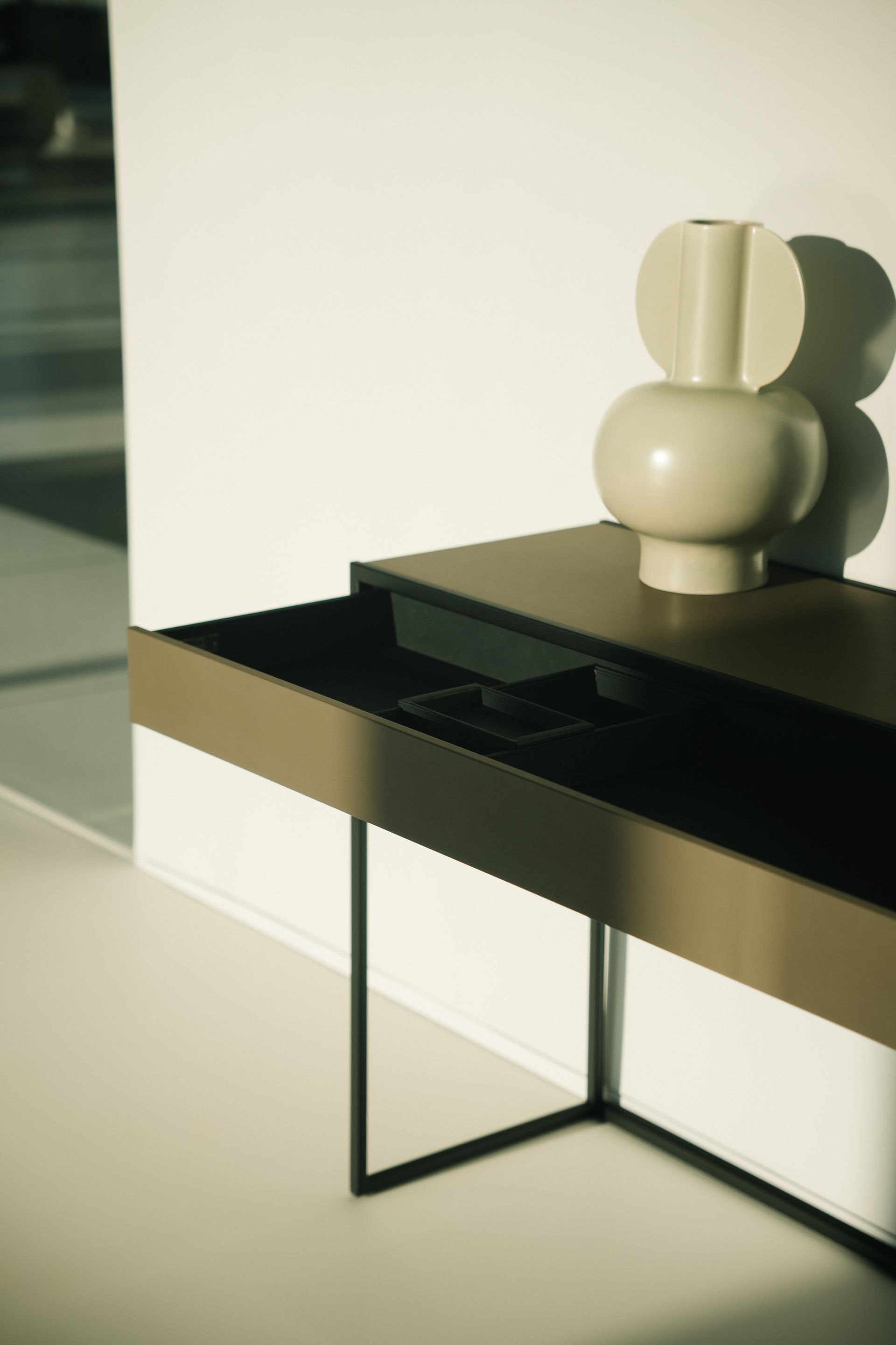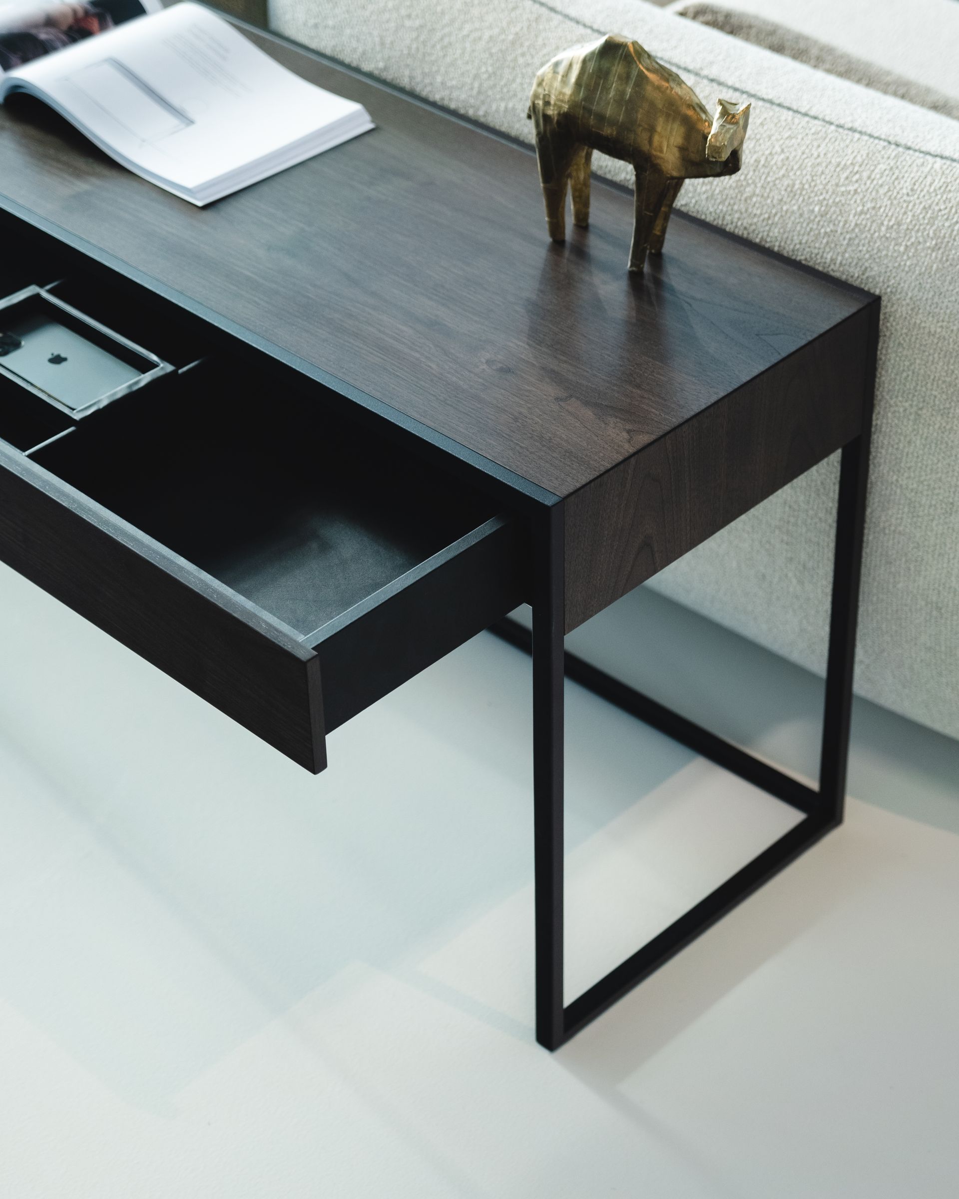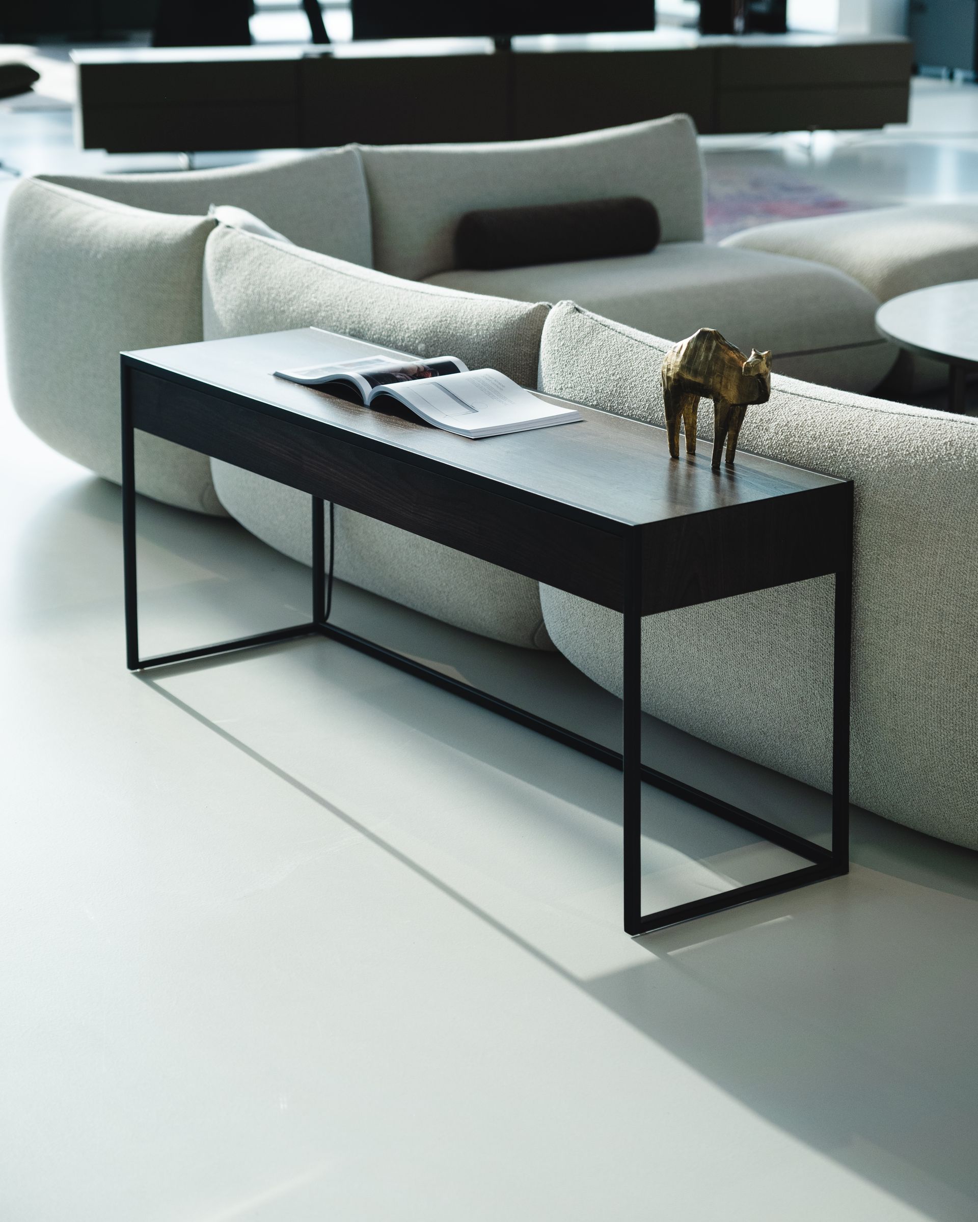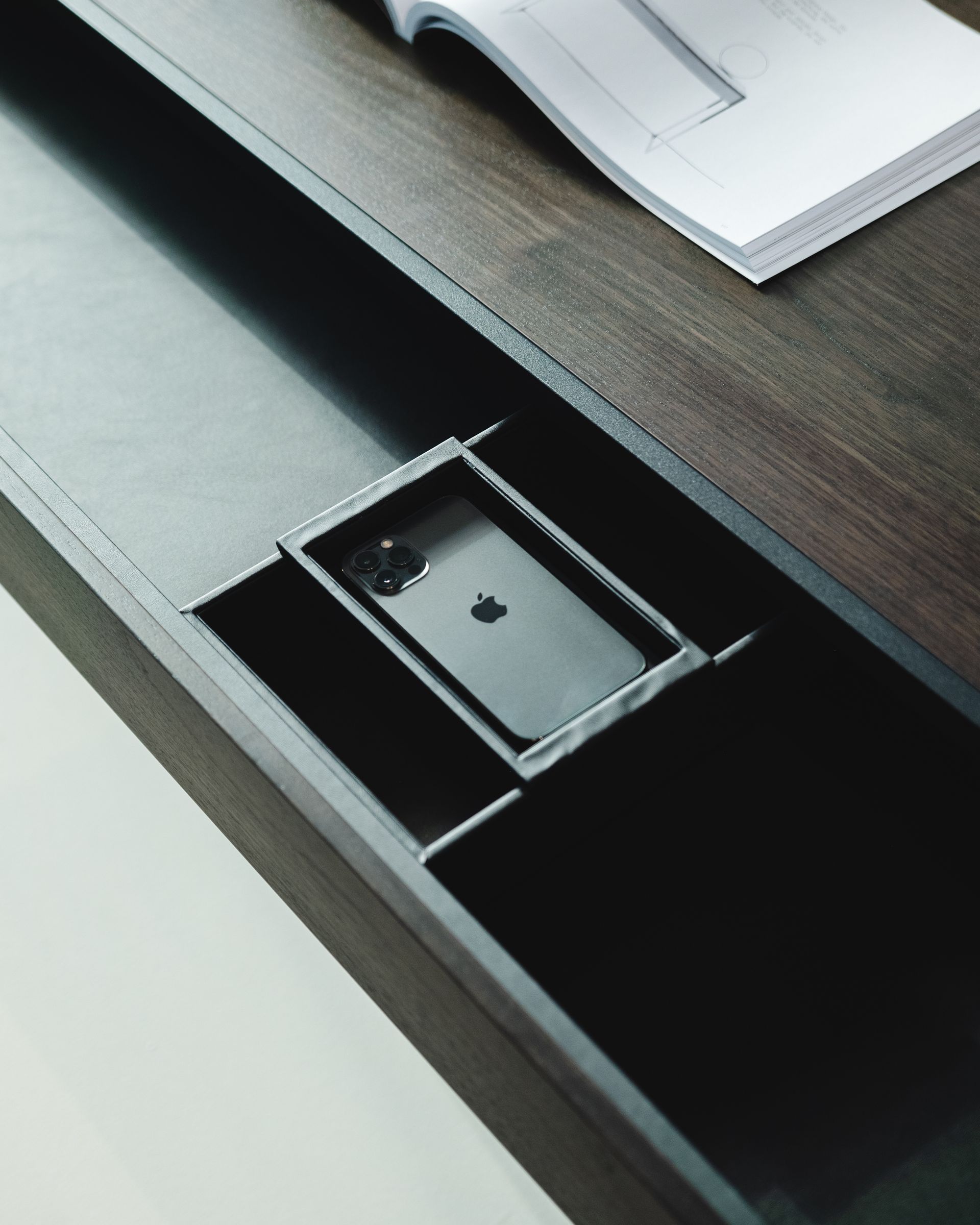 The SMART console was the outstanding new product presented by Yomei at imm cologne 2012. Externally, it offers the usual straightforward and delicate design that connoisseurs are accustomed to from Yomei. But the surprise, the real highlight of this novelty, is hidden inside the console. A spacious drawer with plenty of storage space and a variable internal drawer turns out to be an ideal storage system. Even the devices that are located on the console can be "energized".