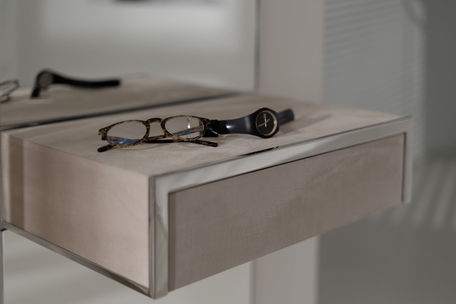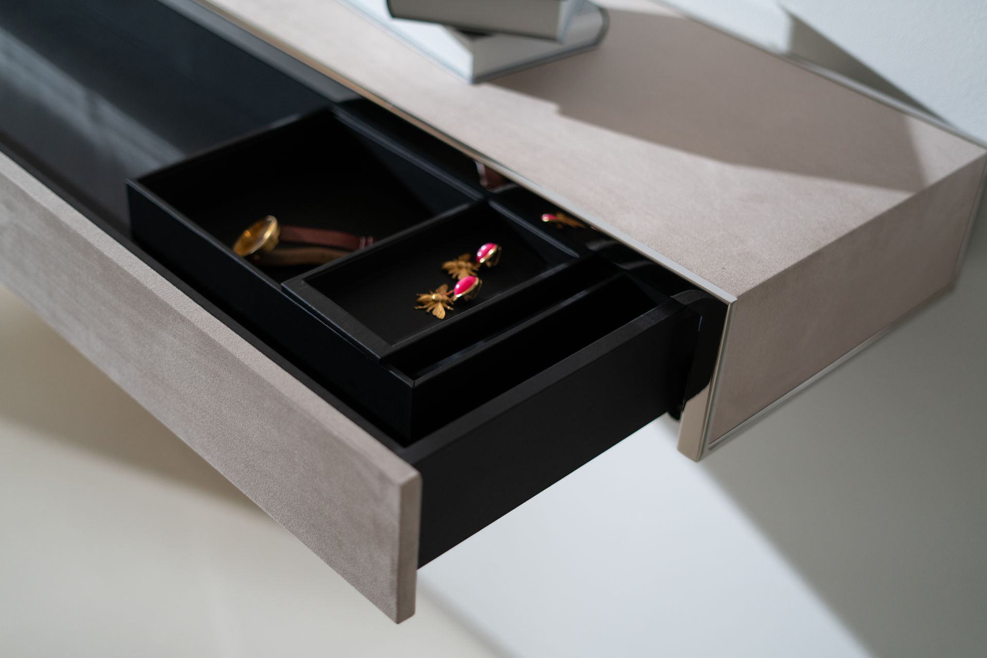 Cell phone, tablet, keys as well as popular accessories find their place in the generous drawer with movable utensil box. Bedded on velvet, everything has its order here.