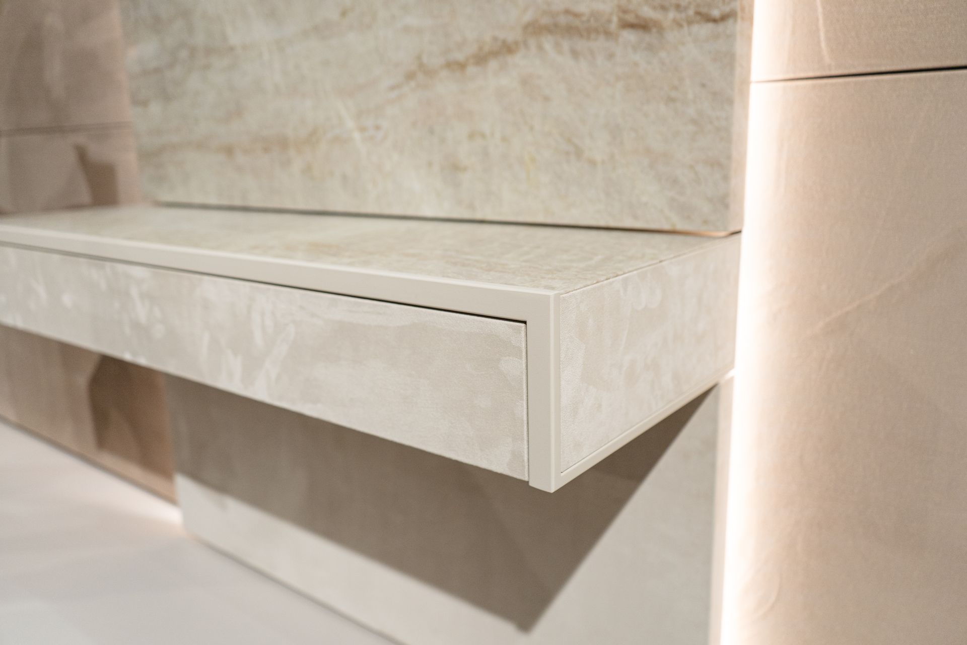 The highlight: A 3-way power socket can be installed in the drawer and under the console. This means that mobile devices can be charged - both in and lying on the console; as well as wirelessly thanks to Qi-Loading, the invisible cabling that runs through the metal frame. The large selection of colors and materials also fulfills many individual wishes.