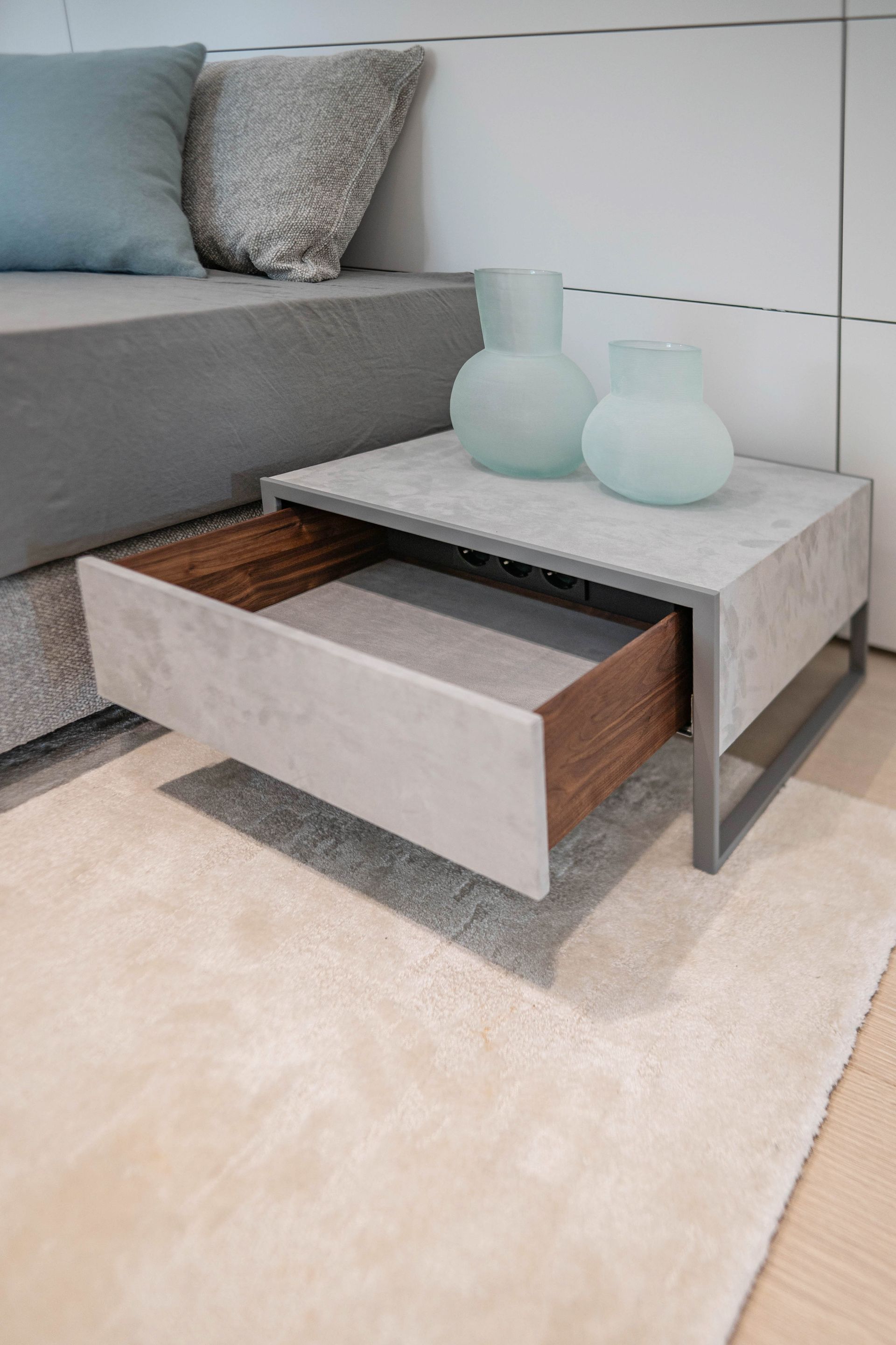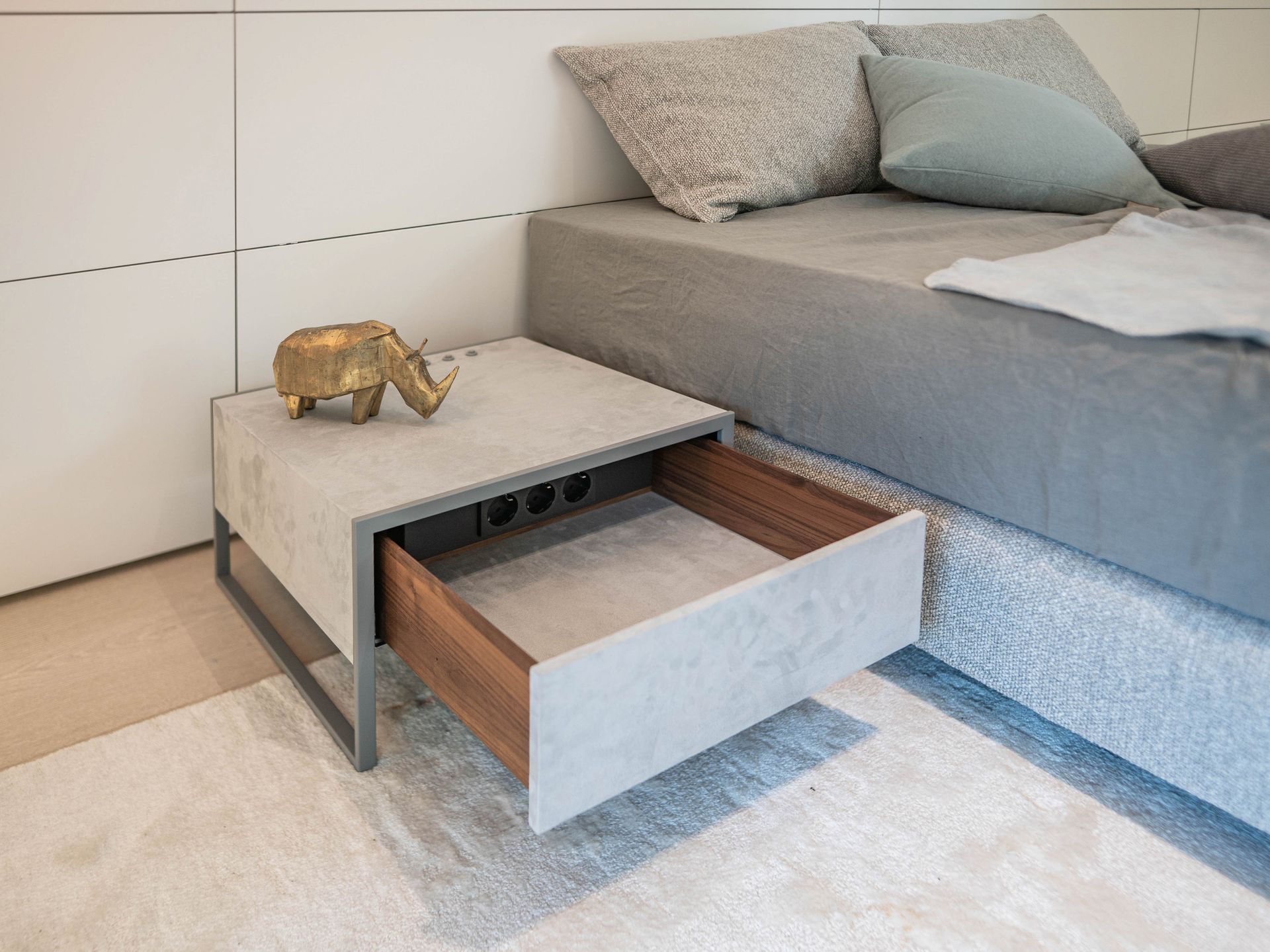 The bedside cabinets in 5 different heights (30, 40, 50, 60 and 70 cm), 2 different widths (50 and 70 cm) and the choice between 1, 2 or 3 drawers leave nothing to be desired. As an additional highlight, the innovative power supply for your devices with a 3-way socket in the drawer or at the back of the chest of drawers will also be available as an option for these cabinets. This way, cell phones and tablets can be conveniently charged overnight and the light on the nightstand is also supplied with power.
