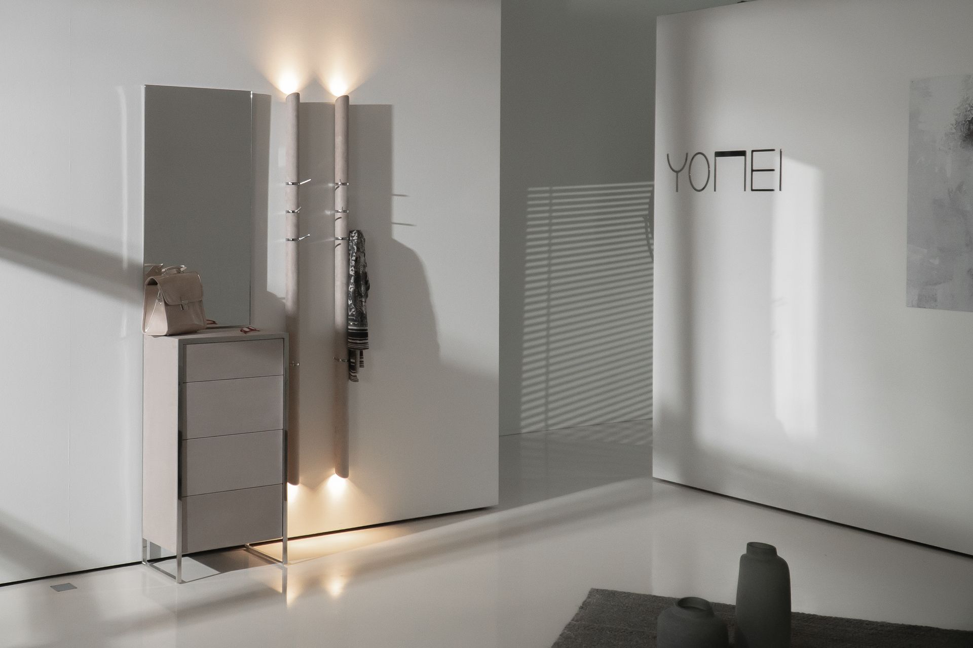 With 4 integrated rotating coat hooks made of polished stainless steel or optionally painted in color. As usual, form and function go hand in hand with this Yomei product. The question of a new designer coat rack may already be settled. Now it remains to be decided what color the leather or micro-leather cover should be. A warm nougat brown or a clear gray? There are many possibilities, about 14 to be exact. We will be happy to advise you.